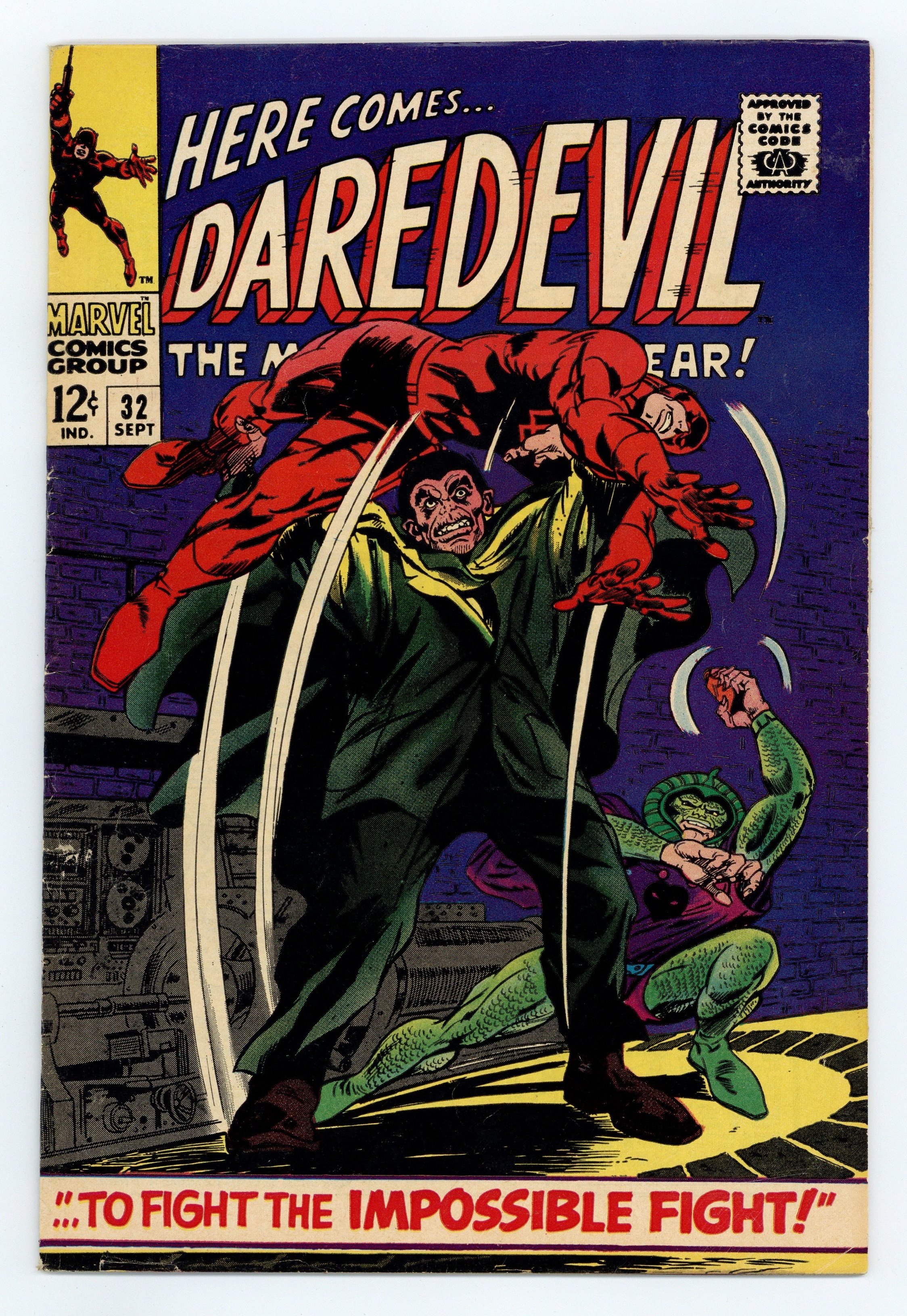 Cover pencils by Gene Colan, inks by John Tartaglione. To Fight the Impossible Fight, script by Stan Lee, pencils by Gene Colan, inks by John Tartaglione; Still truly blind, DD is captured by Cobra and Hyde and taken to their hideout where he desperately tries to find an antidote to restore his powers before the gruesome twosome finish him off. 36 pgs. Cover price $0.12. Cover price $0.12.