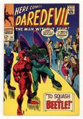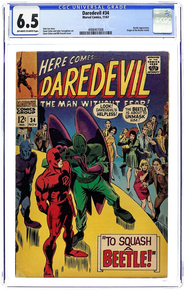 Tags: Marvel Legacy Numbering: Daredevil (part 34), Daredevil$19.50Cover pencils by Gene Colan, inks by Bill Everett. To Squash a Beetle!, script by Stan Lee, pencils by Gene Colan, inks by John Tartaglione; Captured by the Beetle, DD must survive an unmasking attempt in front of a crowd of expo attendees; origin of the Beetle; Mike Murdock appearance. 32 pgs. Cover price $0.12. Cover price $0.12.