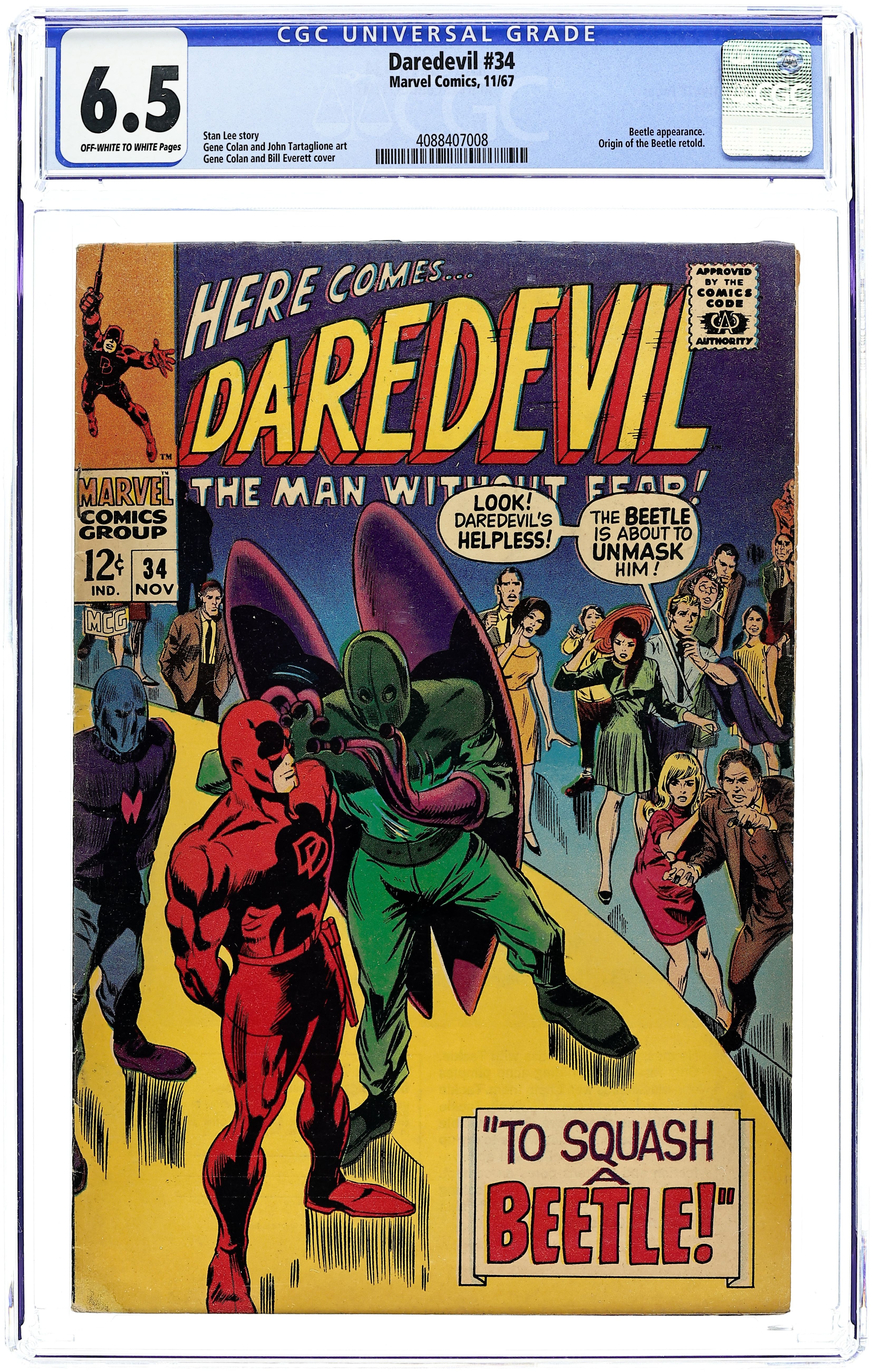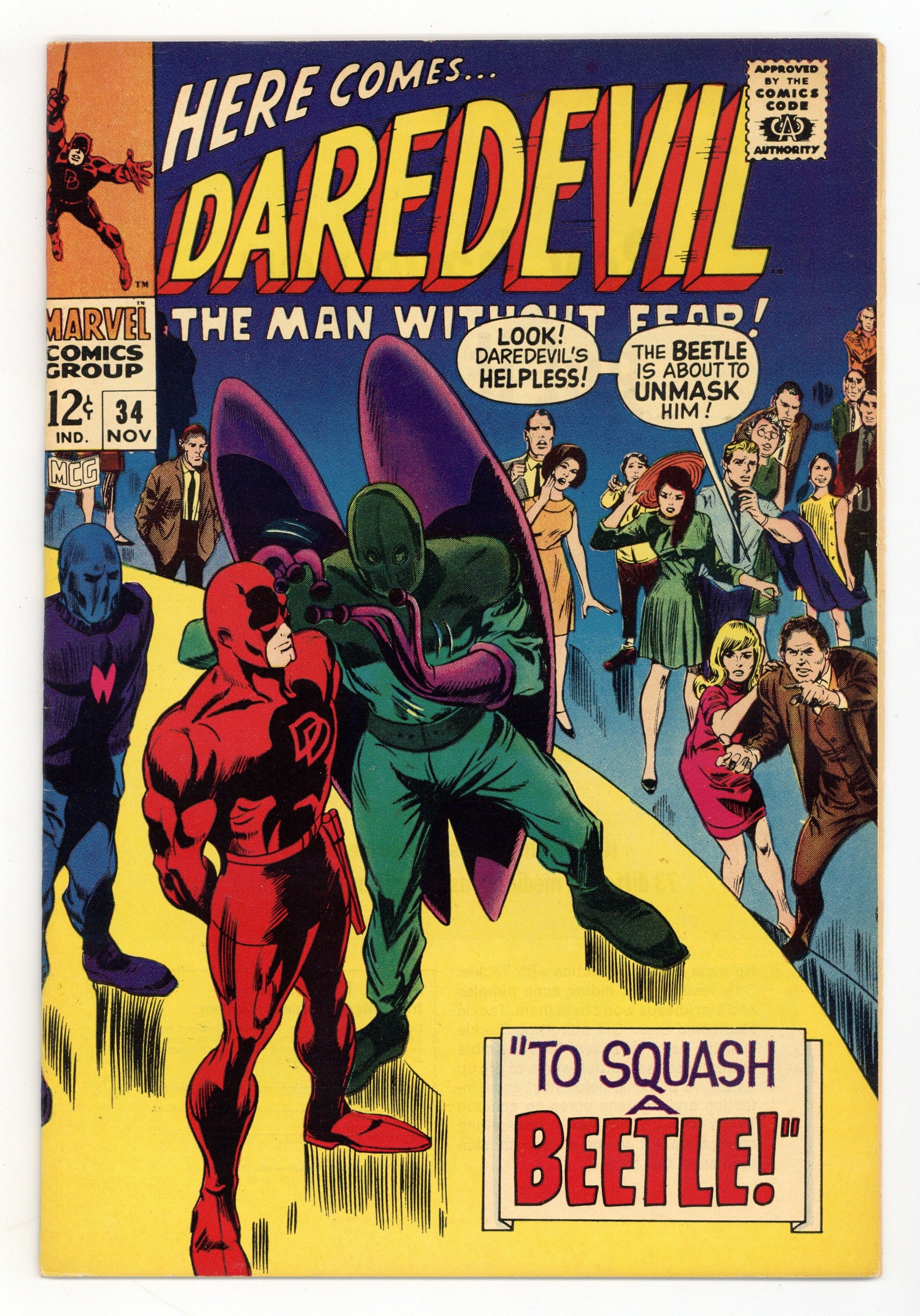 Cover pencils by Gene Colan, inks by Bill Everett. To Squash a Beetle!, script by Stan Lee, pencils by Gene Colan, inks by John Tartaglione; Captured by the Beetle, DD must survive an unmasking attempt in front of a crowd of expo attendees; origin of the Beetle; Mike Murdock appearance. 32 pgs. Cover price $0.12. Cover price $0.12.
