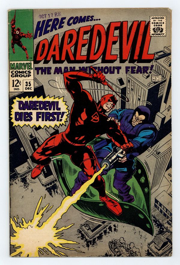 Tags: Marvel Legacy Numbering: Daredevil (part 35), Daredevil$13.25Cover pencils by Gene Colan, inks by John Tartaglione. Daredevil Dies First!, script by Stan Lee, pencils by Gene Colan, inks by Bill Everett; Trapster seeks legal advice from Nelson and Murdock on the penalty for murdering Daredevil; After a pitched battle with D.D. in which the villain believes the hero vanquished, Trapster heads to the Baxter Building to take on the F.F. but finds Invisible Girl the only one home. 36 pgs. Cover price $0.12. Cover price $0.12.