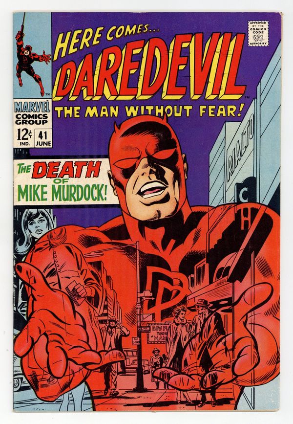 Tags: Marvel Legacy Numbering: Daredevil (part 41), Daredevil$14.00Cover pencils by Gene Colan, inks by Frank Giacoia. The Death of Mike Murdock, script by Stan Lee, pencils by Gene Colan, inks by John Tartaglione; Daredevil returns from the time displacement limbo just in time to save Foggy from the Exterminator and the Unholy Three while killing off his Mike Murdock alter-ego in the process; appearances by the Ape Man, Bird Man, and Cat Man. Letter to the editor from writer Peter Sanderson. 36 pgs. Cover price $0.12. Cover price $0.12.