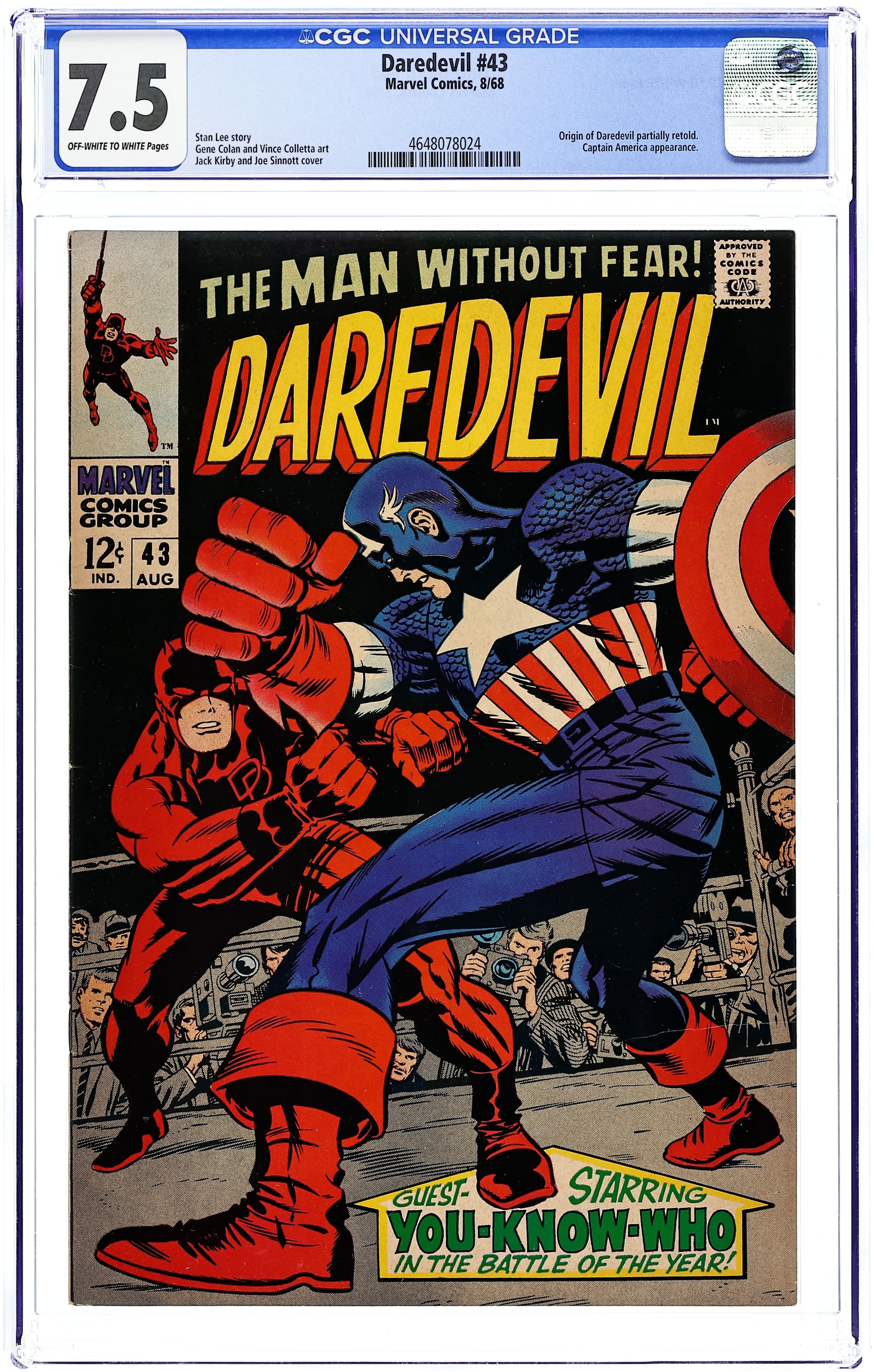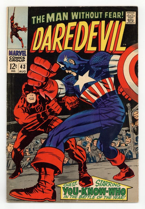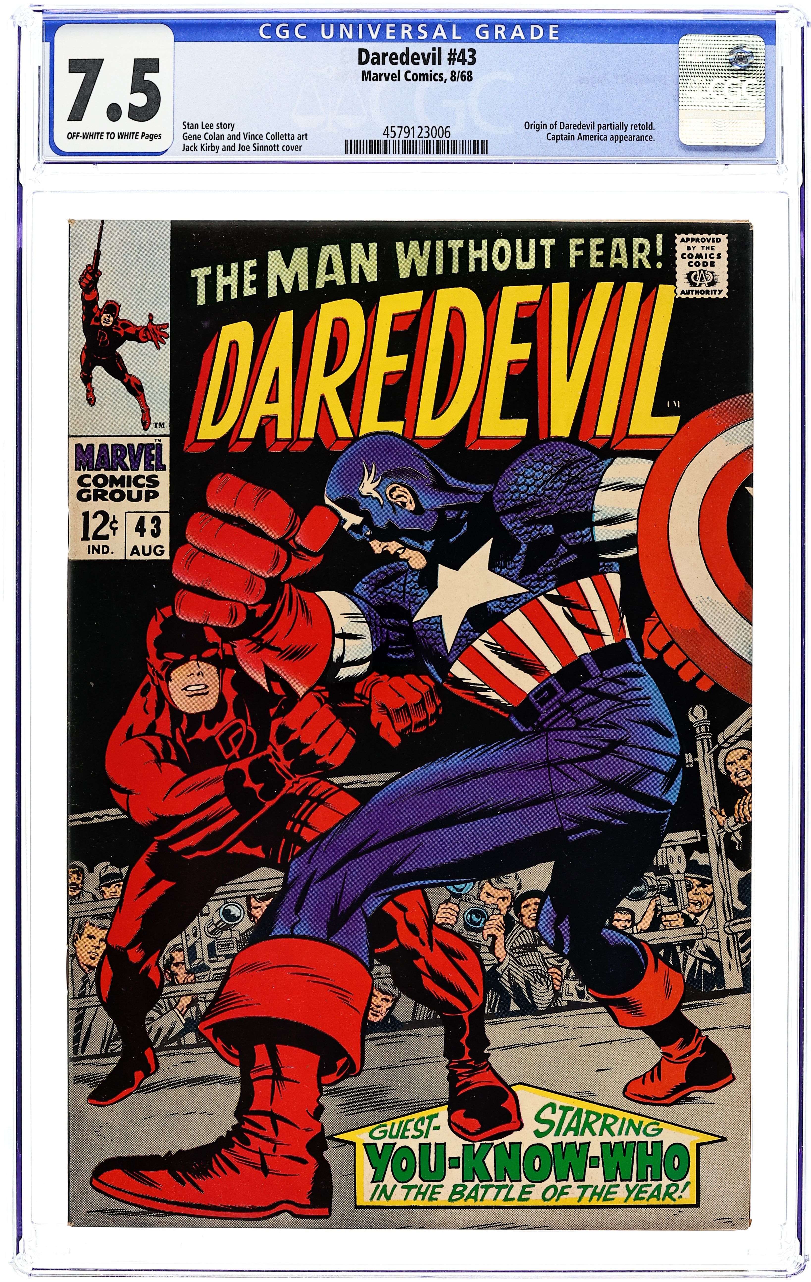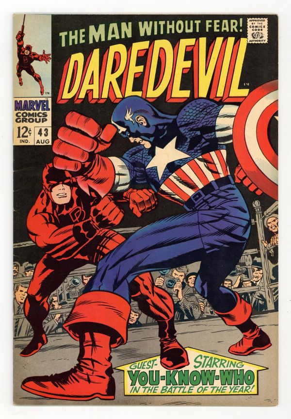 Cover pencils by Jack Kirby, inks by Joe Sinnott. In Combat With Captain America!, script by Stan Lee, pencils by Gene Colan, inks by Vince Colletta; Busted up over his breakup with Karen, DD takes it out on Captain America during a charity event. 36 pgs; Daredevil's origin retold. 36 pgs. Cover price $0.12. Cover price $0.12.