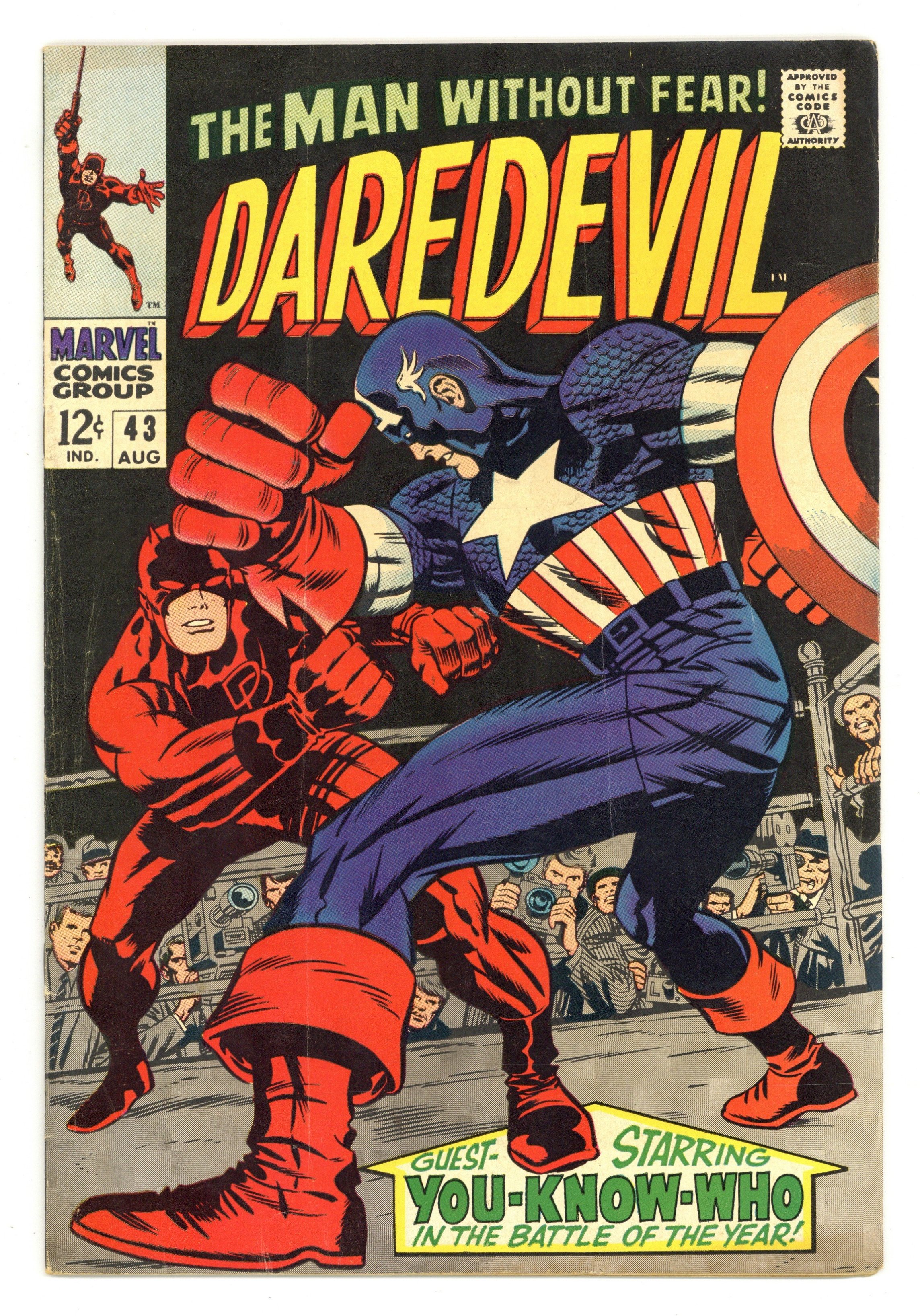 Tags: Marvel Legacy Numbering: Daredevil (part 43), Daredevil$35.00Cover pencils by Jack Kirby, inks by Joe Sinnott. In Combat With Captain America!, script by Stan Lee, pencils by Gene Colan, inks by Vince Colletta; Busted up over his breakup with Karen, DD takes it out on Captain America during a charity event. 36 pgs; Daredevil's origin retold. 36 pgs. Cover price $0.12. Cover price $0.12.
