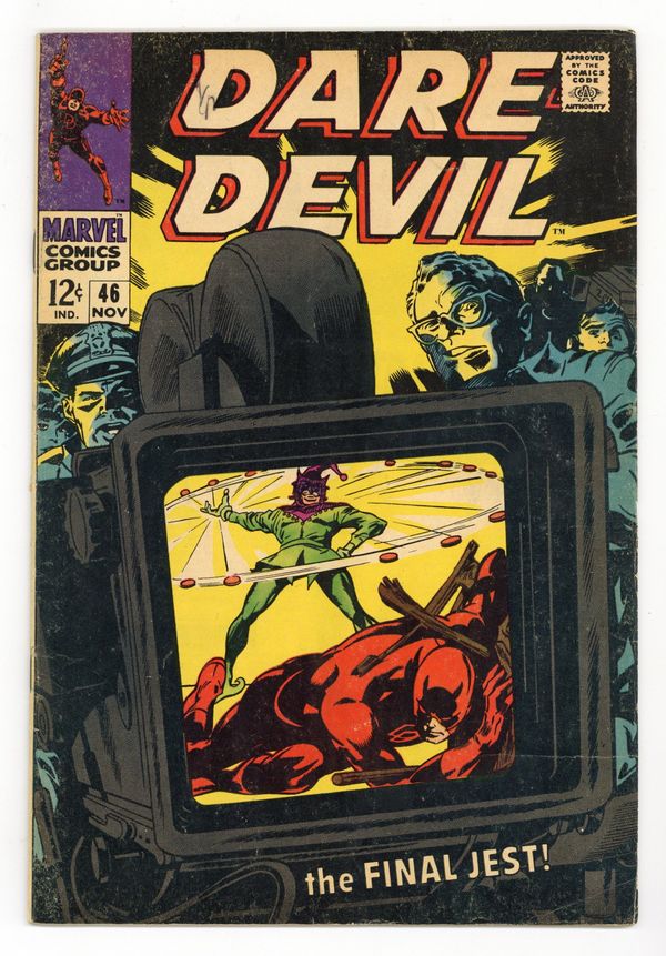 Tags: Marvel Legacy Numbering: Daredevil (part 46), Daredevil$7.49Cover pencils by Gene Colan, inks by George Klein. The Final Jest, script by Stan Lee, pencils by Gene Colan, inks by George Klein; Daredevil has to break out of jail to clear his name of a trumped up murder charge; Once old hornhead figures out the Jester set the whole thing up, he dresses as the Jester and appears on Carson to draw out the crime clown; Jester and DD battle as the plot concludes on live TV; Johnny Carson cameo. 32 pgs. Cover price $0.12. Cover price $0.12.