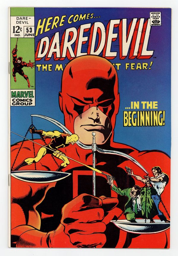 Last 12-cent issue. Cover pencils by Gene Colan, inks by George Klein. As It Was In the Beginning starring Daredevil (origin retold, w/ Stan Lee's original dialogue from issue #1), Battling Jack Murdock (flashback), Foggy Nelson (flashback), Karen Page (flashback), The Fixer (flashback), and Slade (flashback), script by Roy Thomas and Stan Lee, pencils by Gene Colan, inks by George Klein; Daredevil thinks back on his origins. 36 pgs. Cover price $0.12. Cover price $0.12.