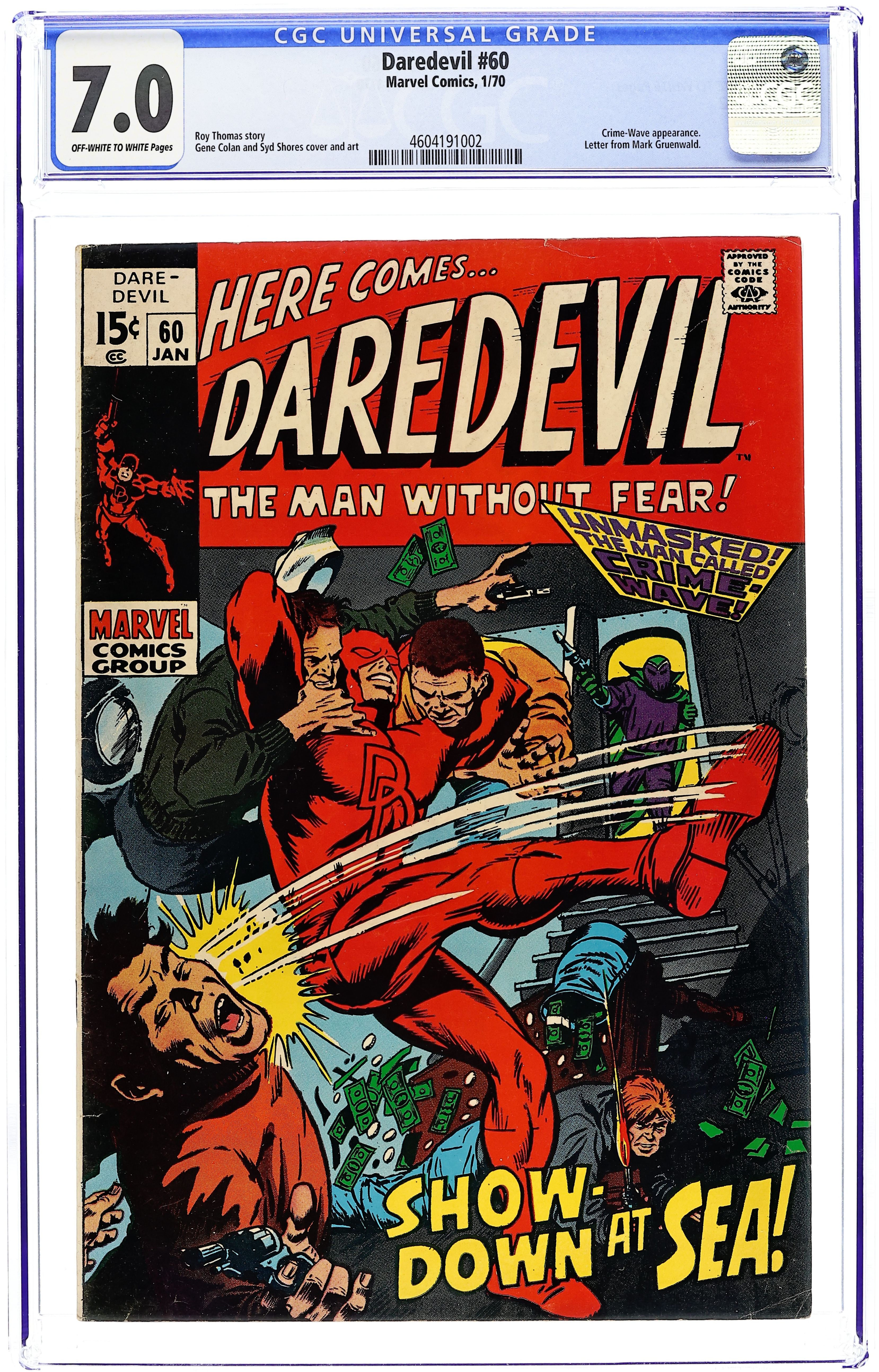 Cover pencils by Gene Colan, inks by Syd Shores. Showdown At Sea, script by Roy Thomas, pencils by Gene Colan, inks by Syd Shores; DD infiltrates Crime-Wave's lair, battles his thugs, and along with Foggy and Debbie helps to unmask him in Scooby-Doo type fashion. Letters to the editor from comics writers Martin Pasko and Mark Gruenwald. 36 pgs. Cover price $0.15. Cover price $0.15.