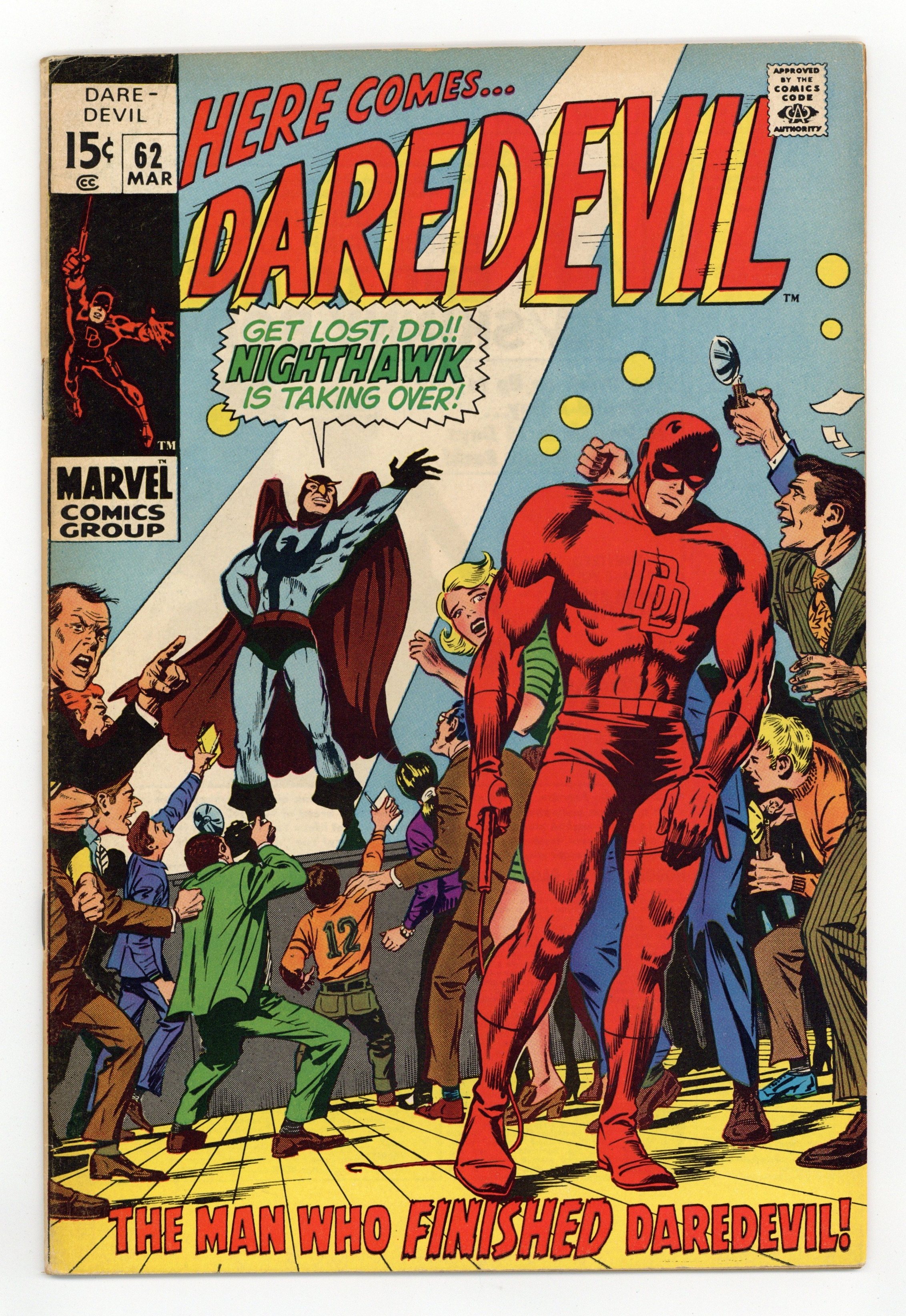 Ends Dec 8 7:58 PM CST Bid History 8 bids Current Bid $101 Your Secret Max Bid If you'd like to bid, please log in or register. Cover pencils by Marie Severin, inks by Syd Shores. Quoth the Nighthawk, "Nevermore!" starring Daredevil, Nighthawk (Origin), Foggy Nelson, Karen Page, Jo-Jo, and Weepin' Willie, script by Roy Thomas, pencils by Gene Colan, inks by Syd Shores; Daredevil is upstaged by the new hero in town who is only in the game for the glory; cameo flashback with Captain America, Namor, the Sub-Mariner, and Grand Master. The letters page contains a statement of ownership--average print run 418,160; average paid circulation 245,422. 36 pgs. Cover price $0.15. Cover price $0.15.