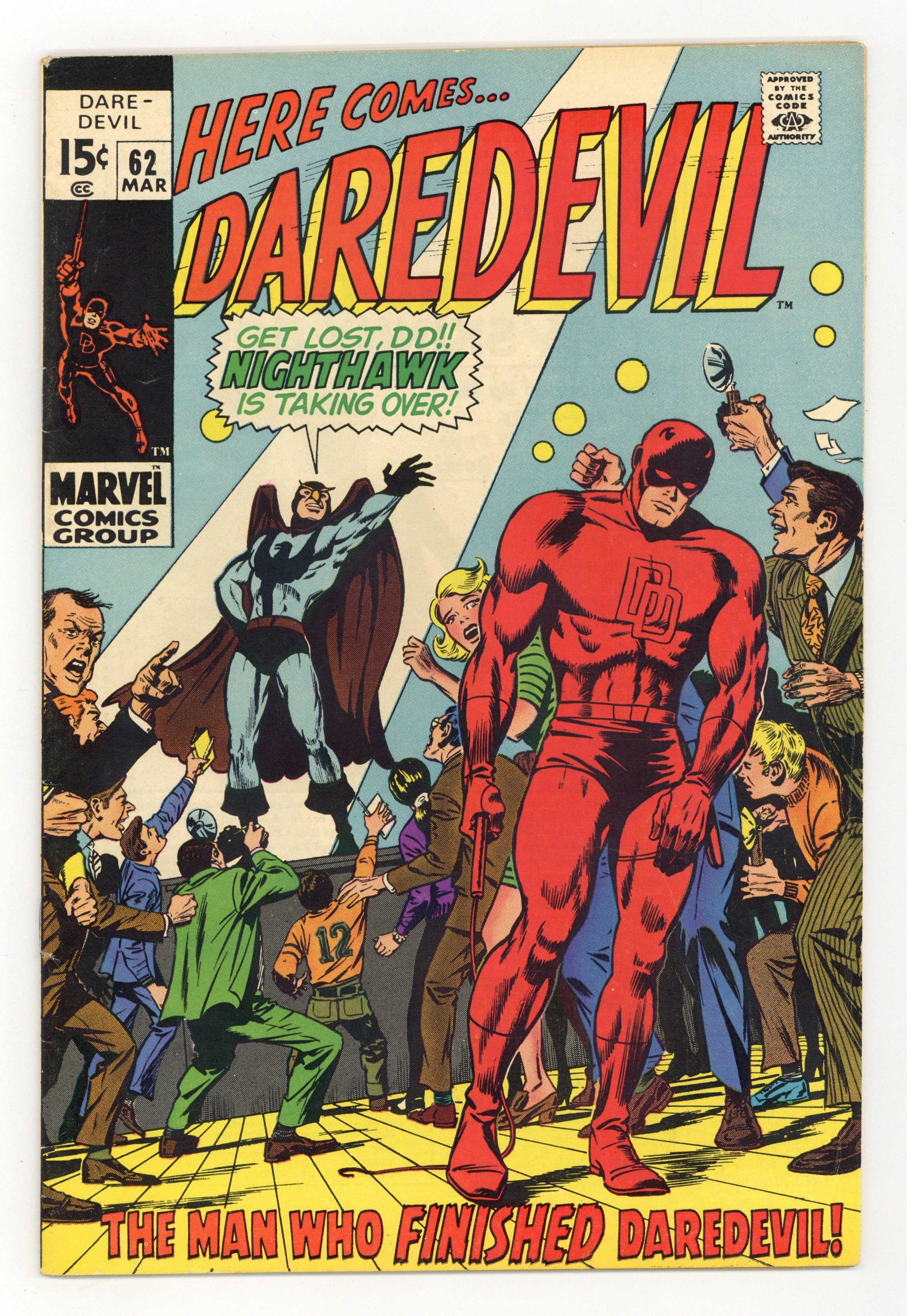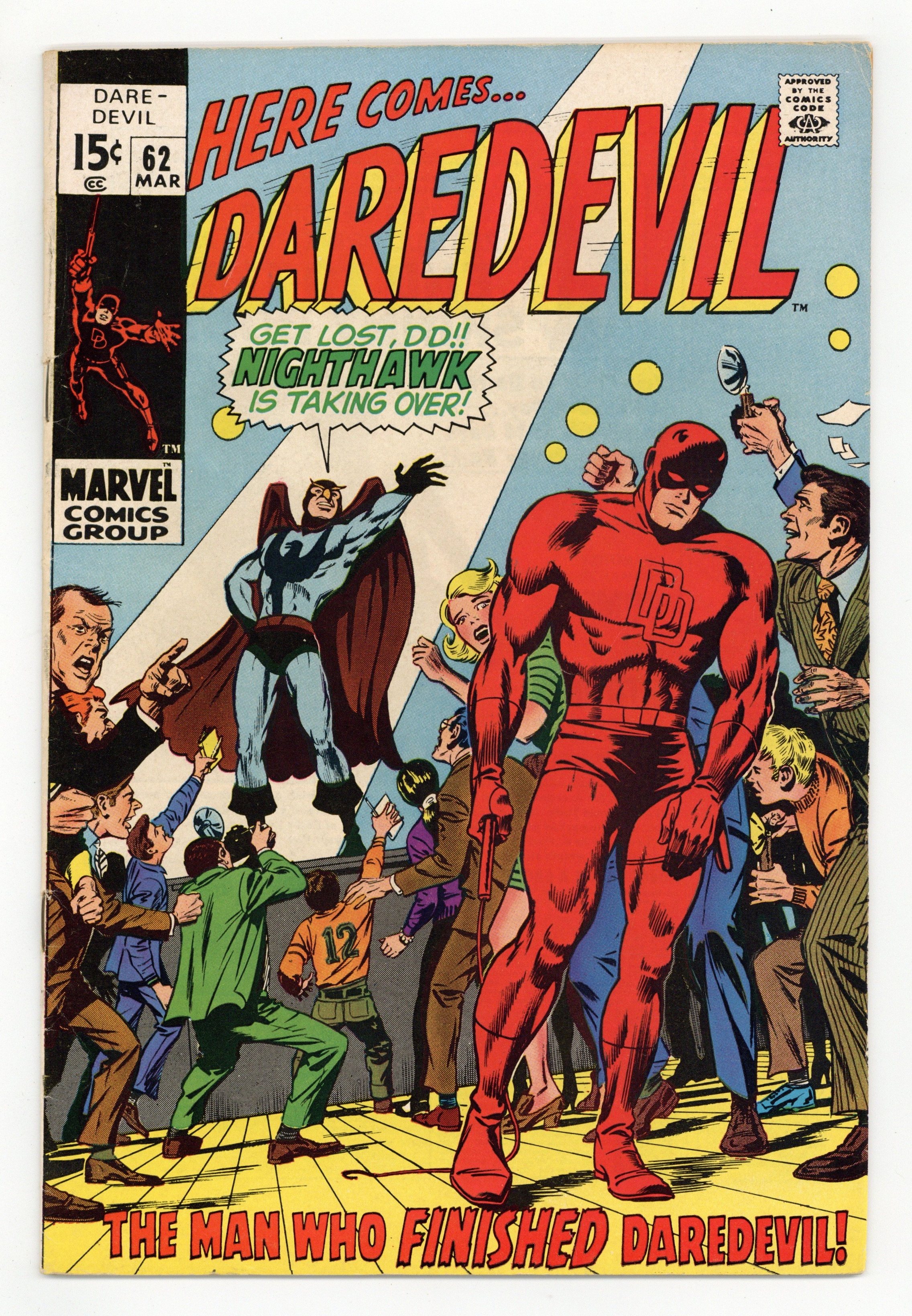 Cover pencils by Marie Severin, inks by Syd Shores. Quoth the Nighthawk, "Nevermore!" starring Daredevil, Nighthawk (Origin), Foggy Nelson, Karen Page, Jo-Jo, and Weepin' Willie, script by Roy Thomas, pencils by Gene Colan, inks by Syd Shores; Daredevil is upstaged by the new hero in town who is only in the game for the glory; cameo flashback with Captain America, Namor, the Sub-Mariner, and Grand Master. The letters page contains a statement of ownership--average print run 418,160; average paid circulation 245,422. 36 pgs. Cover price $0.15. Cover price $0.15.
