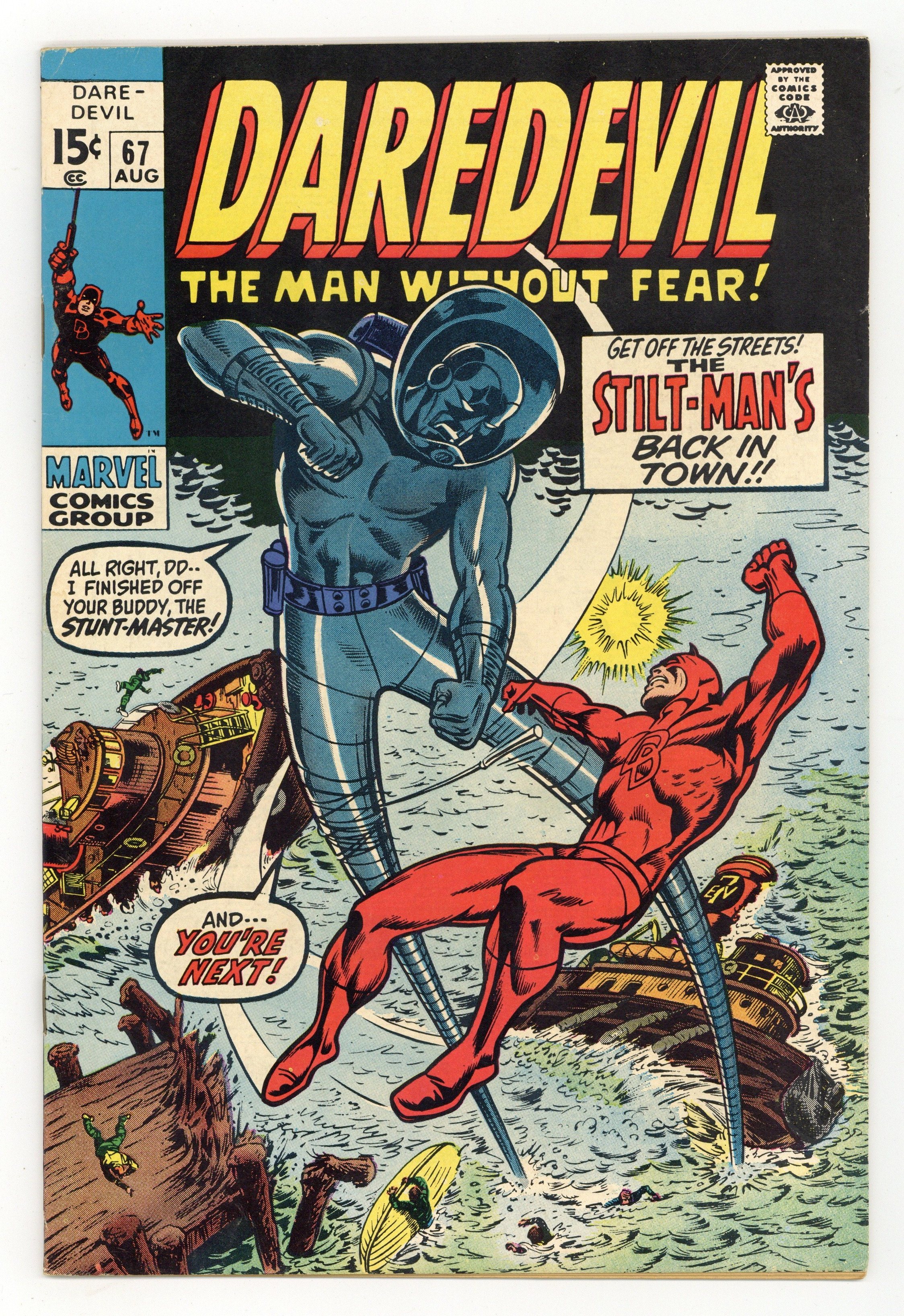 Tags: Marvel Legacy Numbering: Daredevil (part 67), Daredevil$15.00Cover pencils by Marie Severin, inks by Bill Everett. Stilt-Man Stalks the Soundstage, script by Roy Thomas (plot) and Gary Friedrich, pencils by Gene Colan, inks by Syd Shores; DD and Karen are slated to appear on Stunt-Master's new TV show but Stilt-Man interferes. 36 pgs. Cover price $0.15. Cover price $0.15.
