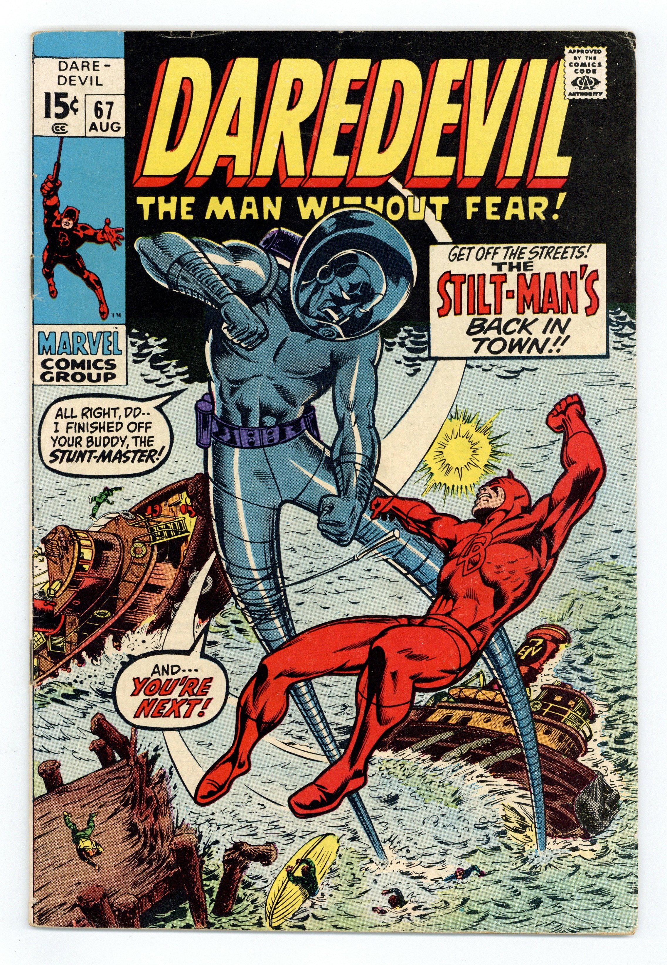Cover pencils by Marie Severin, inks by Bill Everett. Stilt-Man Stalks the Soundstage, script by Roy Thomas (plot) and Gary Friedrich, pencils by Gene Colan, inks by Syd Shores; DD and Karen are slated to appear on Stunt-Master's new TV show but Stilt-Man interferes. 36 pgs. Cover price $0.15. Cover price $0.15.