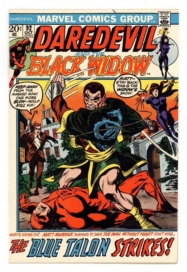 First appearance of the Blue Talon. Cover pencils by Gene Colan and John Romita (re-touches), inks by Tom Palmer and John Romita (re-touches). On the Eve of the Talon!, script by Gerry Conway, pencils by Gene Colan, inks by Tom Palmer; The Black Widow and Danny French are captured by Damon Dran and interrogated about Project Four; A San Francisco reporter claims that Matt Murdock is actually Daredevil until Matt shows up to a fight between DD and the Blue Talon; Black Panther appearance. 36 pgs. Cover price $0.20. Cover price $0.20.