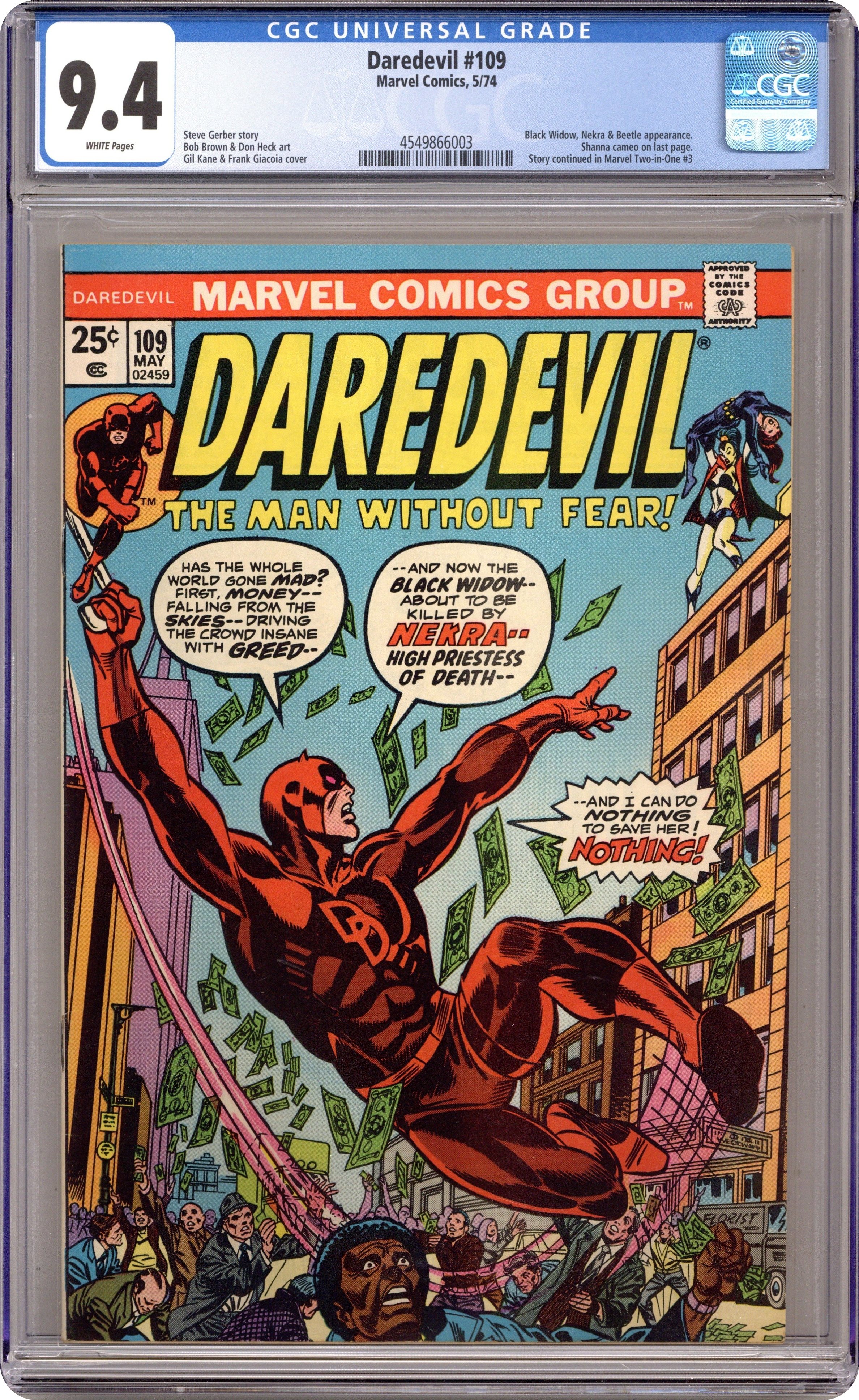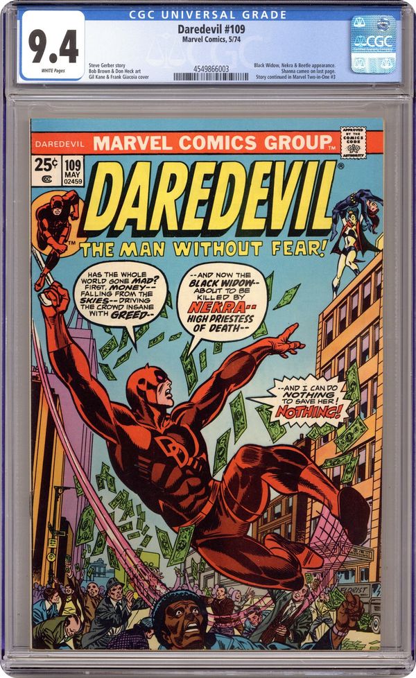 First 25-cent cover price. Cover pencils by Gil Kane, inks by Frank Giacoia. Dying for Dollar$!, script by Steve Gerber, pencils by Bob Brown, inks by Don Heck; While defacing American landmarks, the Black Spectre tries to (forcefully) recruit DD and the Black Widow; Shanna the She-Devil appearance. The letters page contains Marvel Value Stamp series A # 52 (Quicksilver by John Buscema/Tom Palmer) and a statement of ownership--average print run 345,283; average paid circulation 170,669. 36 pgs. Cover price $0.25. Cover price $0.25.
