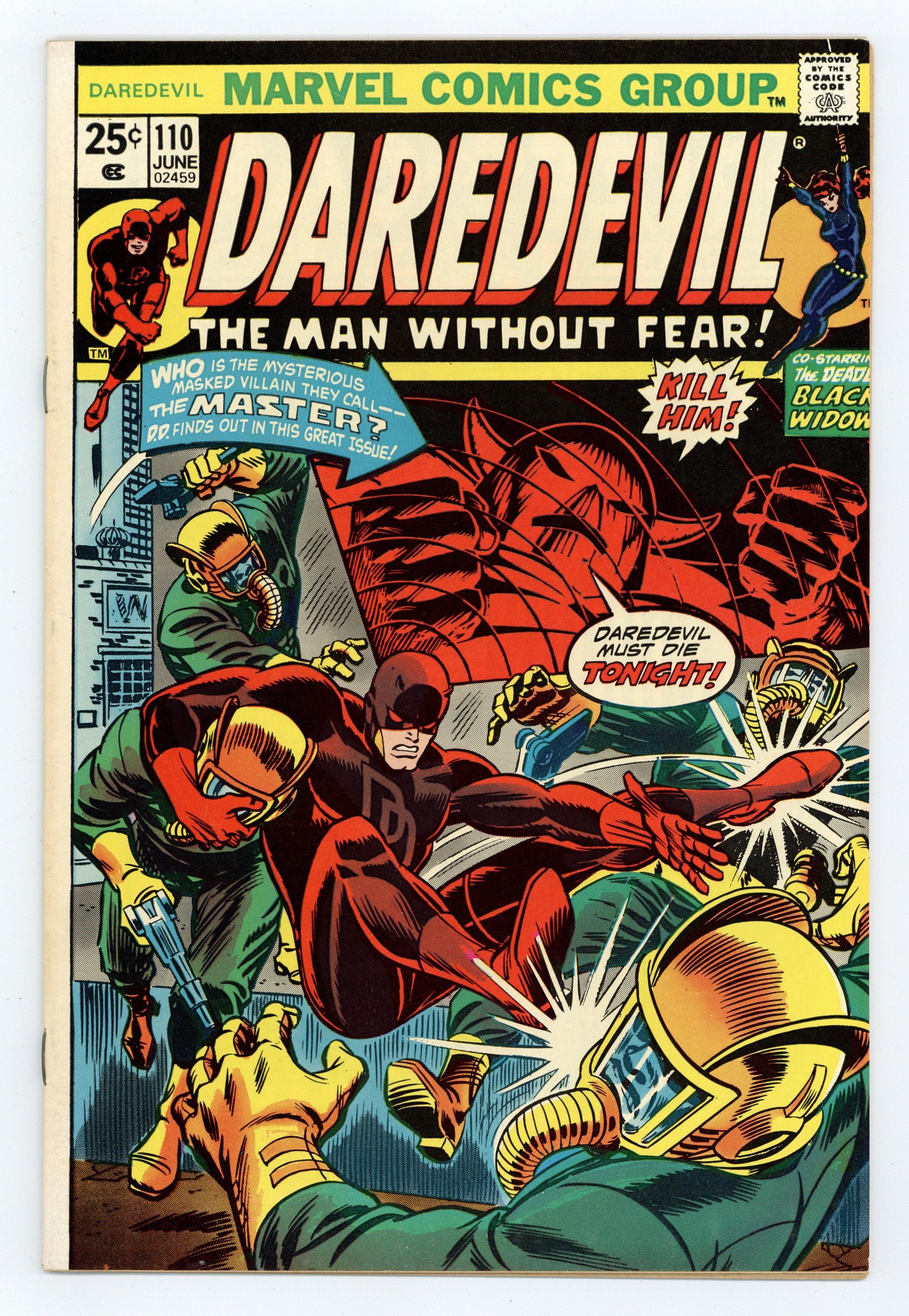 Cover art by John Romita. Birthright!, script by Steve Gerber, pencils by Gene Colan, inks by Frank Chiaramonte; The Thing returns DD to New York after their failed attempt to defeat Black Spectre; Daredevil tangles with the evil organization once again and discovers that all of their soldiers are women with strange tattoos; The Widow is brainwashed into working for Black Spectre; DD discovers that the Spectre's leader is Mandrill and is told an origin story of violence and intolerance of a white boy who was black (Mandrill) and a black girl who was white (Nekra); The Black Widow and Shanna the She-Devil appear. Letter to the editor from comics writer Ralph Macchio. The letters page also contains Marvel Value Stamp series A #51 (Bucky Barnes by Jack Kirby). 36 pgs. Cover price $0.25. Cover price $0.25.