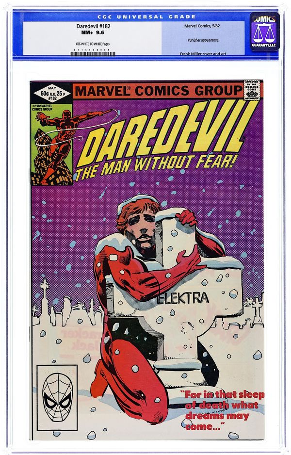Direct Edition. "She's Alive" Written by Frank Miller. Pencils by Frank Miller (breakdowns) and Klaus Janson (finished art). Inks by Klaus Janson. Cover pencils by Frank Miller with inks by Klaus Janson. Severely distraught with grief, Matt begins to believe that Elektra is really alive and proceeds to dig her up; Punisher escapes from prison; brief appearances by the Kingpin and the Punisher. Cover price $0.60.