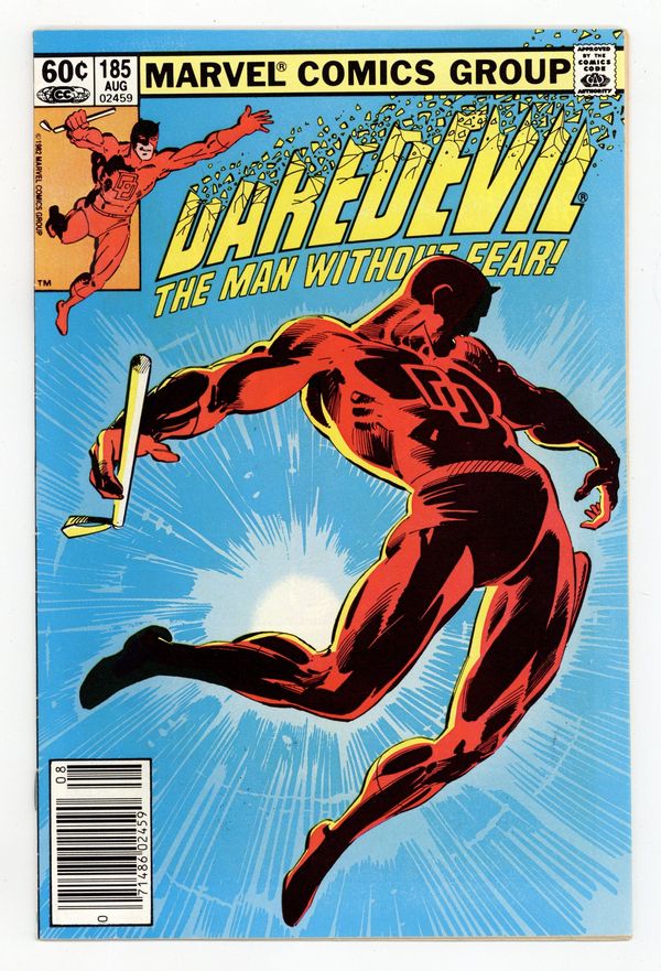 Tags: Marvel Legacy Numbering: Daredevil (part 185), Daredevil$6.00Cover pencils by Frank Miller, inks by Klaus Janson. Guts, script by Frank Miller, pencils by Frank Miller (layouts/breakdowns) and Klaus Janson (finished art), inks by Klaus Janson; Foggy begins to investigate why Heather's company is making bombs and this causes him to run up against both Eric Slaughter and the Kingpin; No problem for "Guts" Nelson and his partner Turk; DD is caught in an explosion that messes up his radar sense; story is narrated by Foggy Nelson. This issue marks Frank Miller doing rough breakdowns with Klaus Janson doing the major penciling work. Letter to the editor from comics editor Diana Schutz. 36 pgs. Cover price $0.60. Cover price $0.60.