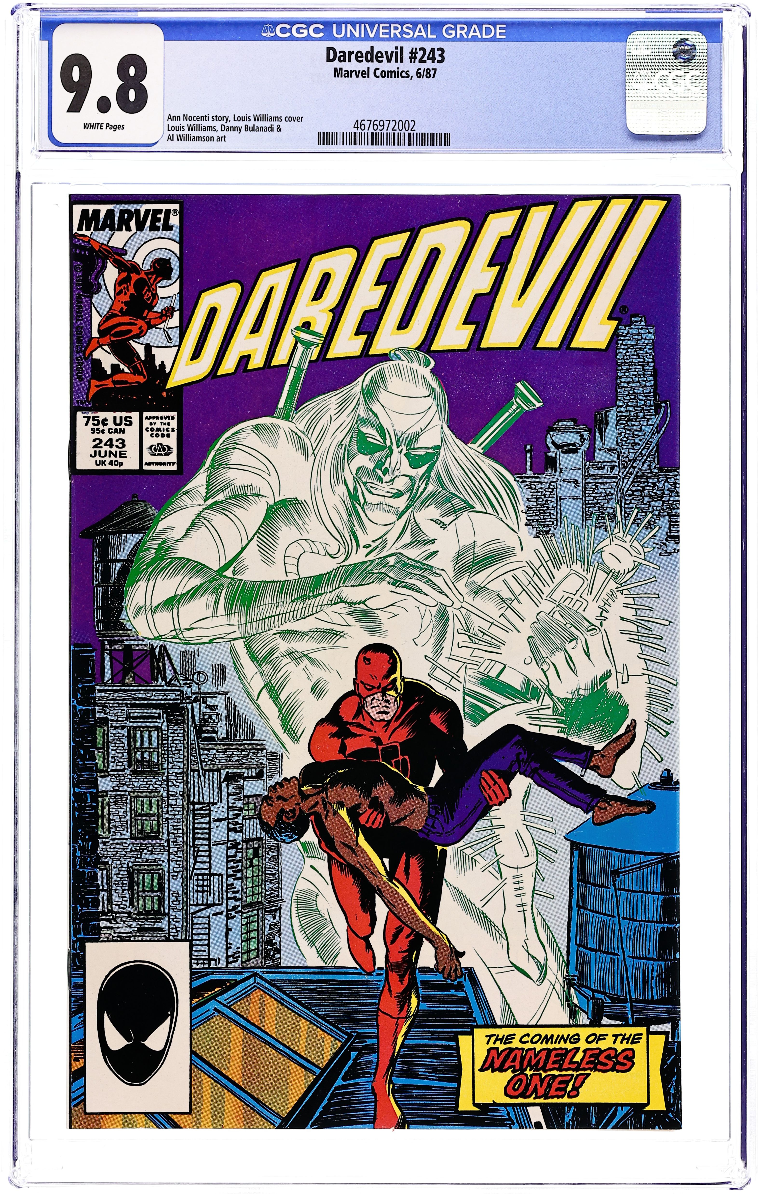 Cover art by Louis Williams. Don't Touch Me starring Daredevil, Karen Page, Danny Guitar, the Nameless One (1st), and Mambo (1st), script by Ann Nocenti, pencils by Louis Williams, inks by Al Williamson and Danny Bulanadi; DD tries to gather evidence against a drug dealer who uses voodoo as a gimmick when a true voodoo creature intervenes. 36 pgs. Cover price $0.75. Cover price $0.75.