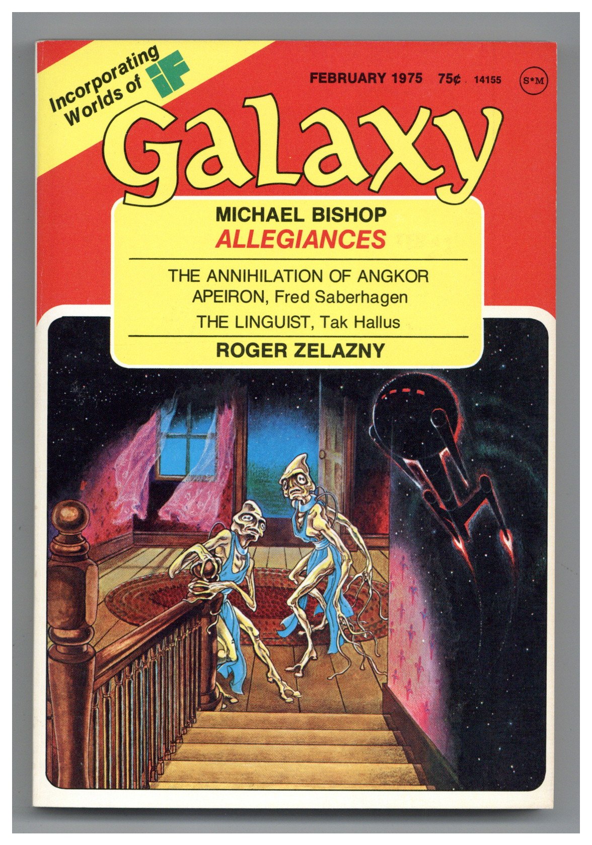 Published Feb 1975 by Galaxy Publications.$12.00Volume 36, Issue 2 - February, 1975. Cover by Pini and Pini. Science fiction stories by Michael Bishop, Fred Saberhagen, Tak Hallus and more. Illustrations by Wendy Pini, Ames, Jack Gaughan, Stephen Fabian, Freff. Softcover, 5-1/4-in. x 7-1/4-in.; b&w text with spot illustrations; 160 newsprint pages. Cover price $0.75.