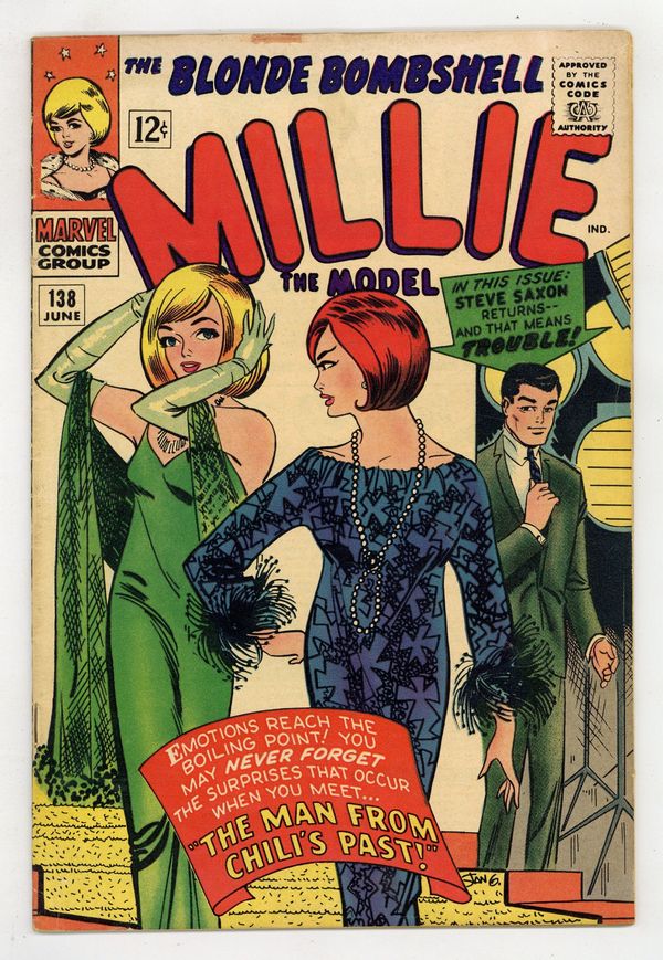 Cover art by Stan Goldberg. The Man from Chili's Past! starring Millie the Model, script by Dennis O'Neil. Millie and Toni's Sensational Sports Clothes fashion page. Millie's Fashion Pin-Up paper dolls, script by Stan Lee. Millie, Toni and Chili's Charming Coiffures! Stan Goldberg art throughout. 36 pgs. $0.12. Cover price $0.12.
