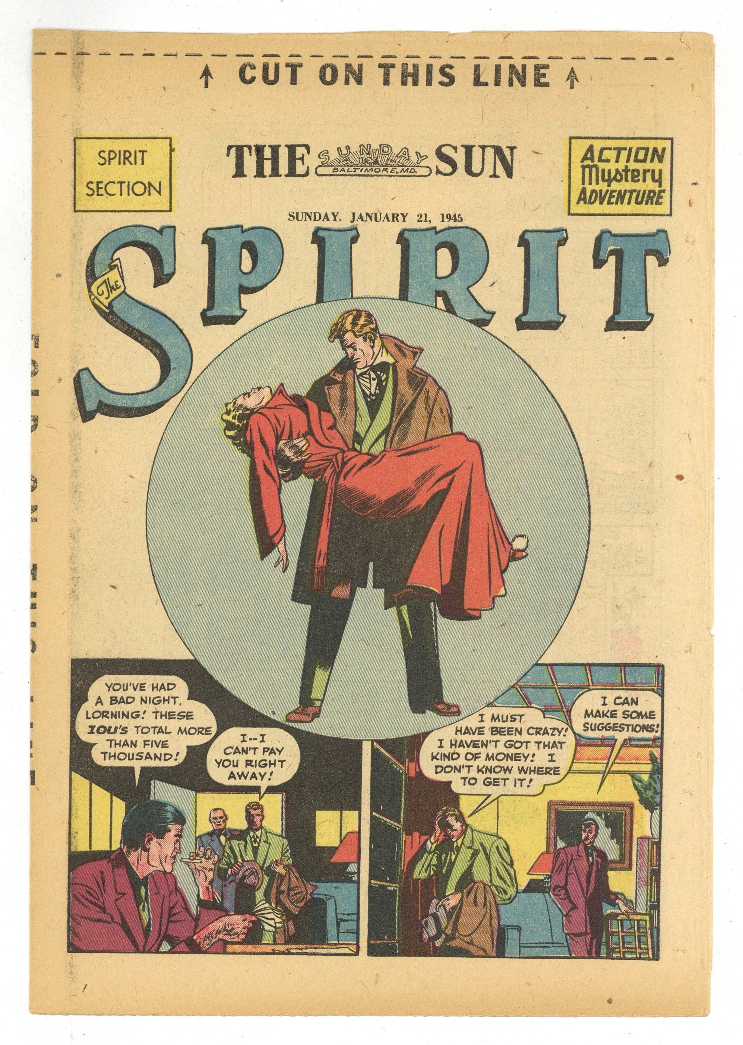 Spirit Weekly Newspaper Comic Insert. 7-1/2 x 10 inches, 16 pages, full color, all newsprint with no slick cover. Wellman/Woolfolk scripts, Fine art with unknown staff assists.