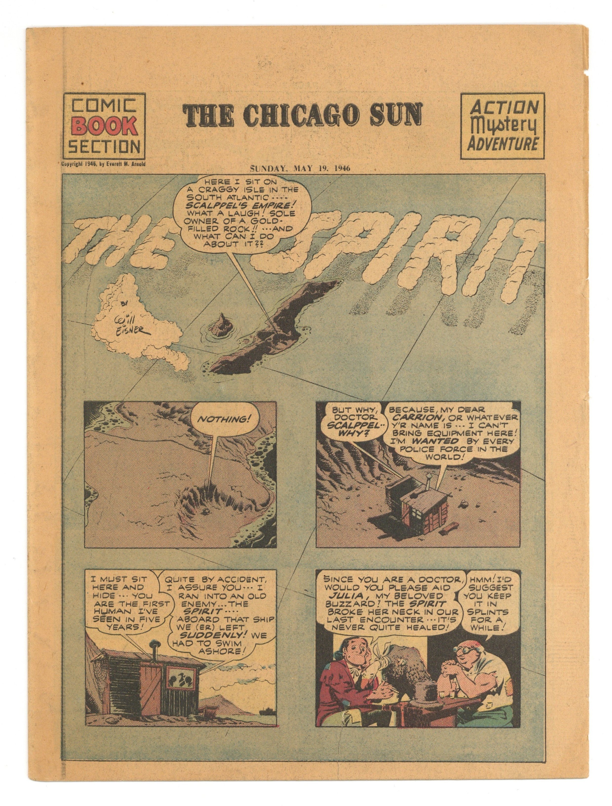 Spirit Weekly Newspaper Comic Insert. 7-1/2 x 10 inches, 16 pages, full color, all newsprint with no slick cover. Scripts/layouts by Eisner, Eisner/Nordling, Eisner/Mercer, or Spranger/Eisner; inks by Eisner or Eisner/Spranger. Lady Luck by Fred Schwab. 2nd Mr. Carrion appearance.