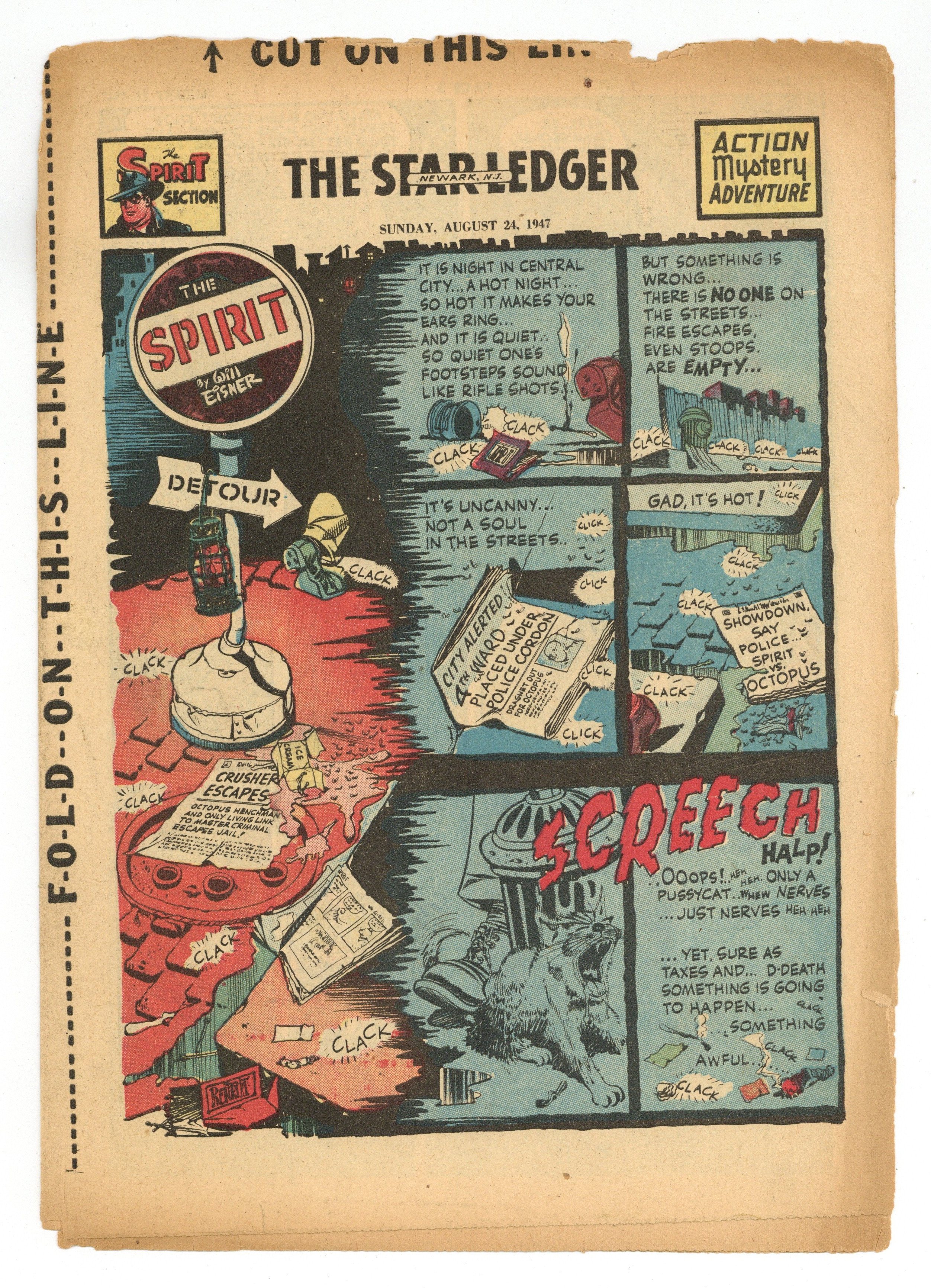 Spirit Weekly Newspaper Comic Insert. 7-1/2 x 10 inches, 16 Pages, full color, all newsprint with no slick cover. Scripts, pencils/inks by Eisner except where noted.