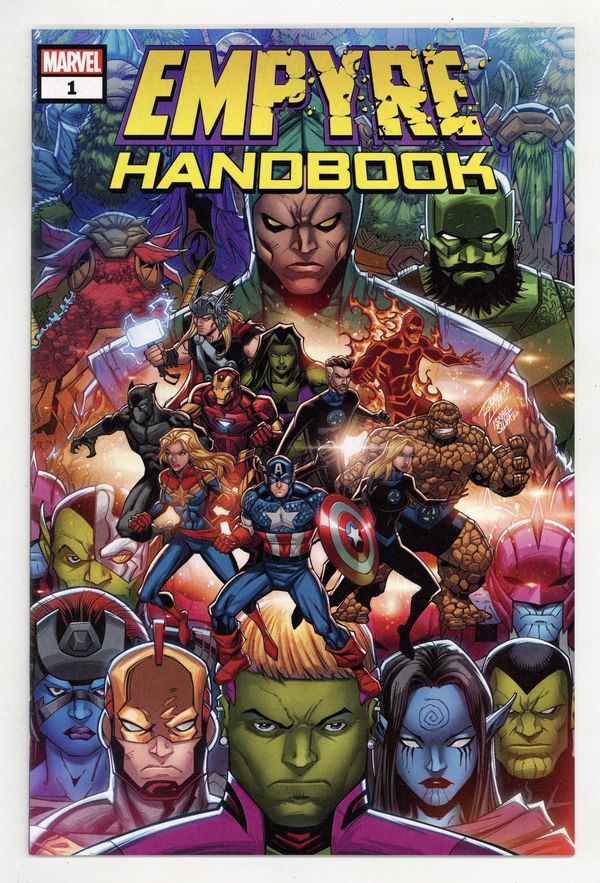 Tags: Empyre (part Handbook)$18.00Cover by Ron Lim. Written by Mike O'Sullivan, Ronald Byrd, Jeff Christiansen, Anthony Cotilletta, Daron Jensen, Luc Kersten, Rob London, Chris McCarver, Marc Riemer, Jacob Rougemont and Stuart Vandal. Multiple races across the universe are pulled into a major conflict when EMPYRE hits! The Official Handbook of the Marvel Universe helps keep the participants straight with updates of the major players in this star-spanning war: The Avengers! The Fantastic Four! Captain Marvel (Danvers)! The Skrulls! The Kree! Hulkling! Plus: All-new profiles of Kree members Bel-Dann, Captain Glory (Gla-Ree) and Tanalth, Skrull member Raksor, and the Cotati Swordsman! Also featuring the mysterious, never-before profiled Blue Area of Earth's Moon! 40 pages, full color. Rated T+ Cover price $4.99.