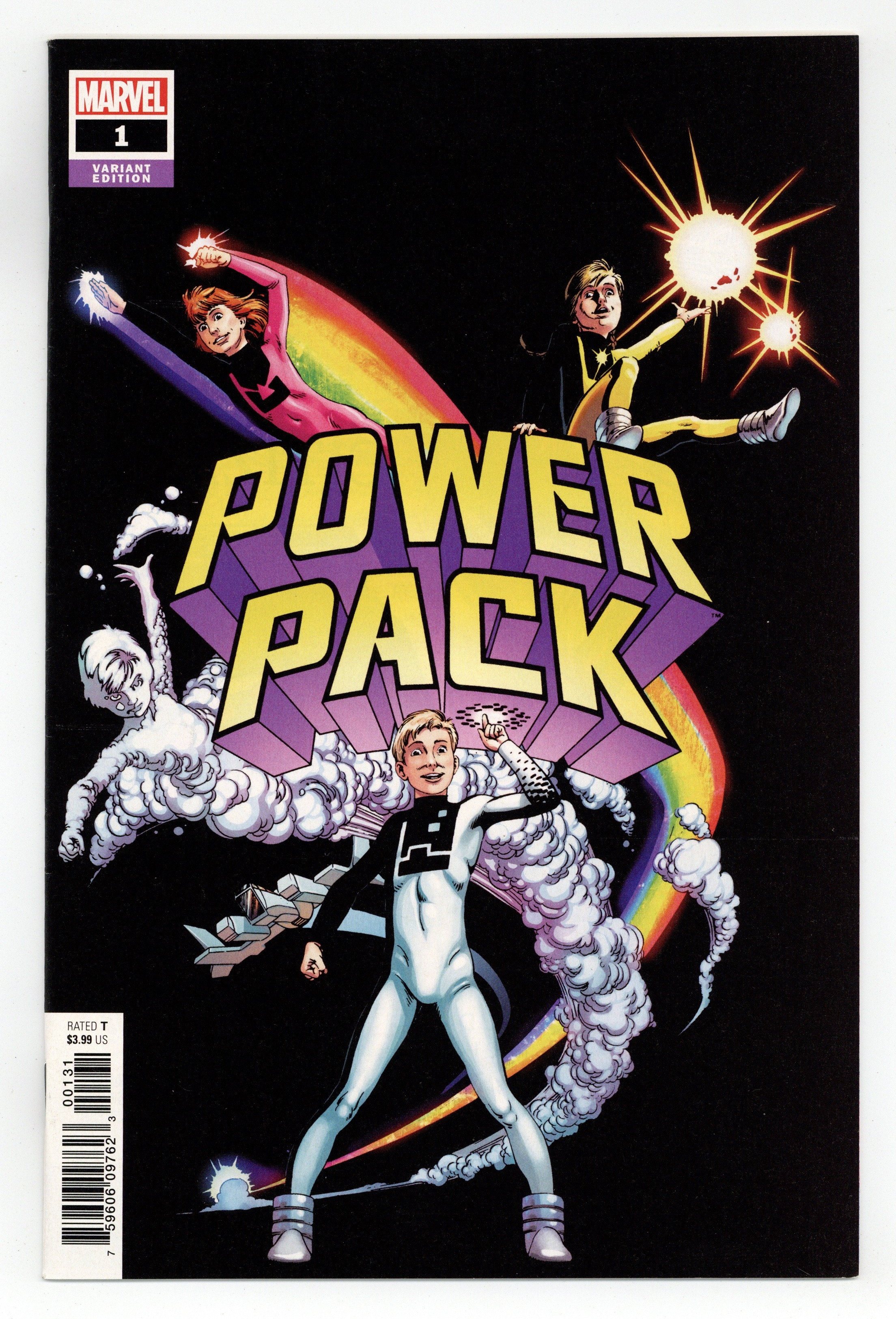 Limited 1 for 100 Retailer Incentive Variant Cover. Written by Ryan North. Art by Nico Leon. Cover by June Brigman. Power Pack is back! Katie, Julie, Jack and Alex Power have been super-heroing since they were learning to tie their own shoes. It's been ages since they fought side by side as a family, but a special occasion - and an old grudge - is about to put the gang back together. There's just one teeny tiny hiccup: a brand-new law restricting underage super heroes! But surely, if the fate of all New York City is at stake, the powers that be will make an exception? Keep your fingers crossed as the Power siblings fight for their right to save the world! 28 pages, full color. Rated T Cover price $3.99.