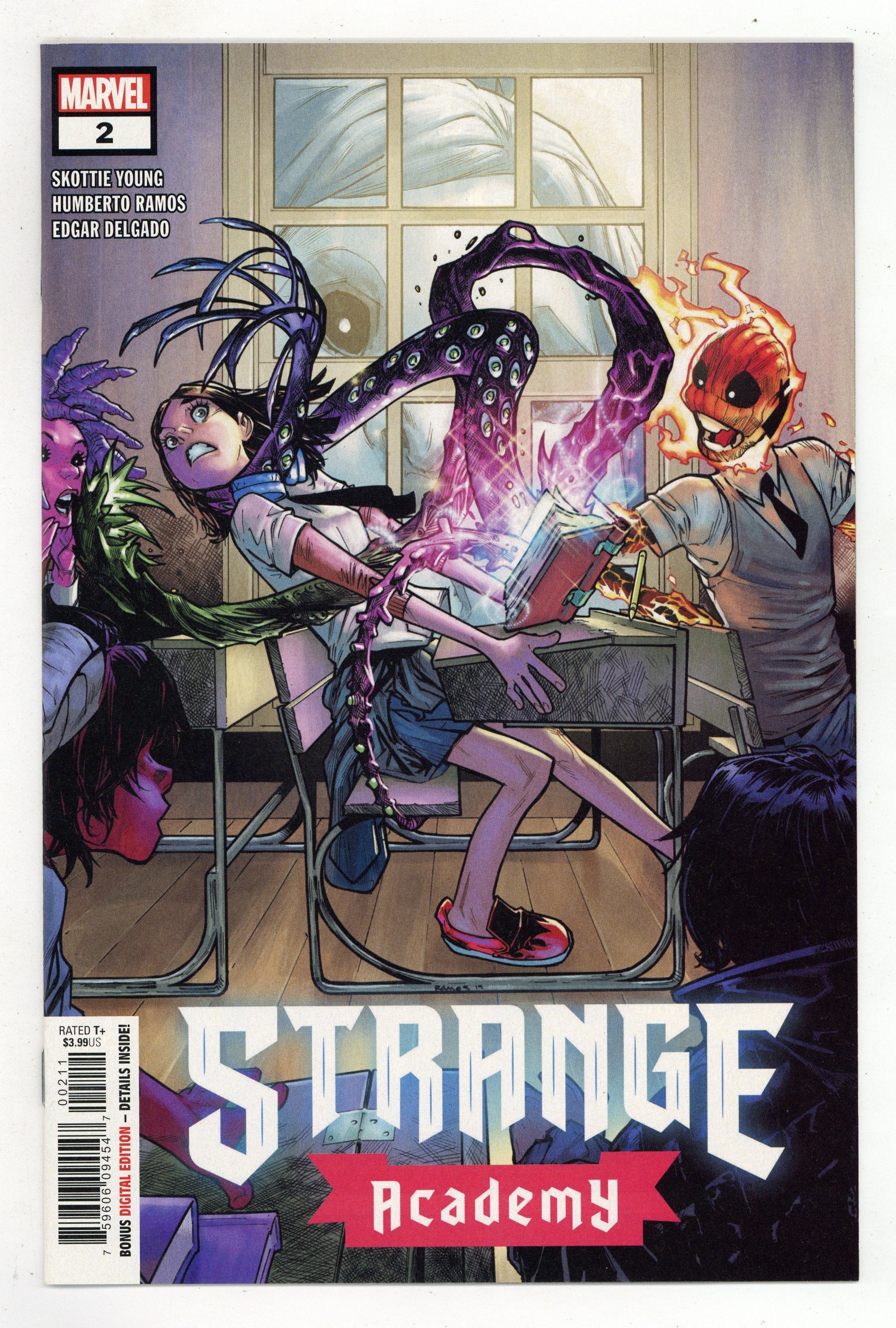 Written by Skottie Young. Art and Cover by Humberto Ramos. Go to class with the students at STRANGE ACADEMY! Your class schedule: 8:15-9:15 HISTORY OF MAGICAL OBJECTS with THE ANCIENT ONE, 9:25-10:25 ELEMENTS OF CHAOS MAGIC with SCARLET WITCH, 10:35-11:35 GYM with COACH TAYLOR, 11:40-12:10 LUNCH (cooked by MINDFULL ONE), 12:20-1:20 INTRODUCTION TO THE UNDEAD with BROTHER VOODOO, 1:30-2:30 INFERNO 101 with MAGIK, 2:40-3:20 (Pending survival) STUDY HALL, 3:30-4:30 MAGICAL PLANTS AND THE CARE THEREOF with PROFESSOR MAN-THING. 28 pages, full color. Rated T Cover price $3.99.