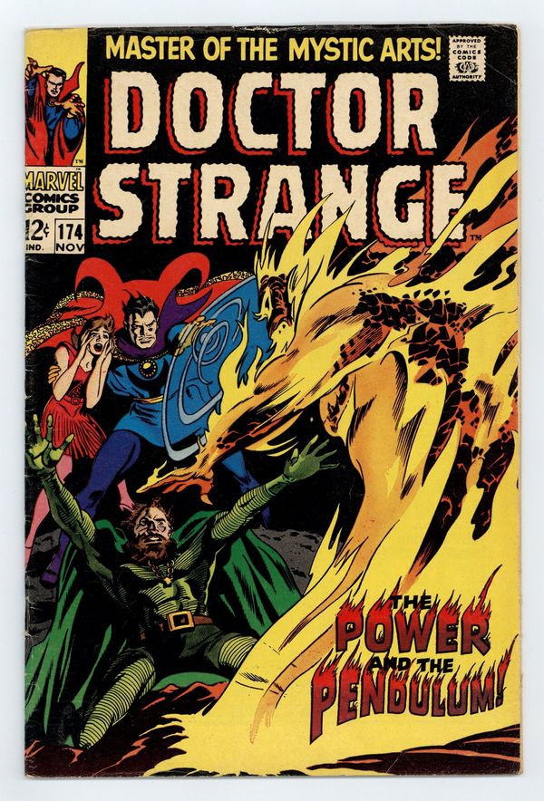 Cover pencils by Gene Colan, inks by Tom Palmer. The Power and the Pendulum, script by Roy Thomas, pencils by Gene Colan, inks by Tom Palmer; Strange battles Lord Nekron, who has made a bargain with Supreme Satannish for eternal fame and immortal life, provided he finds a mystic to take his place within one year; Strange makes time go faster and Satannish claims Nekron; First appearance of the Supreme Satannish (only hinted at previously); Clea appearance. 36 pgs. $0.12. Cover price $0.12.