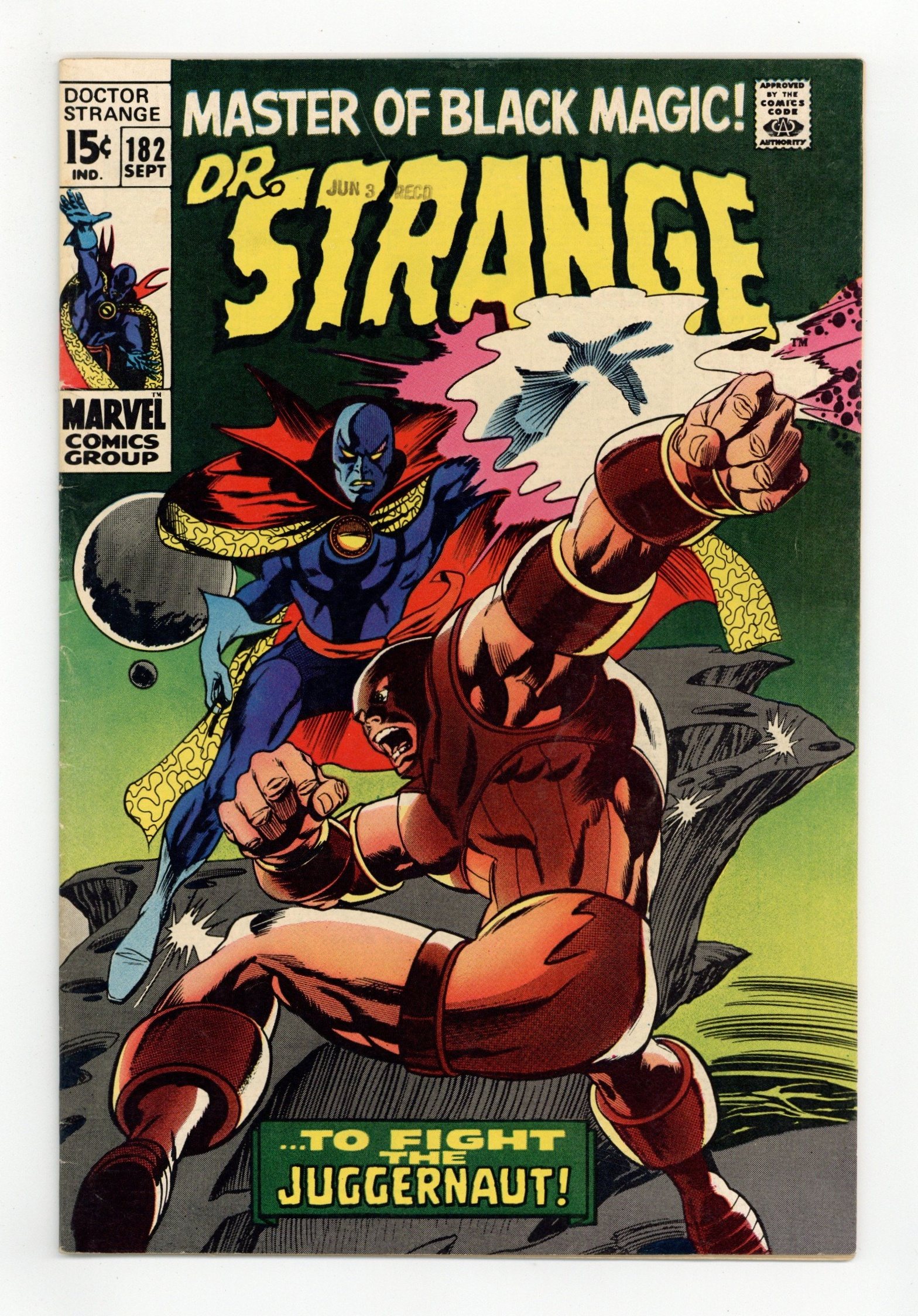 First 15-cent issue. Cover pencils by Gene Colan, inks by Tom Palmer. And Juggernaut Makes Three!, script by Roy Thomas, pencils by Gene Colan, inks by Tom Palmer; Strange leads Juggernaut from the Crimson Cosmos into the Dream Dimension; Nightmare and Juggernaut's errant spells free Eternity; Eternity changes Strange's name to Stephen Sanders; appearance by Clea. Letters to the editor from author Tom Wolfe and comics artist Walt Simonson (misspelled "Simerson"). Cover price $0.15.
