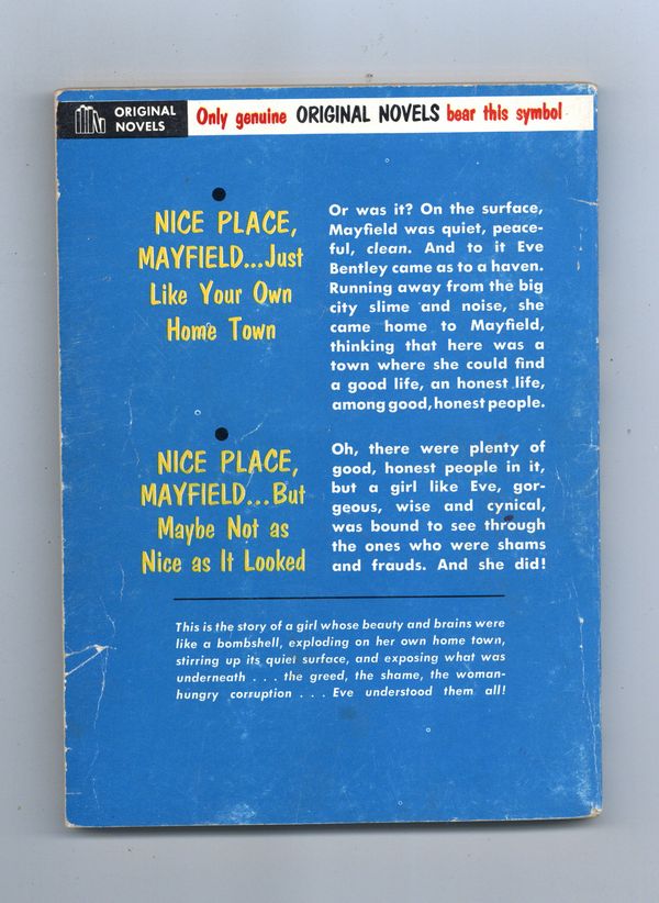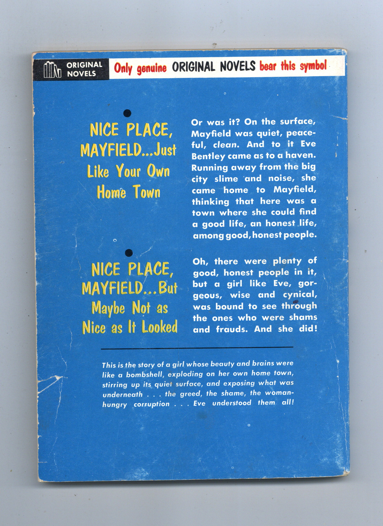 Published 1954 by Original Novels, Inc..$36.00First printing, 1954. Nice place, Mayfield... just like your own home town. But maybe not as nice as it looked. This is the story of a girl whose beauty and brains were like a bombshell, exploding on her home town, stirring up its quiet surface and exposing what was underneath. 5 1/4-in. x 7 1/2-in., 130 pages, B&W. Cover price $0.35.