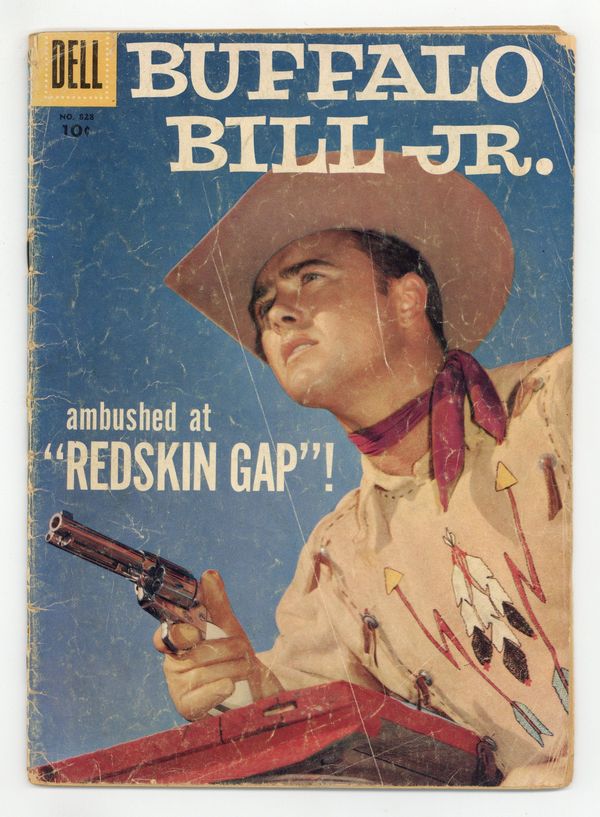 Back Cover Variant - Indicia title is "BUFFALO BILL, JR., No. 828." Based on the 1955 "Buffalo Bill Jr." syndicated TV series. Photo cover of Buffalo Bill Jr. [as played by Dickie Jones]. Intro with three photos from the TV series. The Rain Wagon, art by Bob Correa; In the midst of a drought, conmen use a "rainmaking machine" to provide cover when they rob the express office. Redskin Gap, art by Bob Correa; A bandit hijacks a stage, not knowing that a marshal is sleeping inside; The marshal handcuffs himself to the bandit, but the bandit slugs him; He takes his star and pretends to be the marshal and has the unconscious man locked up by Buffalo Bill Jr. Signals Across the Plains; forms of communication used before the telegraph came to the Old West. 36 pages, full color. Cover price $0.10.