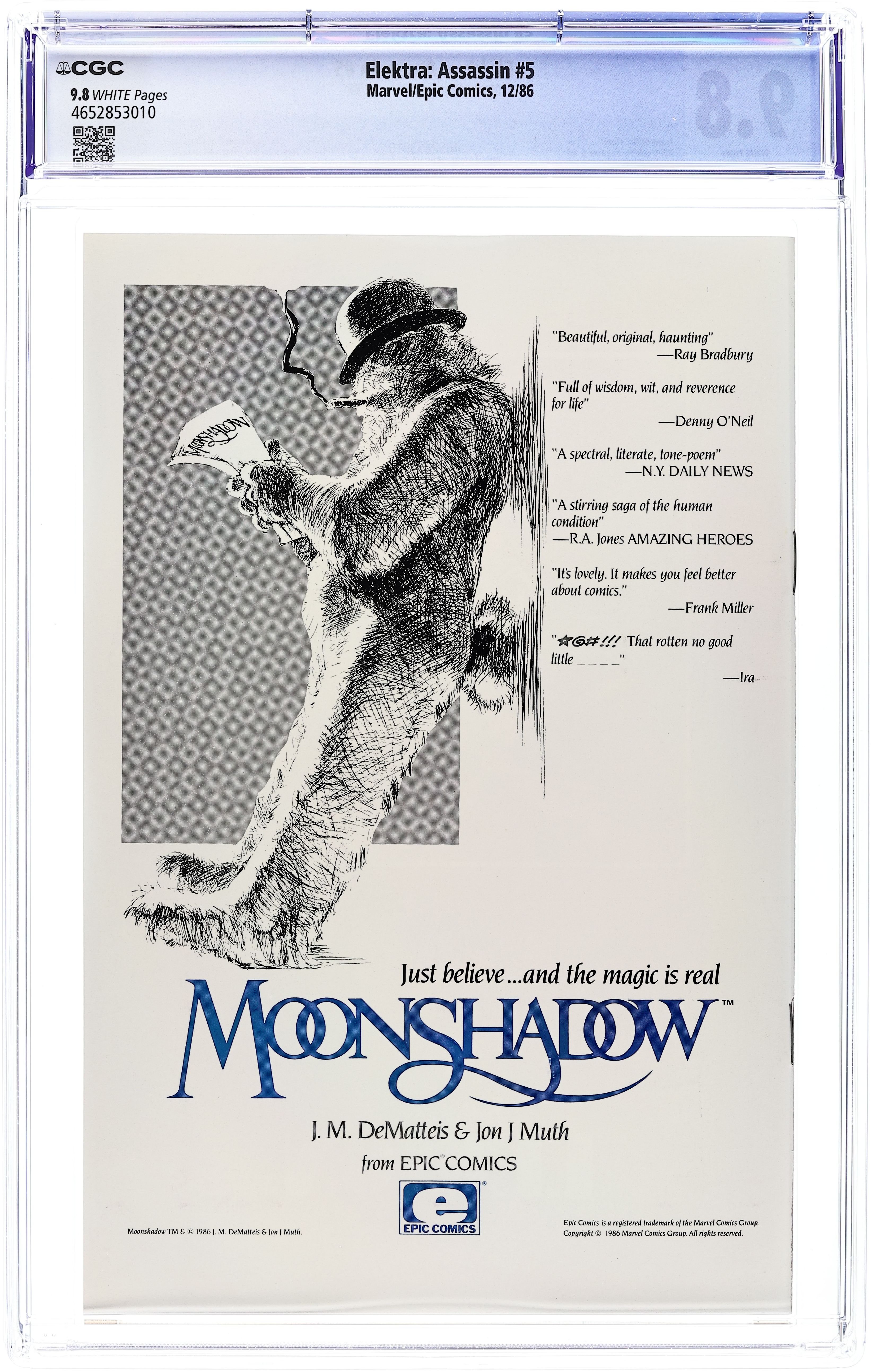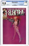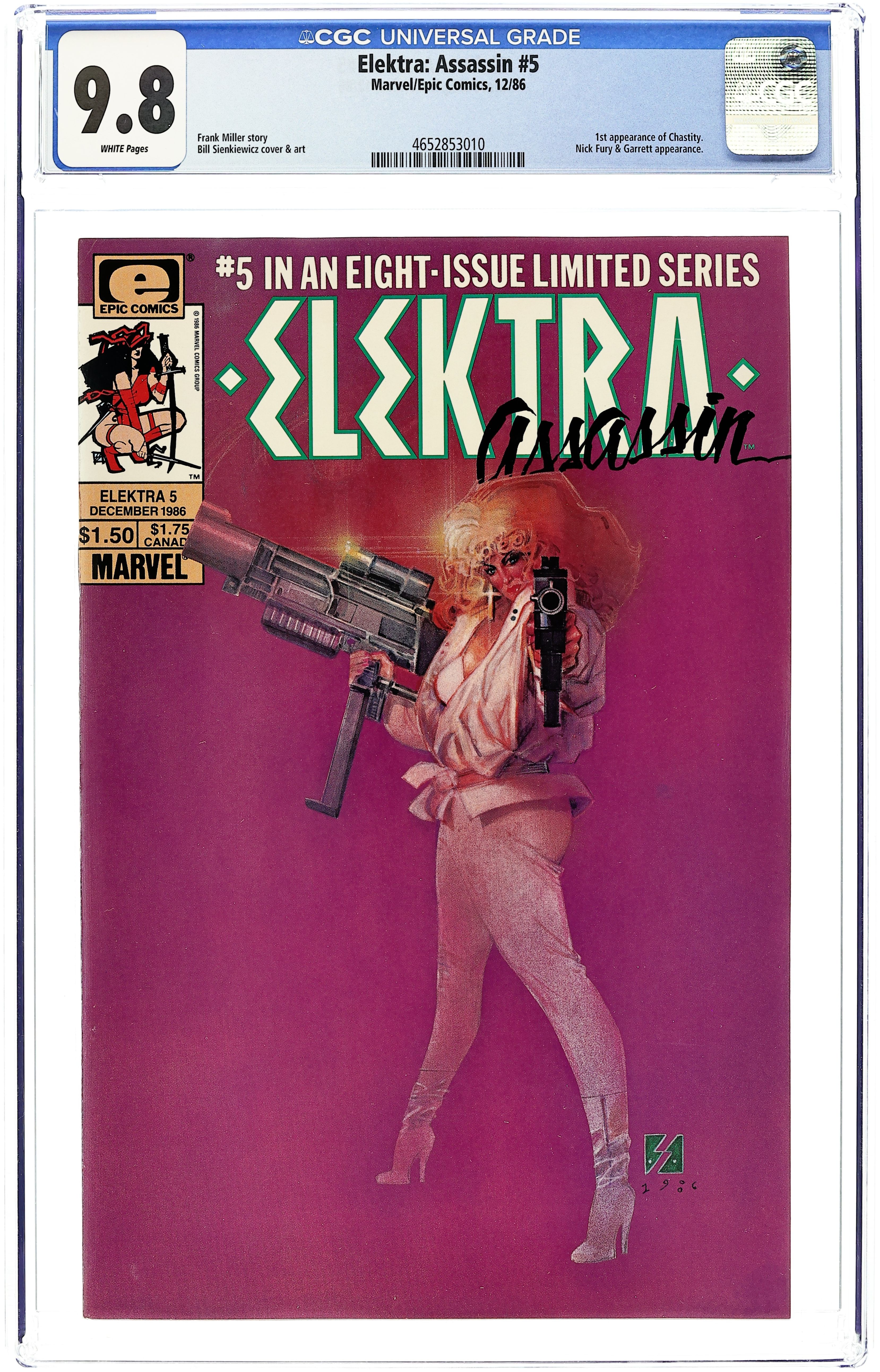 "Chastity." Elektra battles underwater, then uses ninja magic to transport her mind into S.H.I.E.L.D. agent Chastity's body. Written by Frank Miller. Pencils, inks, and cover by Bill Sienkiewicz. Cover price $1.50.