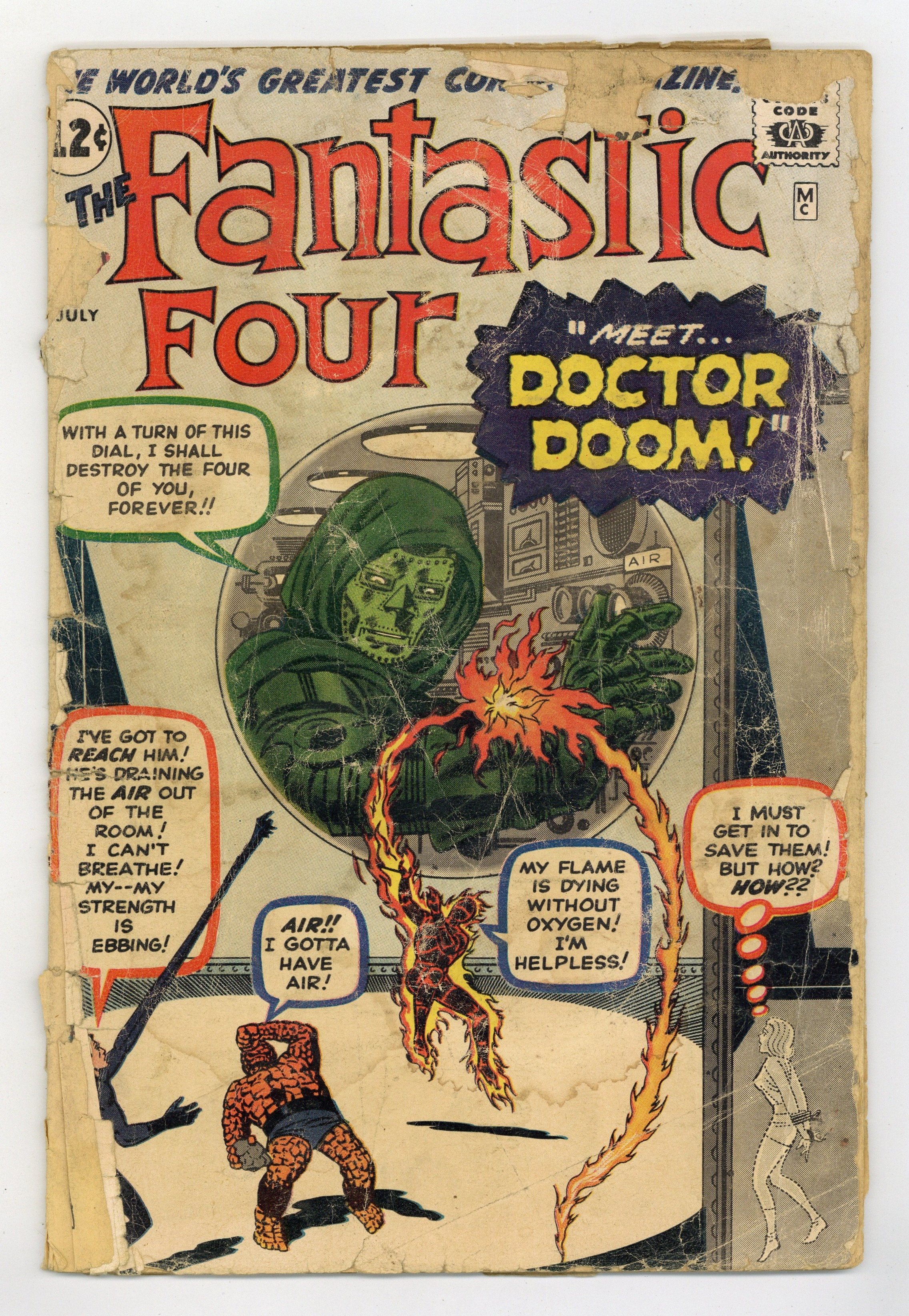 Cover pencils by Jack Kirby, inks by Joe Sinnott. Origin and first appearance of Doctor Doom in "Prisoners of Doctor Doom!" Part 1, script by Stan Lee, pencils by Jack Kirby, inks by Sol Brodsky; Doctor Doom takes the Invisible Girl hostage to insure her teammates' obedience. Part 2 Back to the Past!; Doctor Doom brings the FF to his castle stronghold in the USA; There he sends the Torch, the Thing and Mr. Fantastic back in time to retrieve the pirate Blackbeard's treasure. Part 3 On the Trail of Blackbeard; The Thing takes command of a sailing ship in the era of the pirate Blackbeard. Part 4 Battle; The Thing takes on the role of Blackbeard the Pirate and wishes to remain in the past. Part 5 "The Vengeance of Doctor Doom!"; Doom tries to kill the FF when they return from the past, but Invisible Girl saves them. Doom escapes with his jetpack. Hulk cameo. Letter to the editor from comics writer Roy Thomas. 36 pgs. $0.12. Cover price $0.12.
