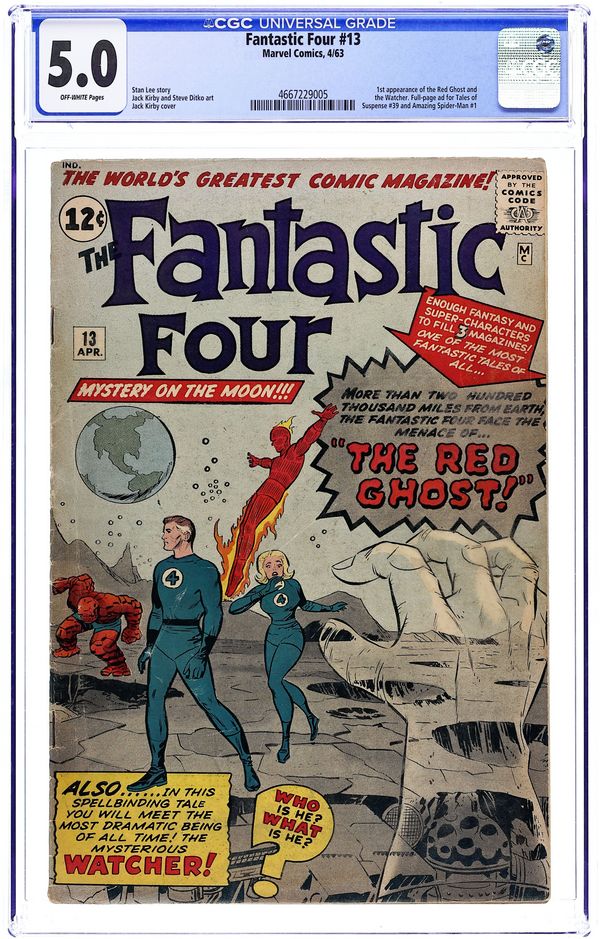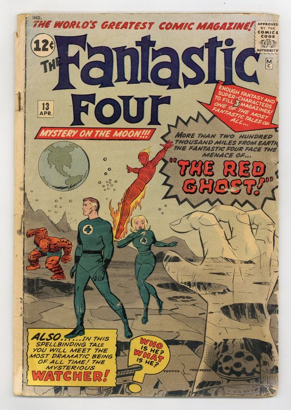 Cover pencils by Jack Kirby, inks by George Roussos. First appearance of The Watcher and the Red Ghost in The Fantastic Four Versus the Red Ghost and His Indescribable Super-Apes!, script by Stan Lee, pencils by Jack Kirby, inks by Steve Ditko; While Reed prapares a journey to the Blue Area of the Moon, Ivan Kragoff trains three apes to pilot a spaceship and take possession of the Moon "for the communist empire." Part 2 Menace on the Moon!; In space, the Fantastic Four's ship crosses that of Ivan Kragoff and they learn of the powers the apes have acquired before landing on the moon. Part 3 "The Watcher Appears!"; The Watcher appears and explains where he comes from and why he cannot take sides in the battle between the Fantastic Four and the Red Ghost. Part 4 "Duel in the Dead City!"; The Fantastic Four battles the Red Ghost and his super-apes on the Moon. 36 pgs. $0.12. Cover price $0.12.