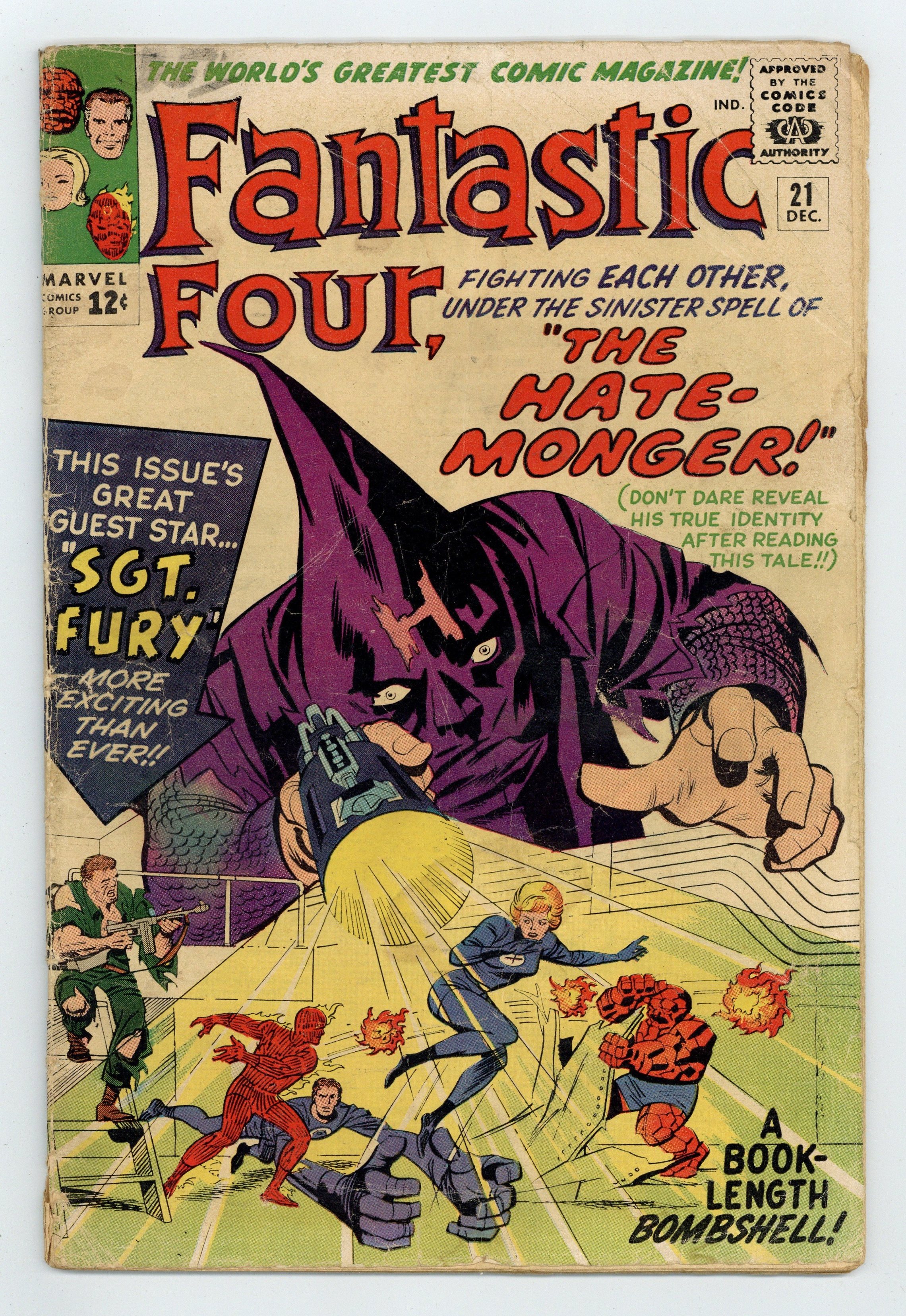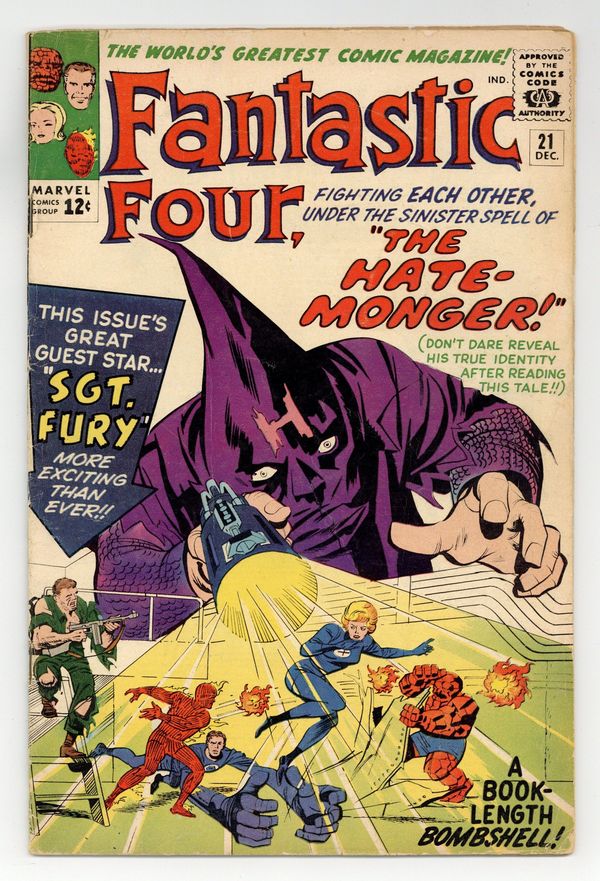 Cover pencils by Jack Kirby, inks by Paul Reinman. First appearance of the Hate-Monger in "The Hate-Monger!", script by Stan Lee, pencils by Jack Kirby, inks by George Roussos [as George Bell]; Nick Fury, now a colonel in the CIA, enlist the aid or the Fantastic Four against the Hate-Monger even though they are under the control of his Hate-Ray. First Sgt. Fury cross-over. Spider-Man cameo. 36 pgs. $0.12. Cover price $0.12.