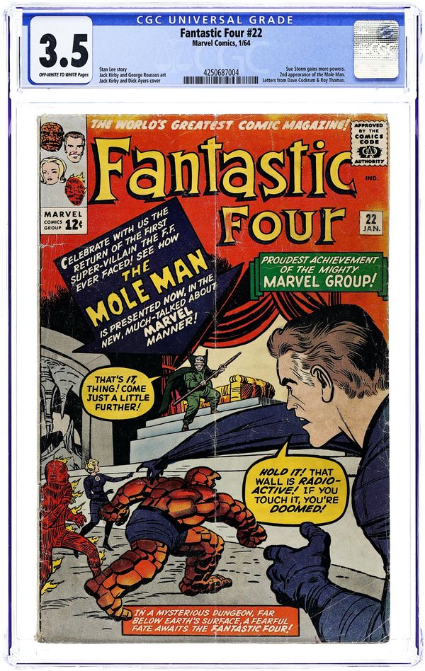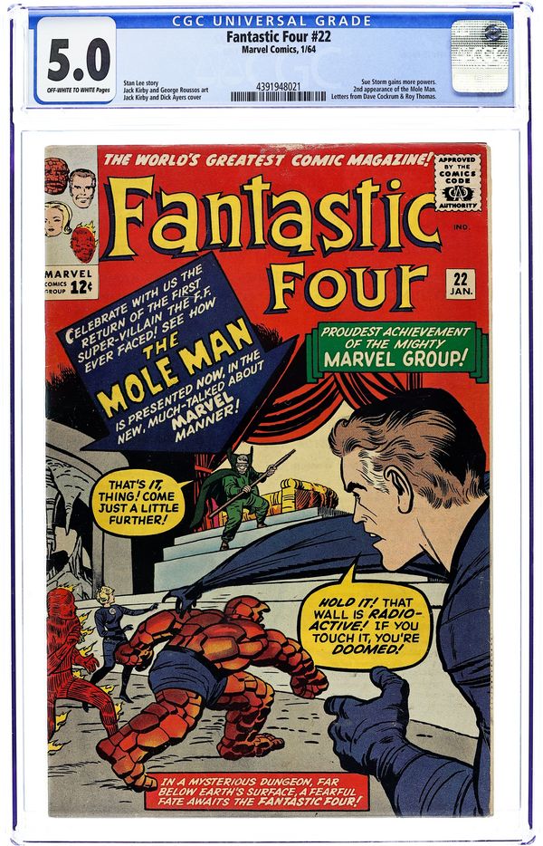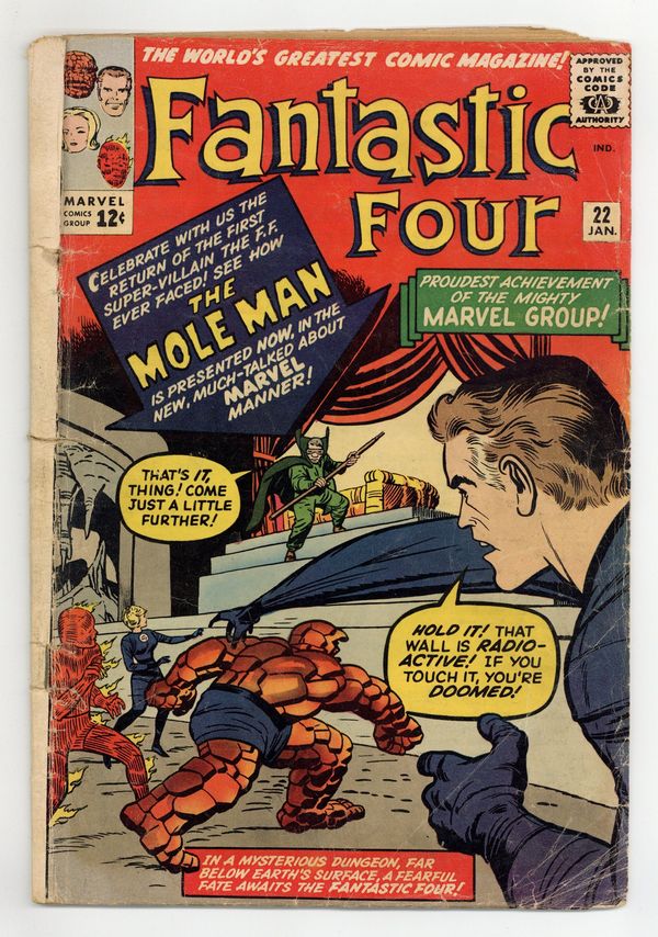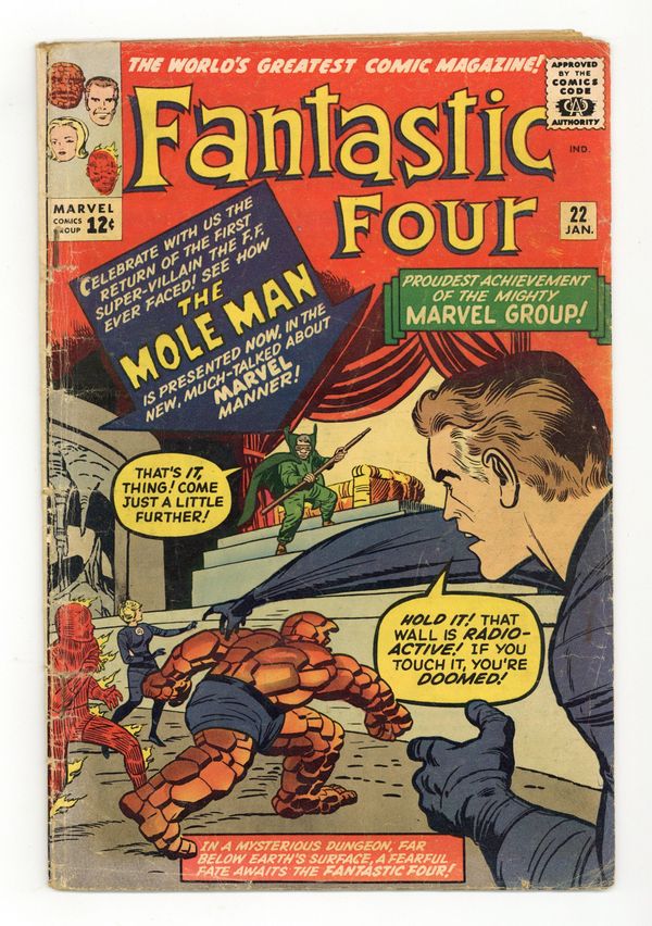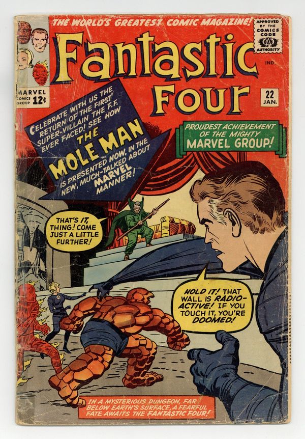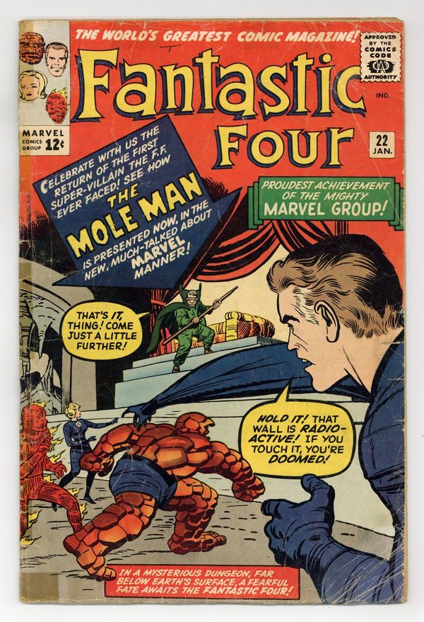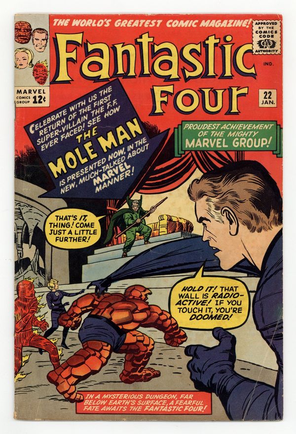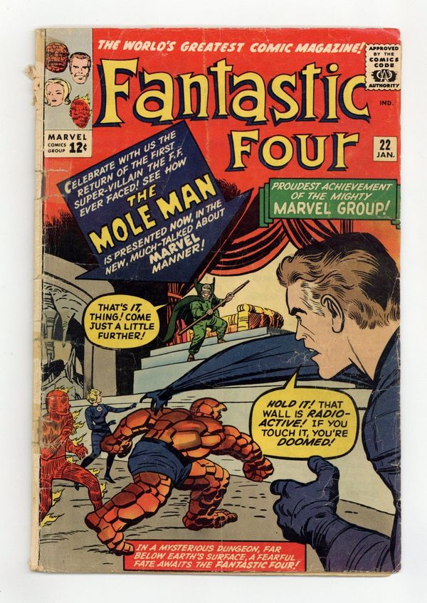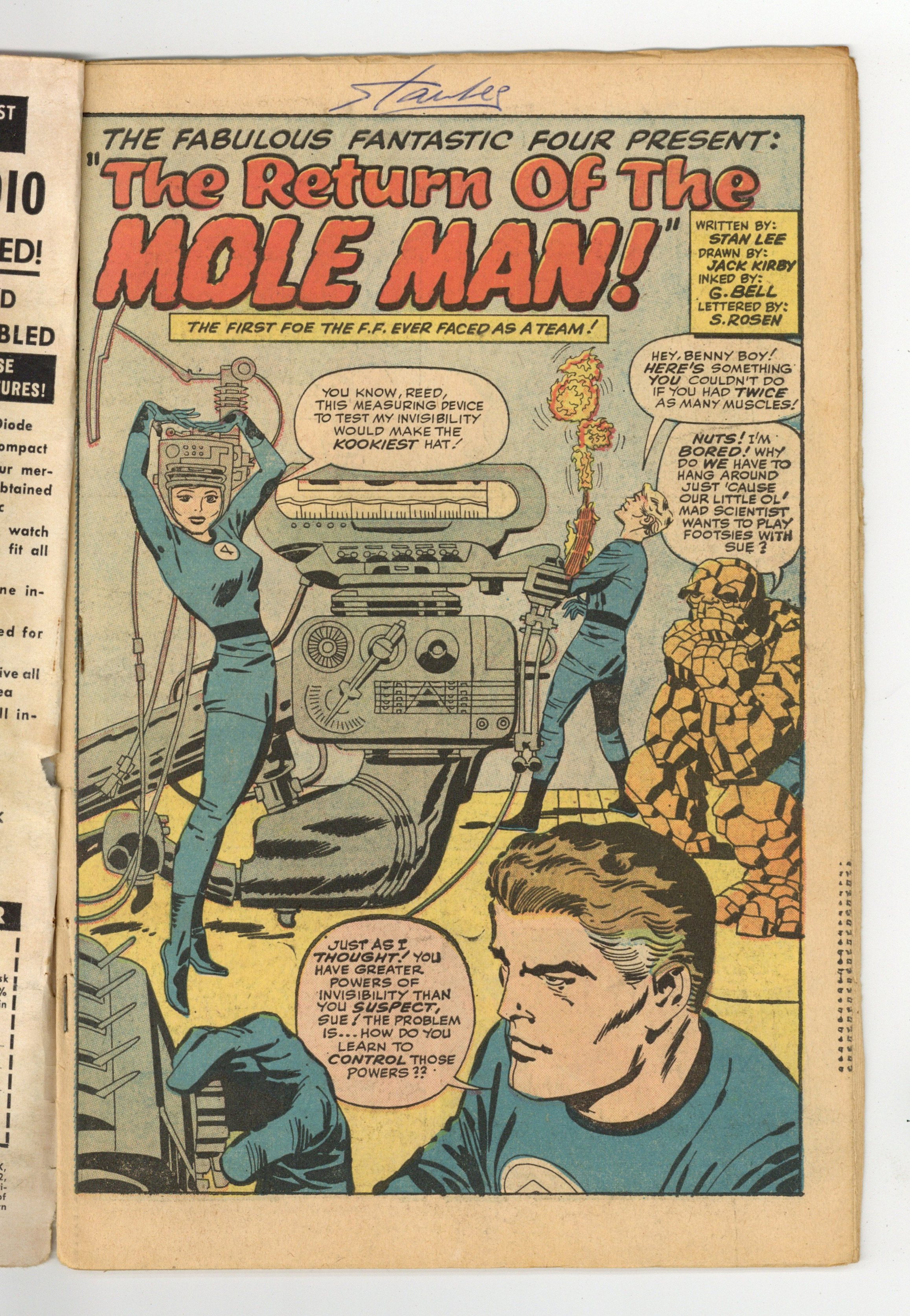 Cover pencils by Jack Kirby, inks by Dick Ayers. The Return of the Mole Man!, script by Stan Lee, pencils by Jack Kirby, inks by George Roussos [as G. Bell]; The Mole Man arranges for the neighbors of the Fantastic Four to complain about their activities so they will be interested when they receive an ad for an island that is for sale; When they visit the island, the Mole Man is waiting for them. Letters to the editor from comics writer Roy Thomas, comics artist Dave Cockrum, Wayne Howard (the comics artist?), and Steve Erickson (the writer?). 36 pgs. $0.12. Cover price $0.12.