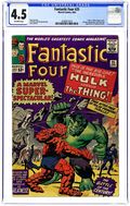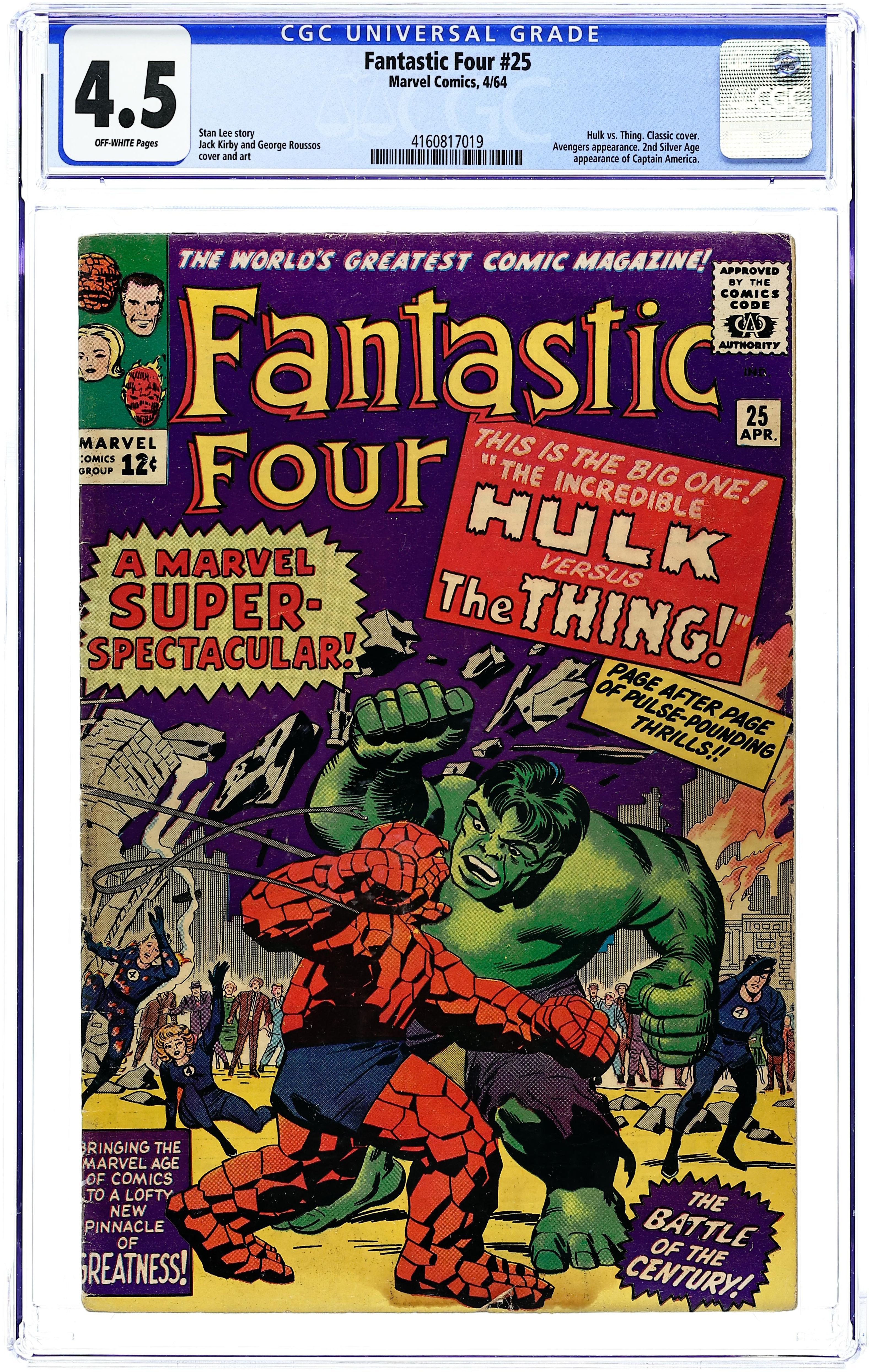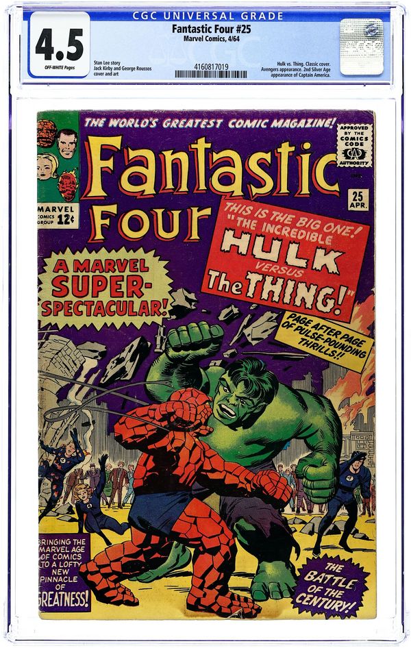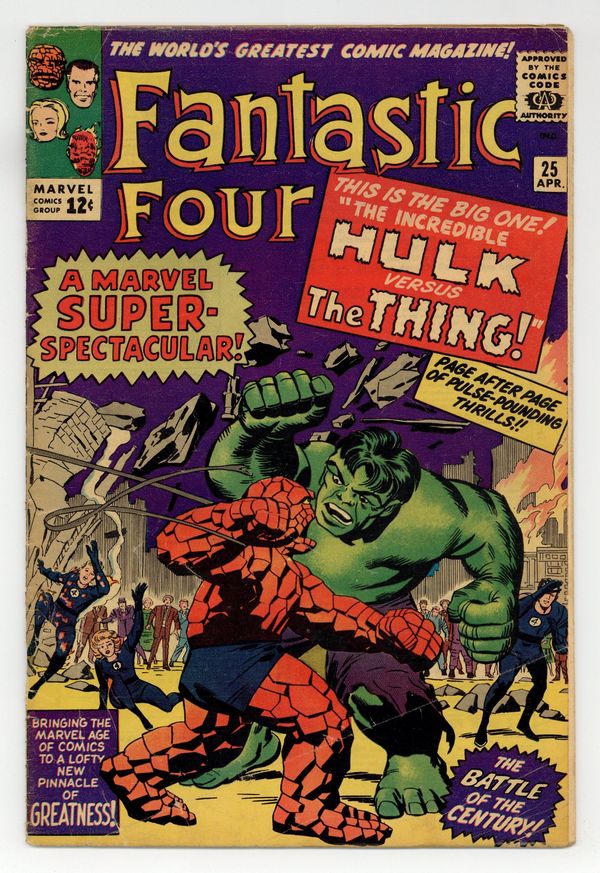 Cover pencils by Jack Kirby, inks by George Roussos. The Hulk Vs. The Thing, script by Stan Lee, pencils by Jack Kirby, inks by George Roussos [as G. Bell]; Hulk understands that Rick Jones has deserted him for the Avengers; He comes back to New York to get his revenge on the Avengers but the Fantastic Four are there to stop him; And the Thing is the only one with a chance to defeat him. Third Avengers cross-over; second Silver Age Captain America appearance. 36 pgs. $0.12. Cover price $0.12.