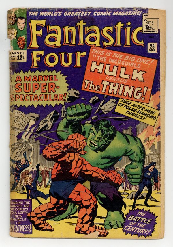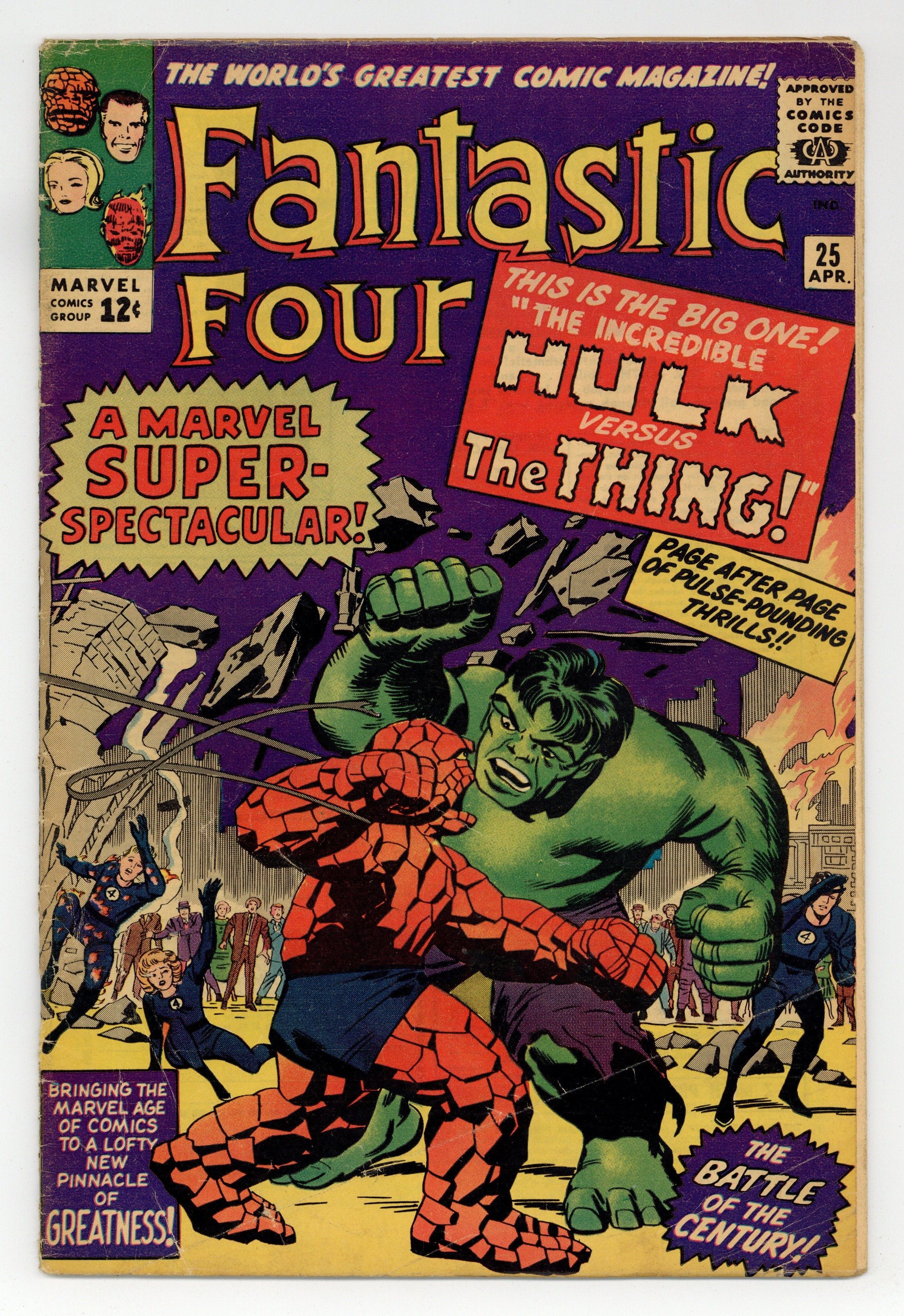 Tags: Fantastic Four$165.00- Near-complete spine split (taped). Cover detached at one staple. Centerfold detached at staples and anchored with tape.