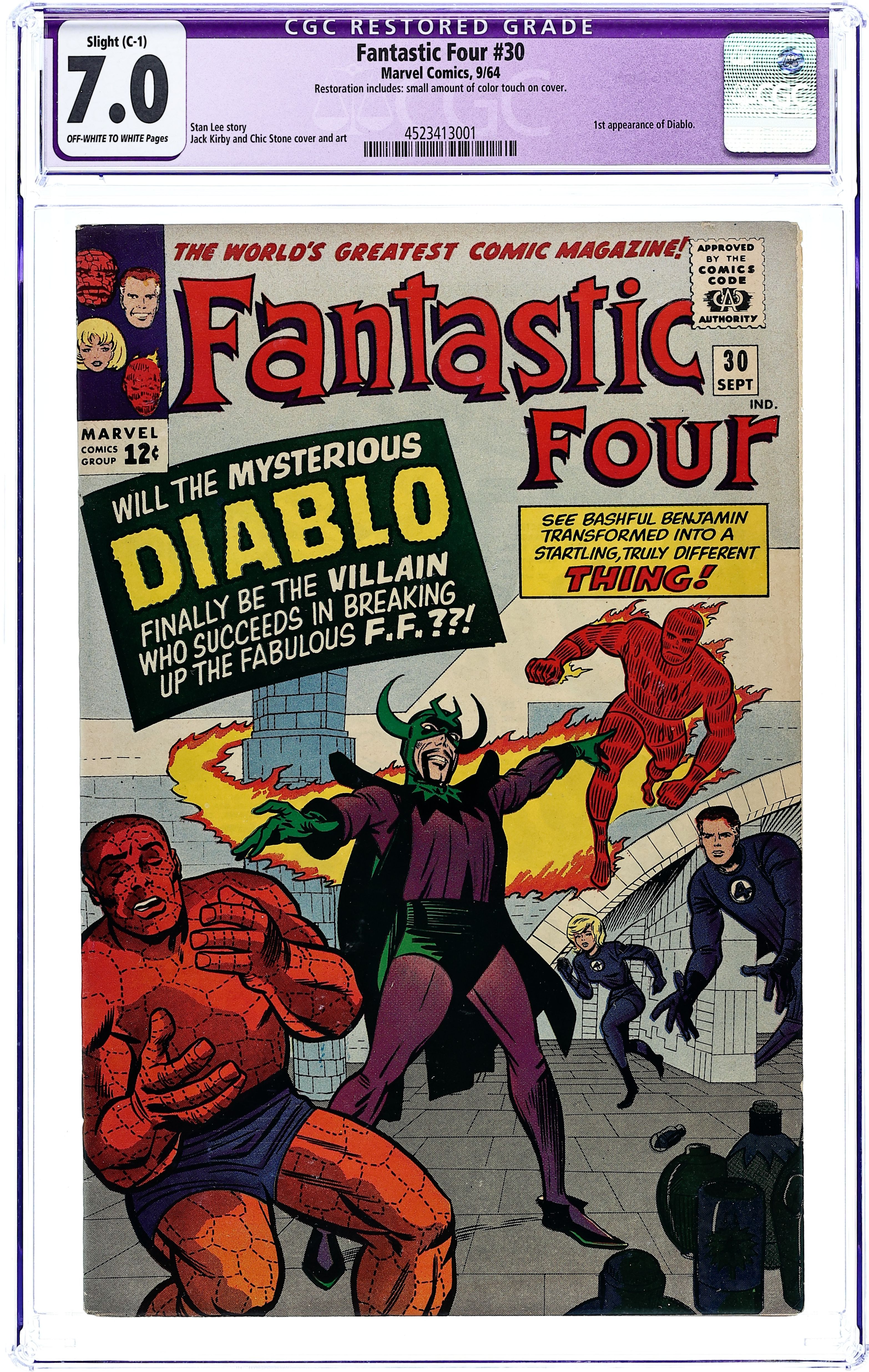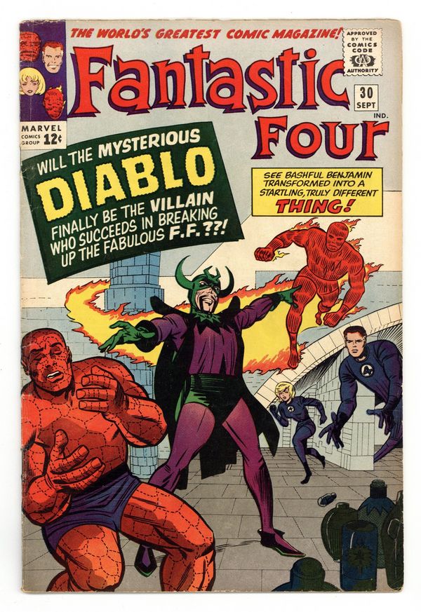 "The Dreaded Diablo!" Written by Stan Lee. Pencils by Jack Kirby. Inks by Chic Stone. Cover pencils by Jack Kirby with inks by Chic Stone. On a vacation in Transylvania, the FF encounter a castle inhabited by Diablo. Note: First Appearance of Diablo. 36 pgs. Cover price $0.12.