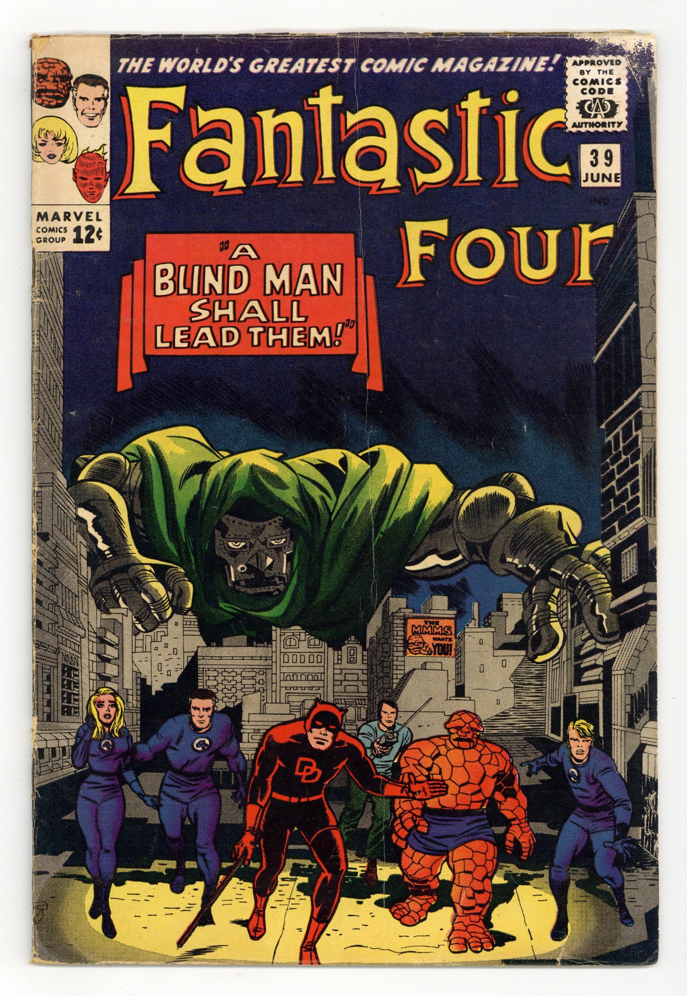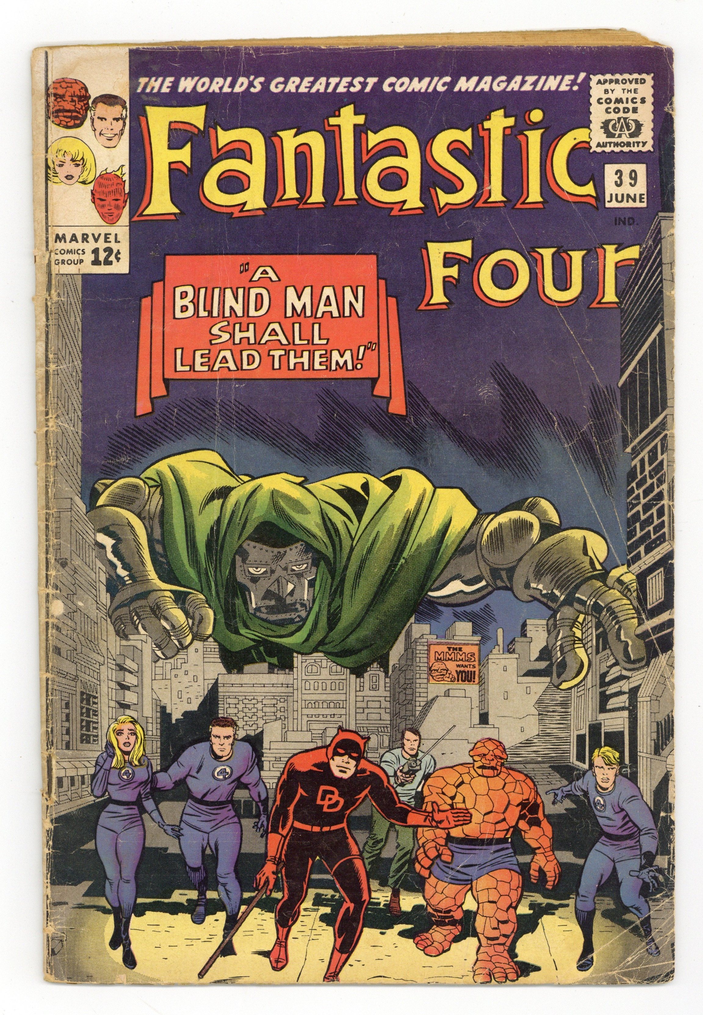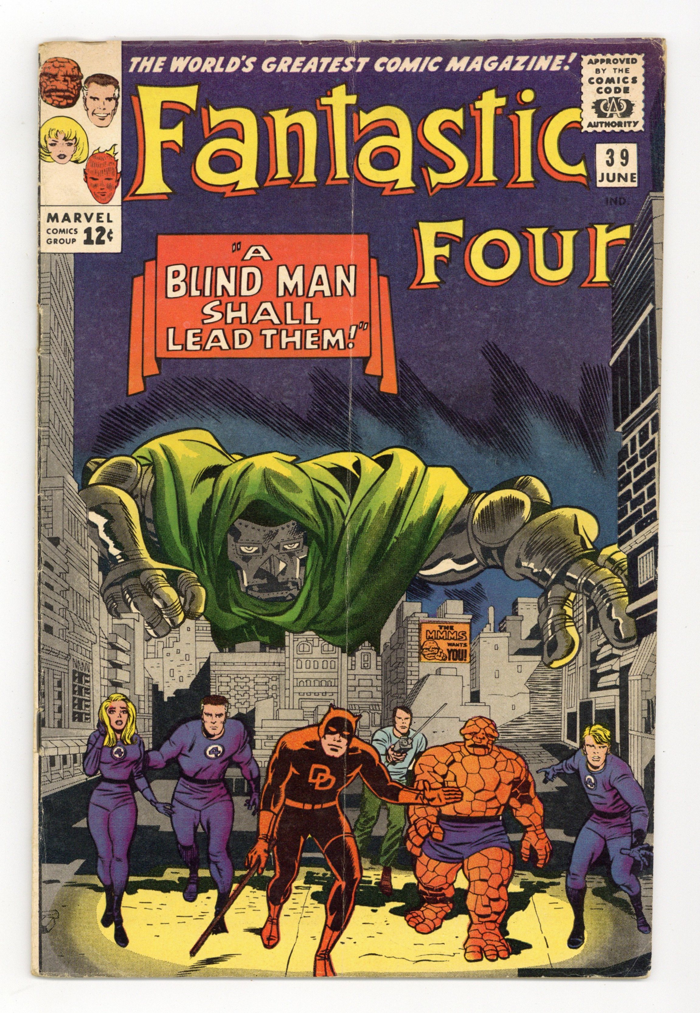 Ends Dec 8 8:17 PM CST Bid History 5 bids Current Bid $22 Your Secret Max Bid If you'd like to bid, please log in or register. Cover pencils by Jack Kirby, inks by Chic Stone and Wally Wood (on Daredevil figure). A Blind Man Shall Lead Them!, script by Stan Lee, pencils by Jack Kirby, inks by Frank Giacoia [as Frank Ray] and Wally Wood (Matt Murdock and Daredevil figures); Reed devises mechanical devices to enable the FF to duplicate their vanished super-powers; Matt Murdoch visits the FF and Dr. Doom attacks; Daredevil assists the FF in battling Doom. Cameos by Medusa, the Wizard, the Sandman, and the Trapster. 36 pgs. $0.12. Cover price $0.12.