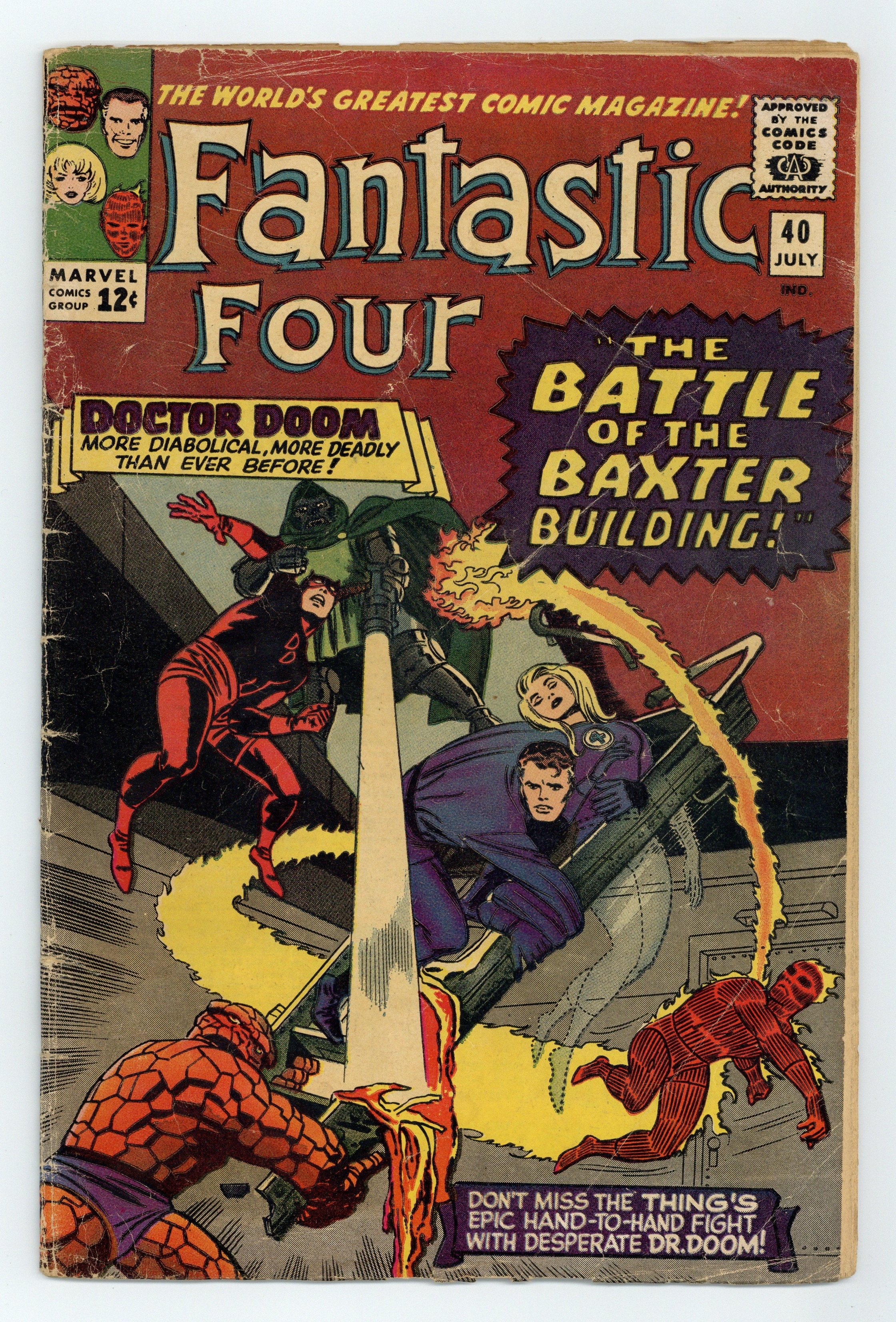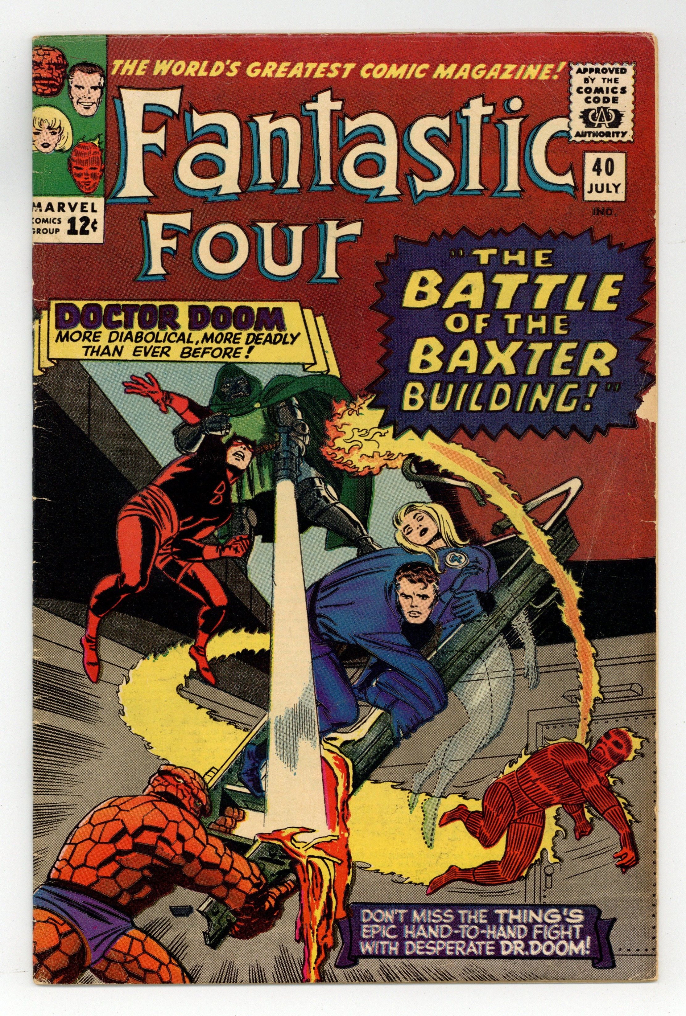 Cover pencils by Jack Kirby, inks by Frank Giacoia. The Battle of the Baxter Building, script by Stan Lee, pencils by Jack Kirby, inks by Vince Colletta; Dr. Doom battles the FF and Daredevil; Reed restores the FF's powers. 36 pgs. $0.12. Cover price $0.12.
