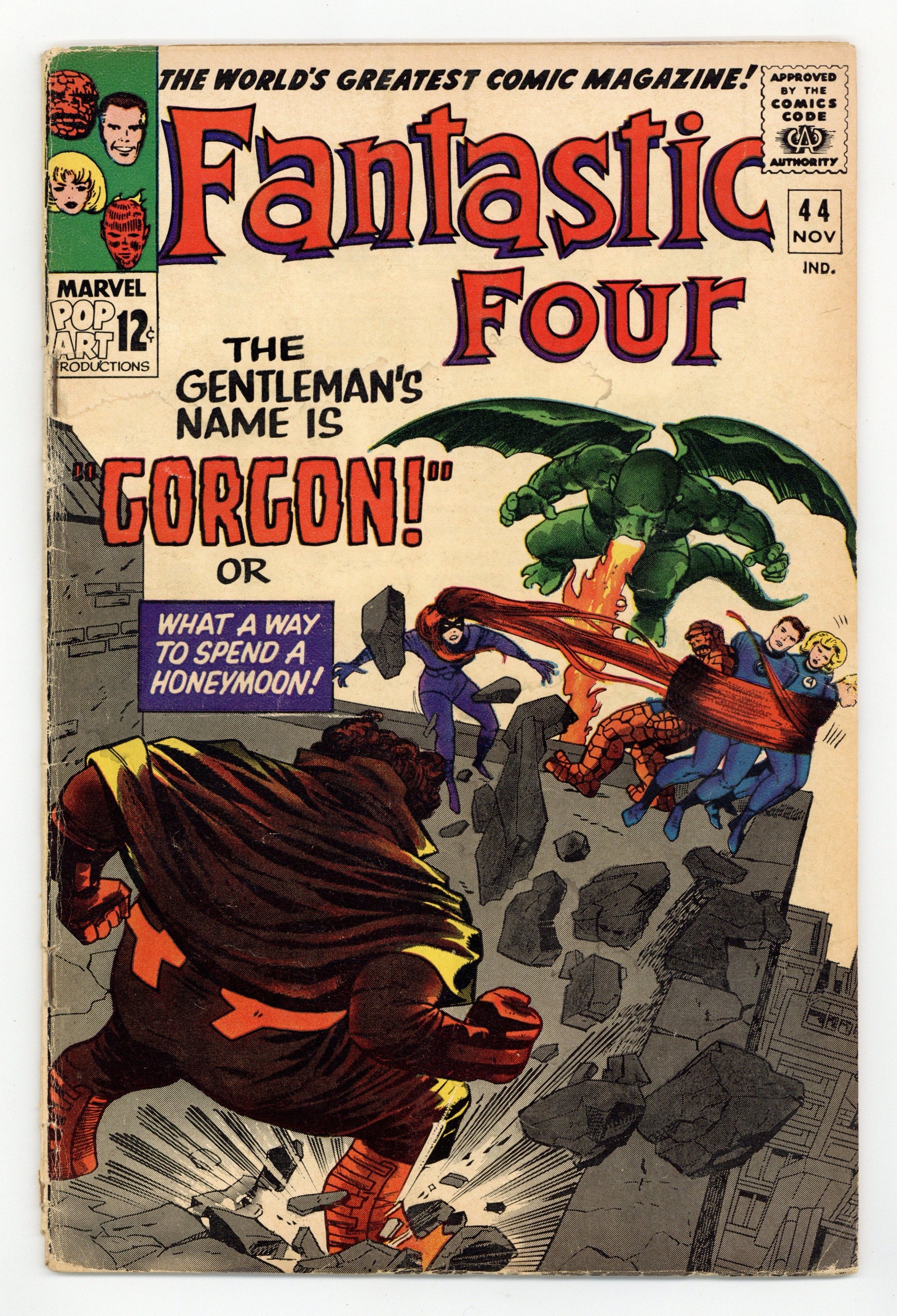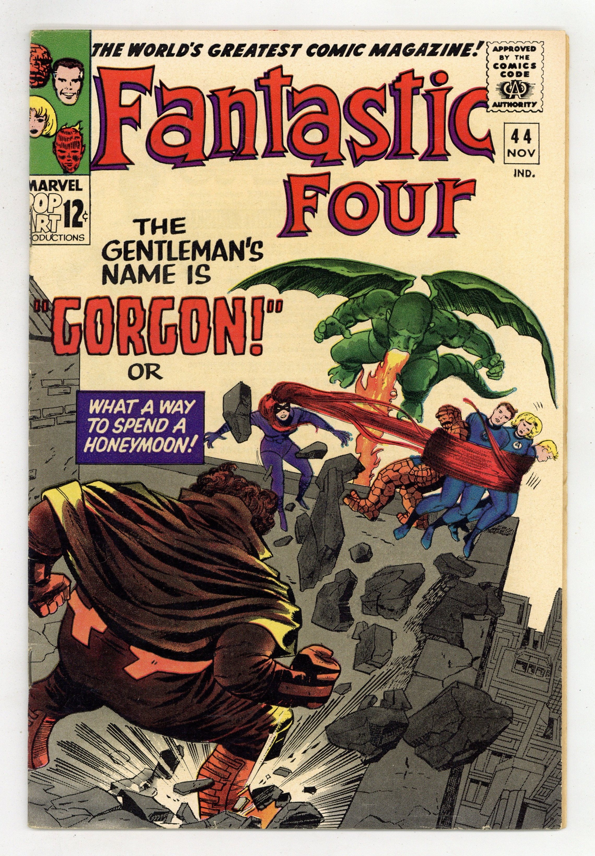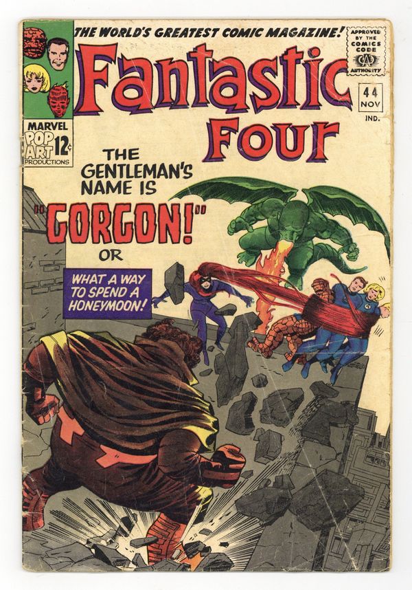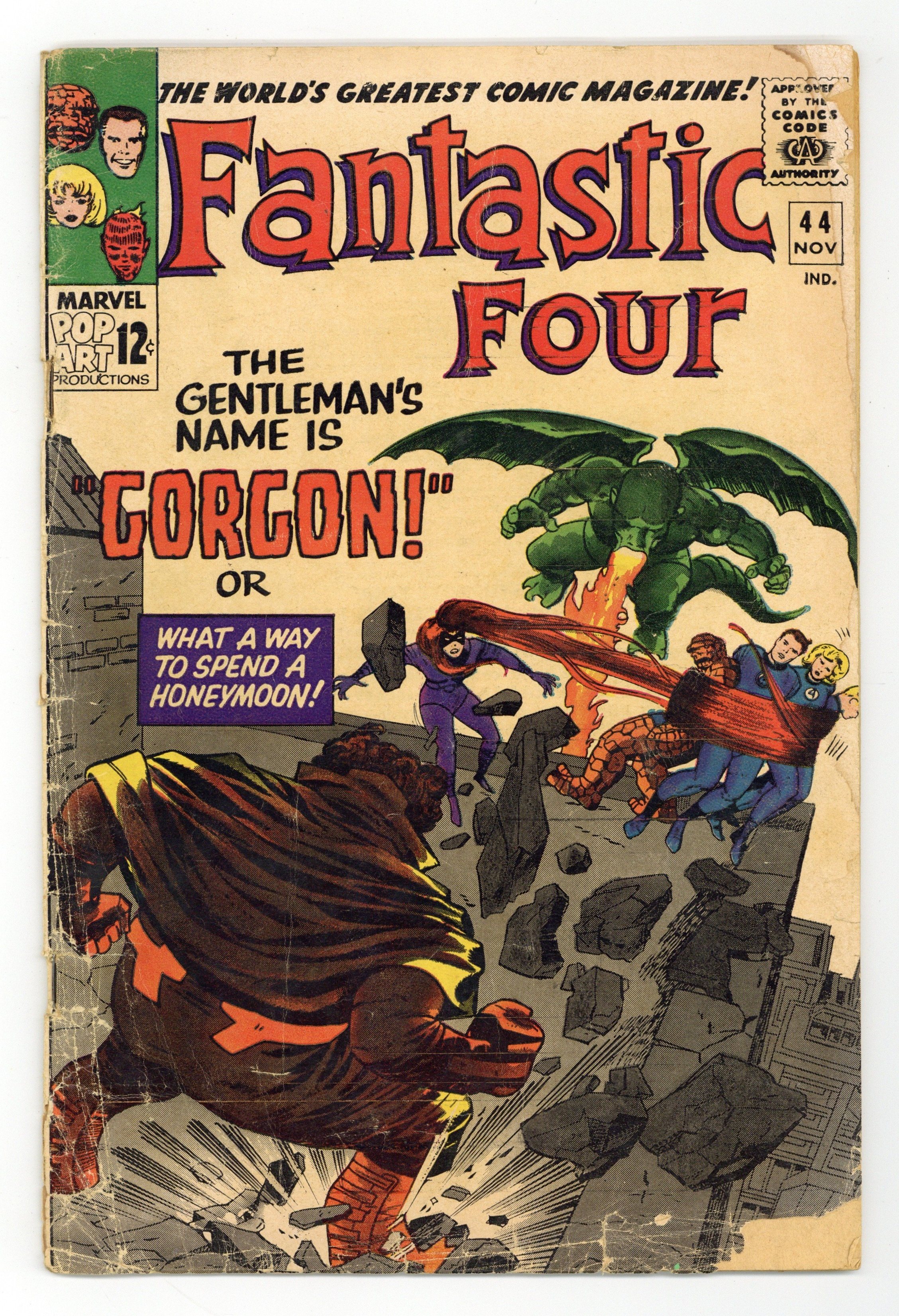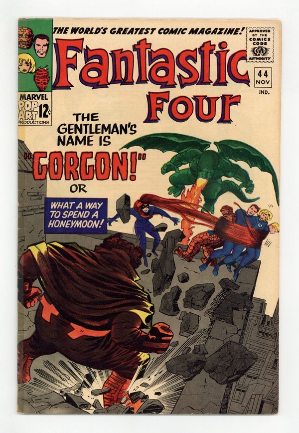Tags: Fantastic Four$22.50Cover pencils by Jack Kirby, inks by Vince Colletta. The Gentleman's Name Is Gorgon! or What a Way to Spend a Honeymoon!, script by Stan Lee, pencils by Jack Kirby, inks by Joe Sinnott; Medusa seeks the FF's help in eluding Gorgon. Dragon Man appearance. Letter to the editor from Dave Cockrum. 36 pgs. $0.12. Cover price $0.12.