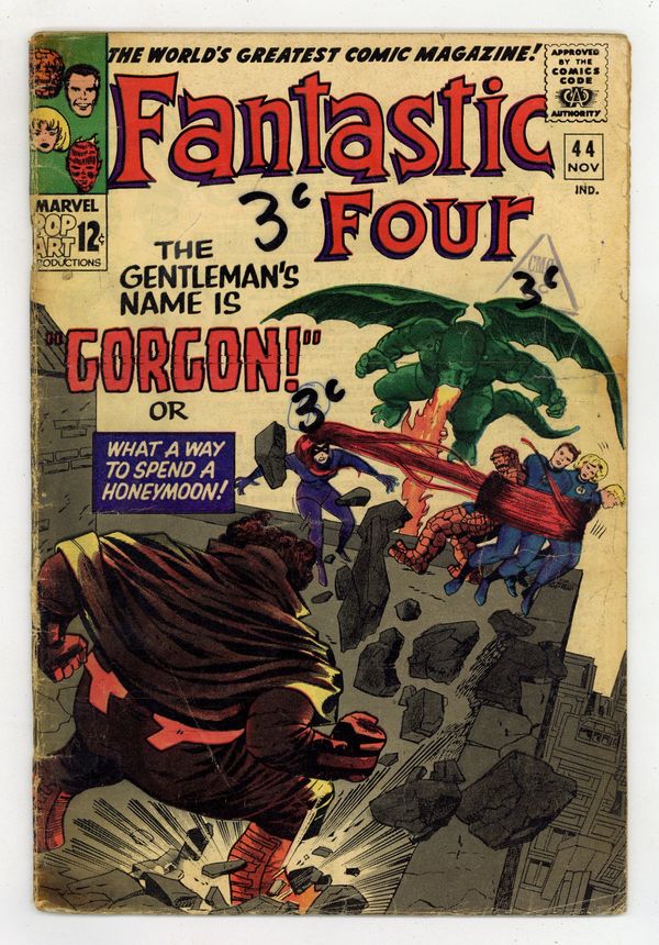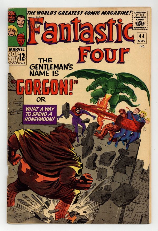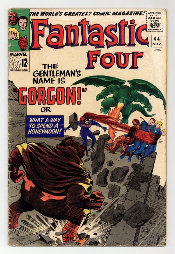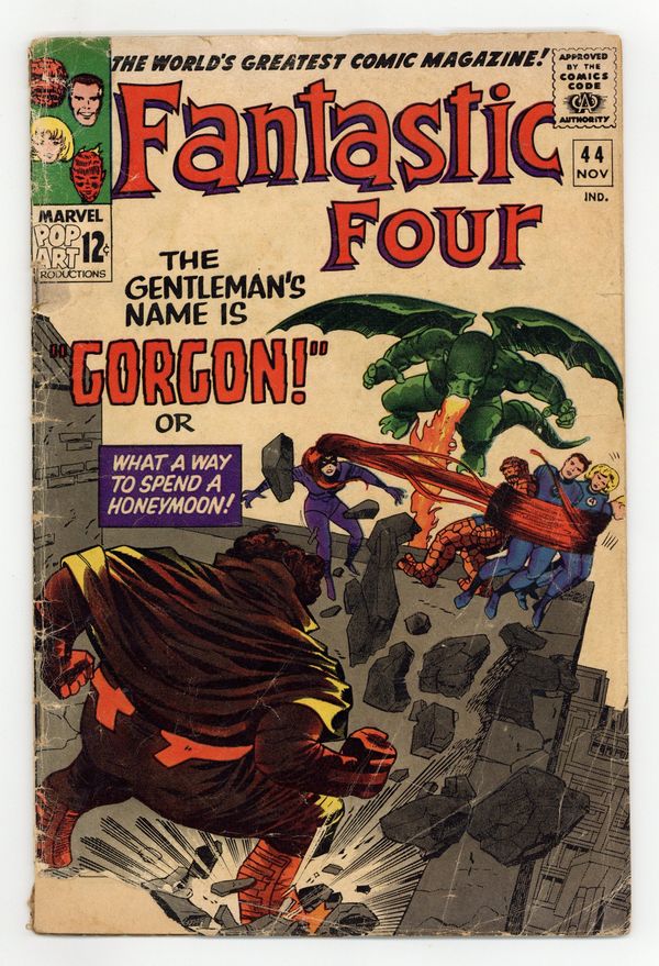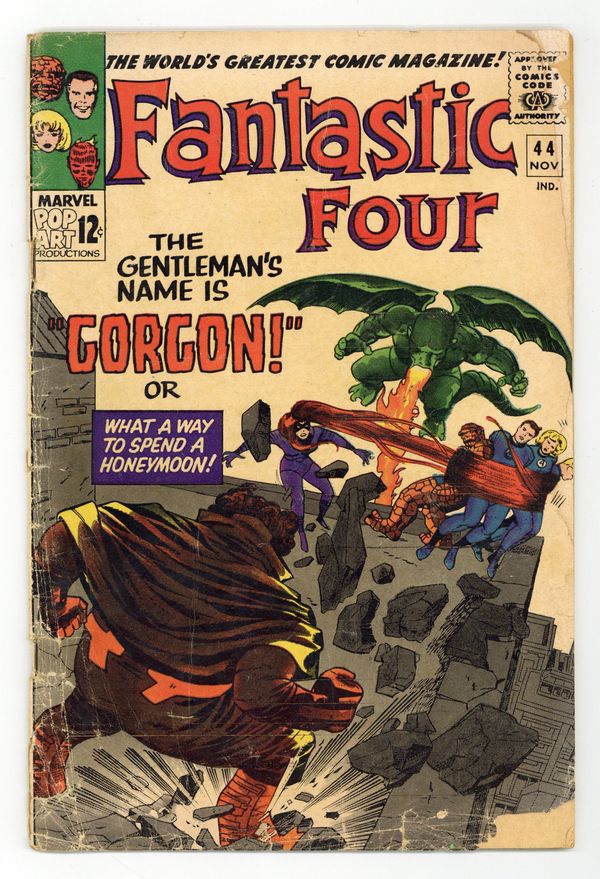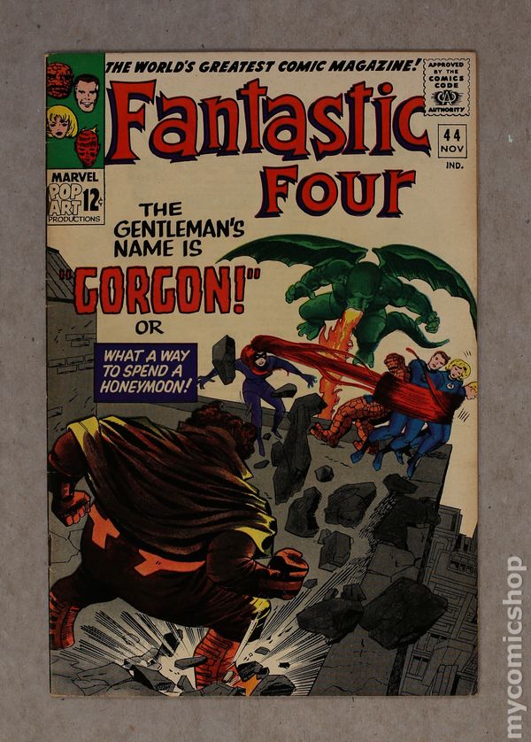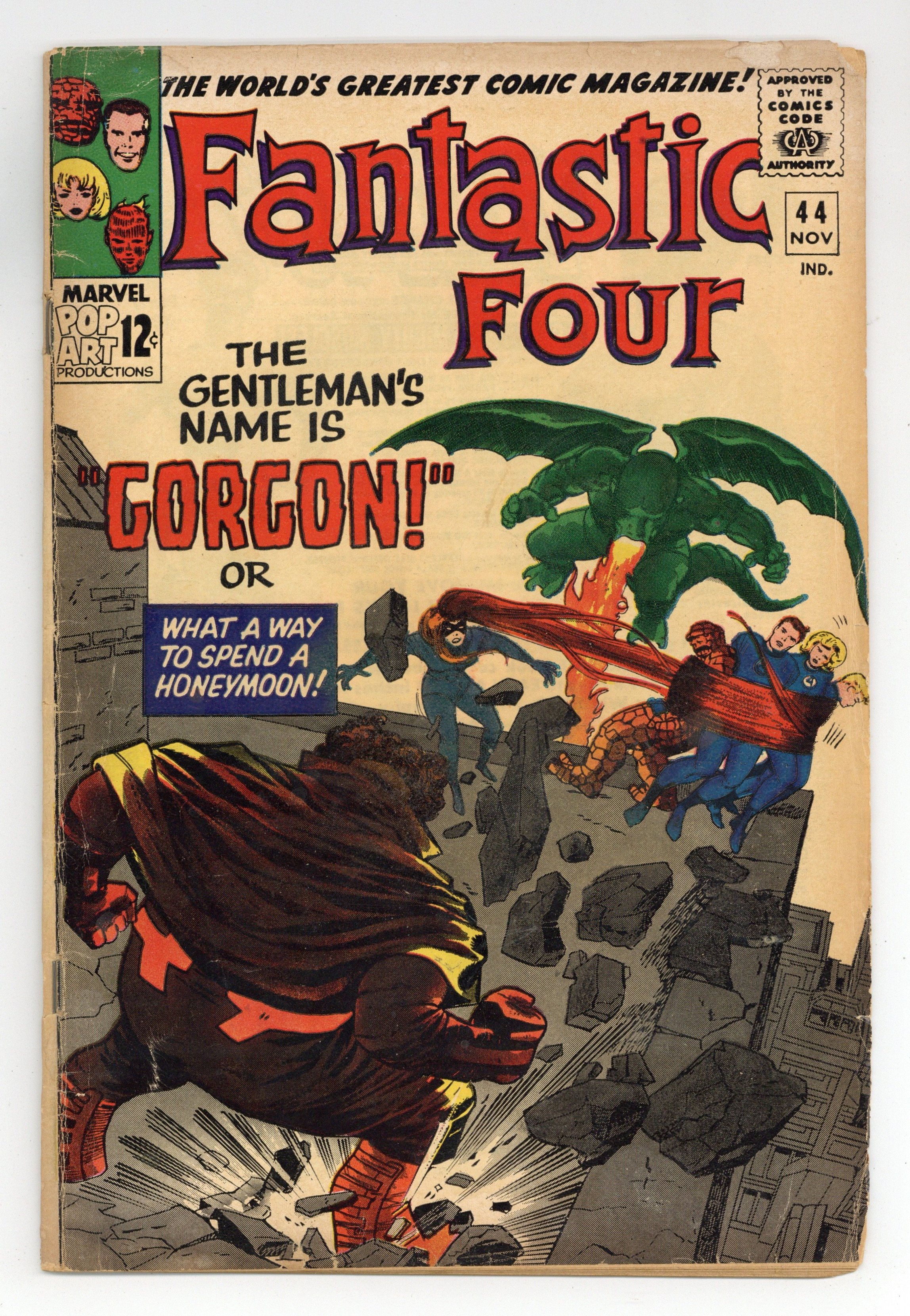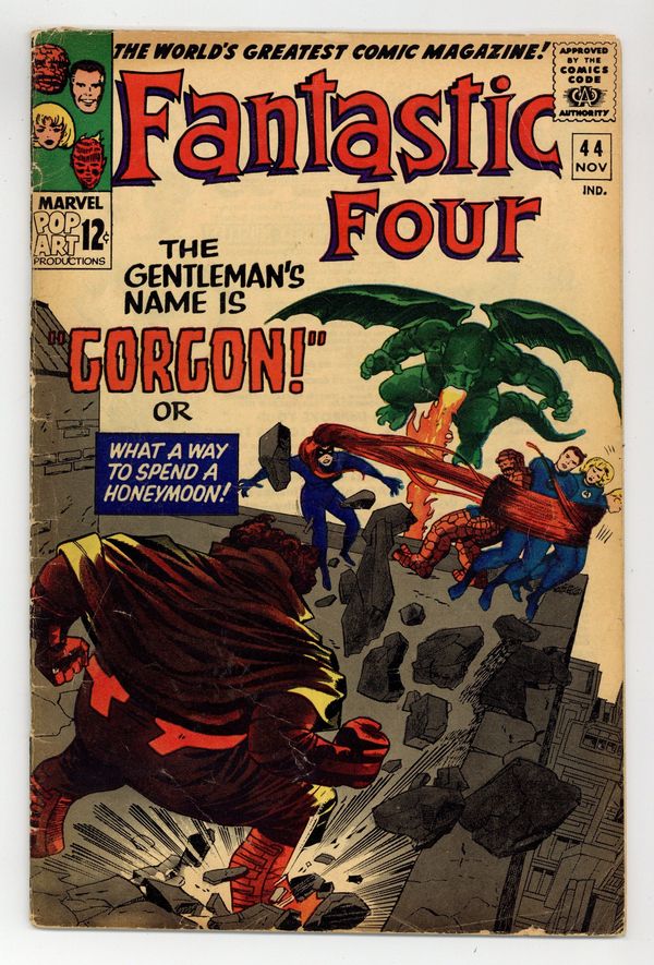 Tags: Fantastic Four$22.50Cover pencils by Jack Kirby, inks by Vince Colletta. The Gentleman's Name Is Gorgon! or What a Way to Spend a Honeymoon!, script by Stan Lee, pencils by Jack Kirby, inks by Joe Sinnott; Medusa seeks the FF's help in eluding Gorgon. Dragon Man appearance. Letter to the editor from Dave Cockrum. 36 pgs. $0.12. Cover price $0.12.