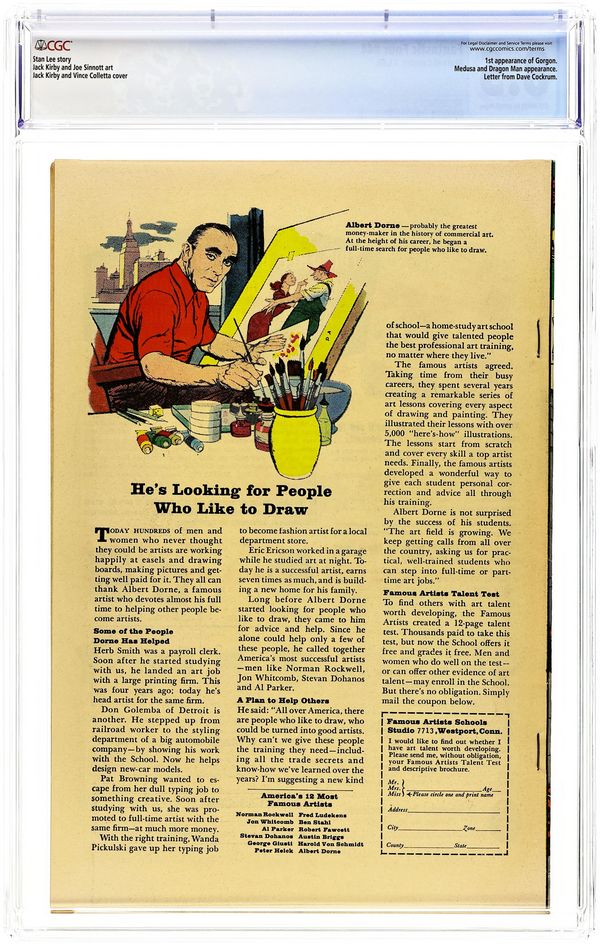 Cover pencils by Jack Kirby, inks by Vince Colletta. The Gentleman's Name Is Gorgon! or What a Way to Spend a Honeymoon!, script by Stan Lee, pencils by Jack Kirby, inks by Joe Sinnott; Medusa seeks the FF's help in eluding Gorgon. Dragon Man appearance. Letter to the editor from Dave Cockrum. 36 pgs. $0.12. Cover price $0.12.