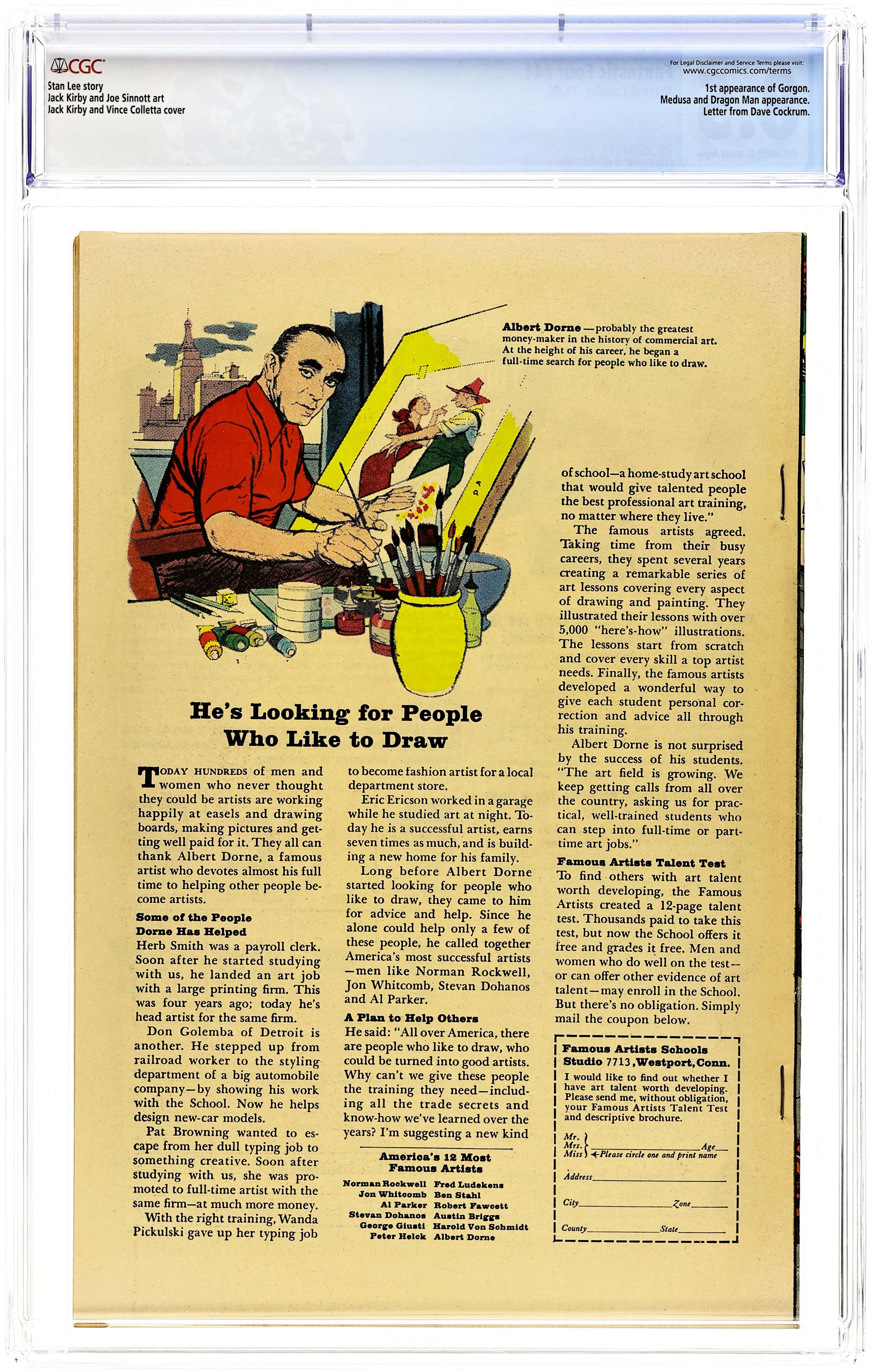Tags: Fantastic Four$53.00Cover pencils by Jack Kirby, inks by Vince Colletta. The Gentleman's Name Is Gorgon! or What a Way to Spend a Honeymoon!, script by Stan Lee, pencils by Jack Kirby, inks by Joe Sinnott; Medusa seeks the FF's help in eluding Gorgon. Dragon Man appearance. Letter to the editor from Dave Cockrum. 36 pgs. $0.12. Cover price $0.12.