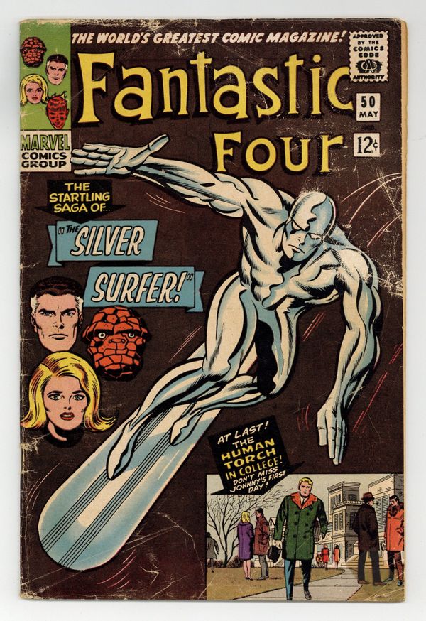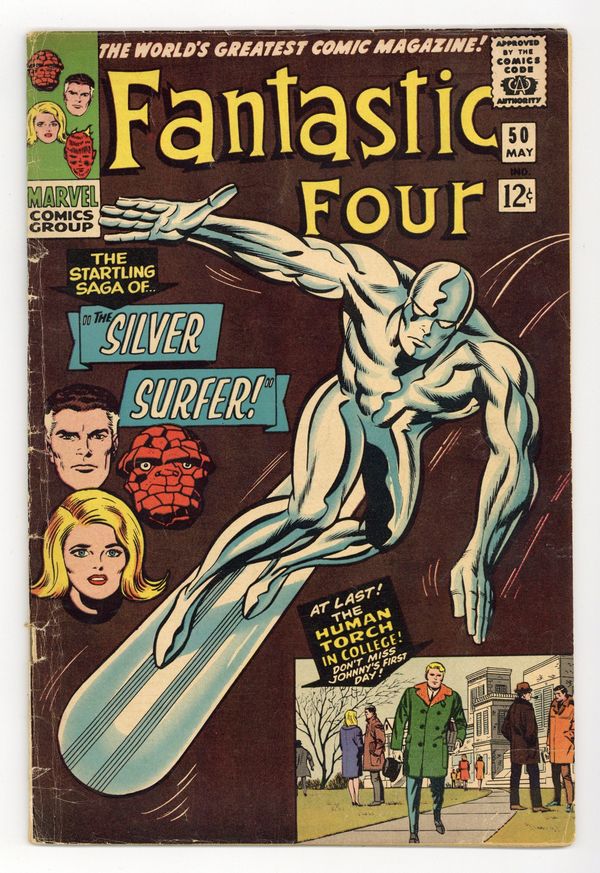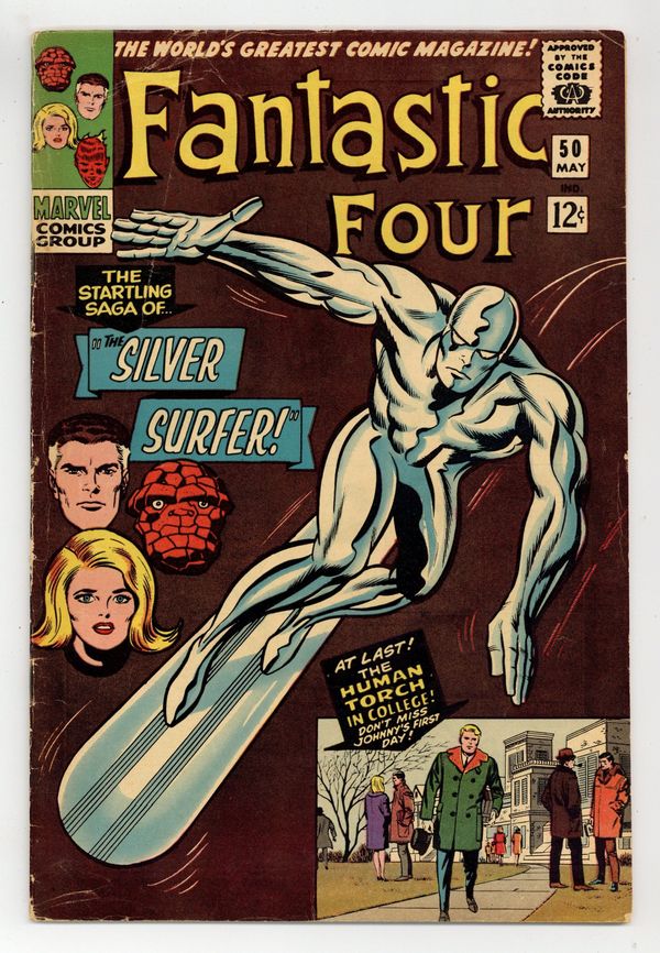 Starts Jan 3 Cover pencils by Jack Kirby, inks by Joe Sinnott. Galactus battles the Silver Surfer in the conclusion of the Galactus Trilogy, The Startling Saga of the Silver Surfer!, script by Stan Lee, pencils by Jack Kirby, inks by Joe Sinnott; With the aid of the Silver Surfer, the Fantastic Four force Galactus to leave Earth; Johnny Storm begins to attend Metro College and meets Wyatt Wingfoot. Watcher and Inhumans appearances. First appearance of Wyatt Wingfoot. Letter to the editor from comics writer Gerry Conway. 36 pgs. $0.12. Cover price $0.12.