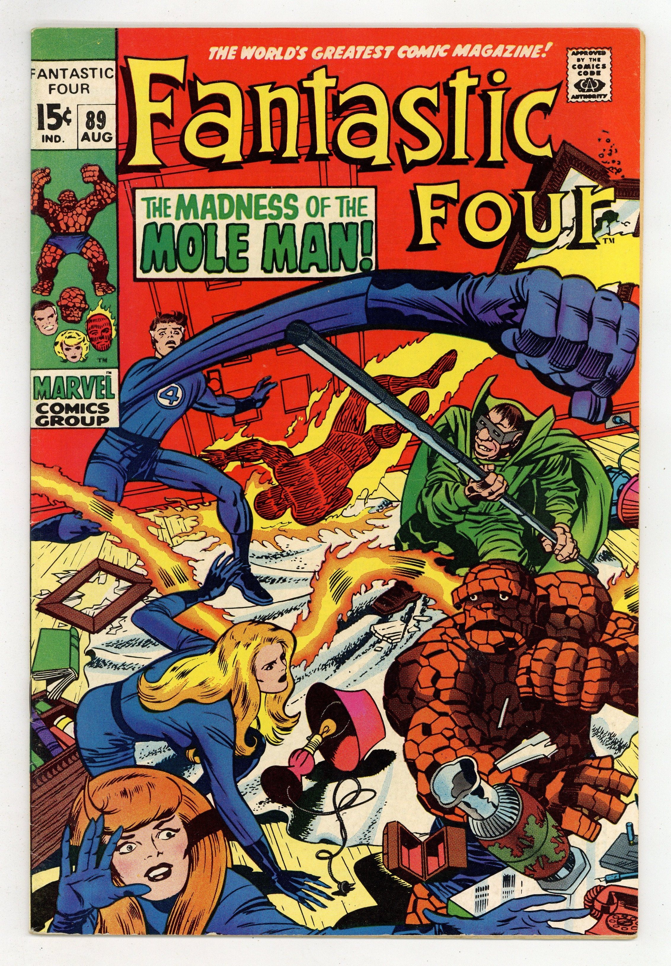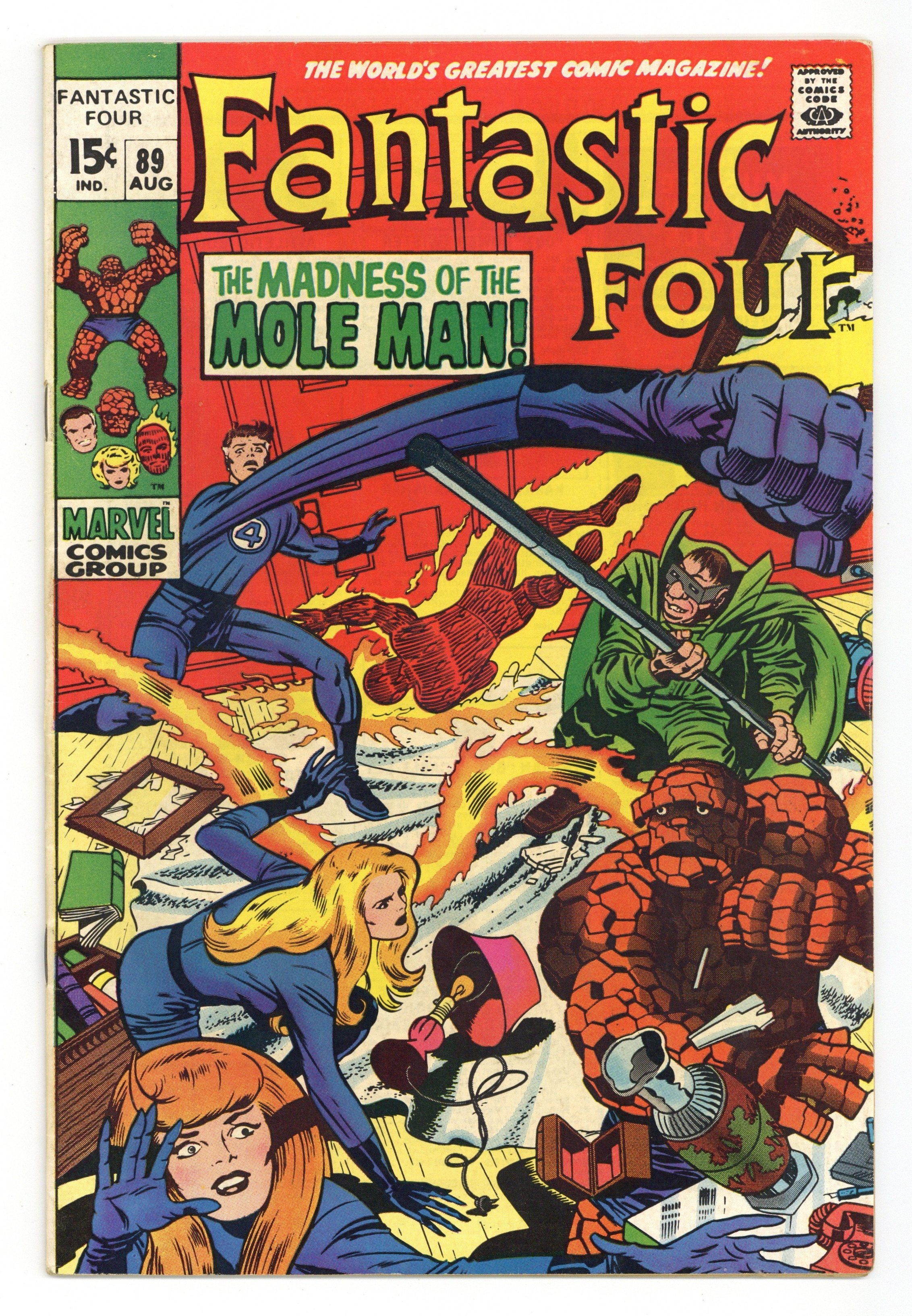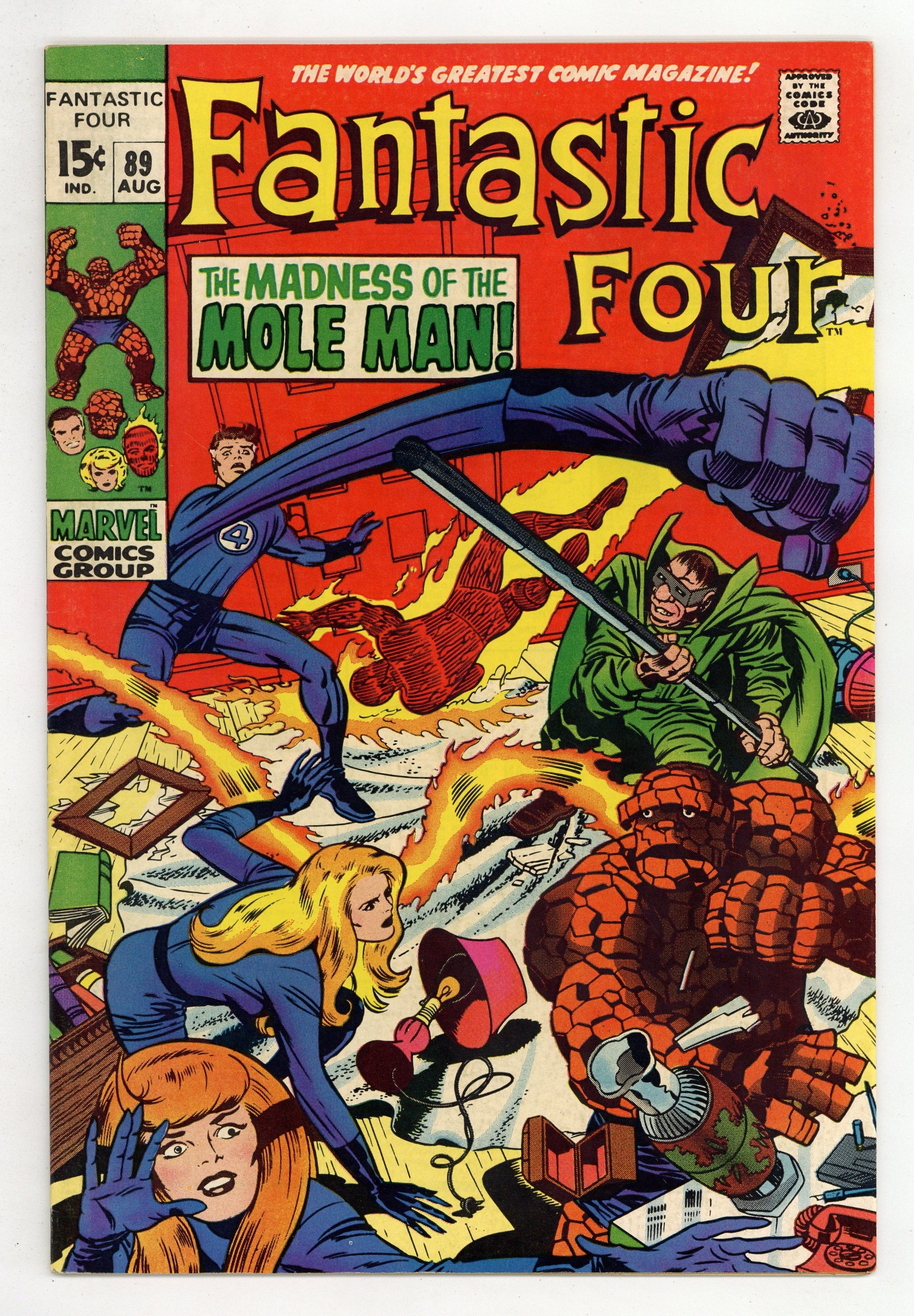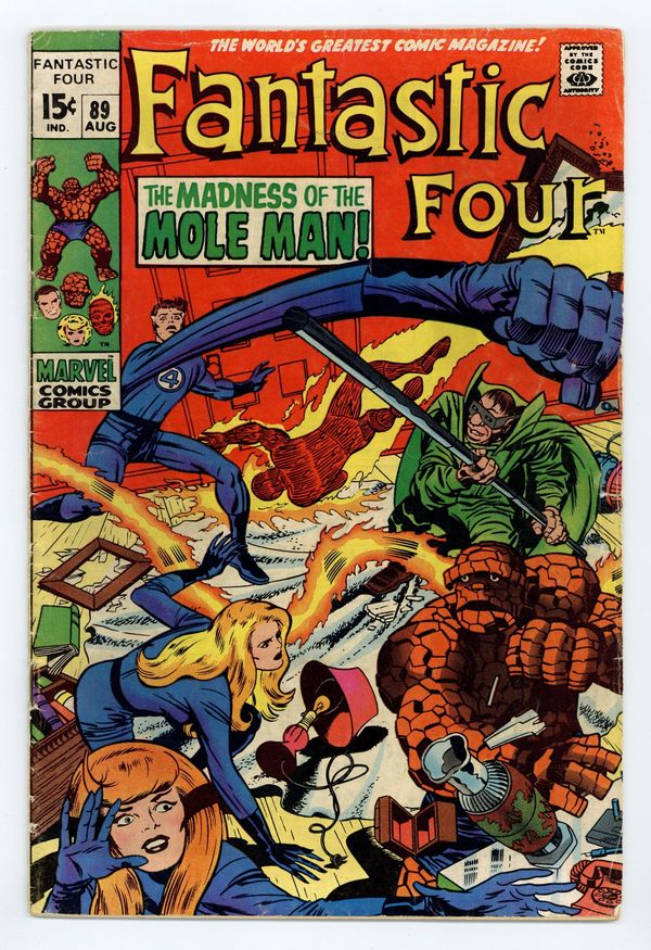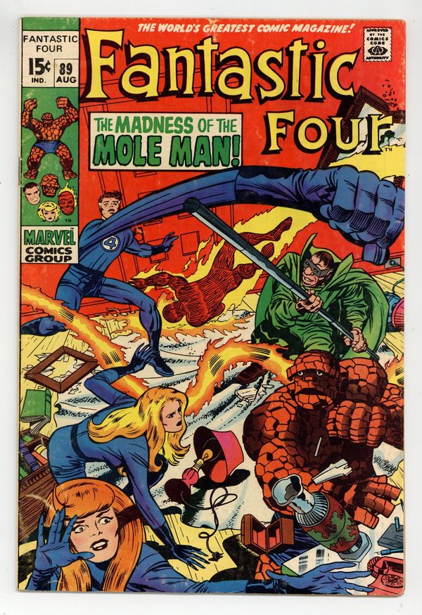 "The Madness of the Mole Man!" Script by Stan Lee. Pencils by Jack Kirby. Inks by Joe Sinnott. Cover by Jack Kirby and Joe Sinnott. The Fantastic Four are blind! And in for the fight of their lives against the Mole Man! The subterranean super-villain corners the FF in his high-tech house and begins picking them off one by one! How can the heroes fight back without their sight? Simple…just listen with their ears! By focusing on the Mole Man's voice; Reed, Ben, and Sue lash out at their long-time foe! When the Invisible Girl breaks through and lands a shot, an opportunity arises for the Human Torch to end the battle! Can Johnny Storm turn up the heat on the Mole Man and bring down the house? Cameo appearance by the Slaver Skrull. First 15¢ issue. 33 pages Cover price $0.15.