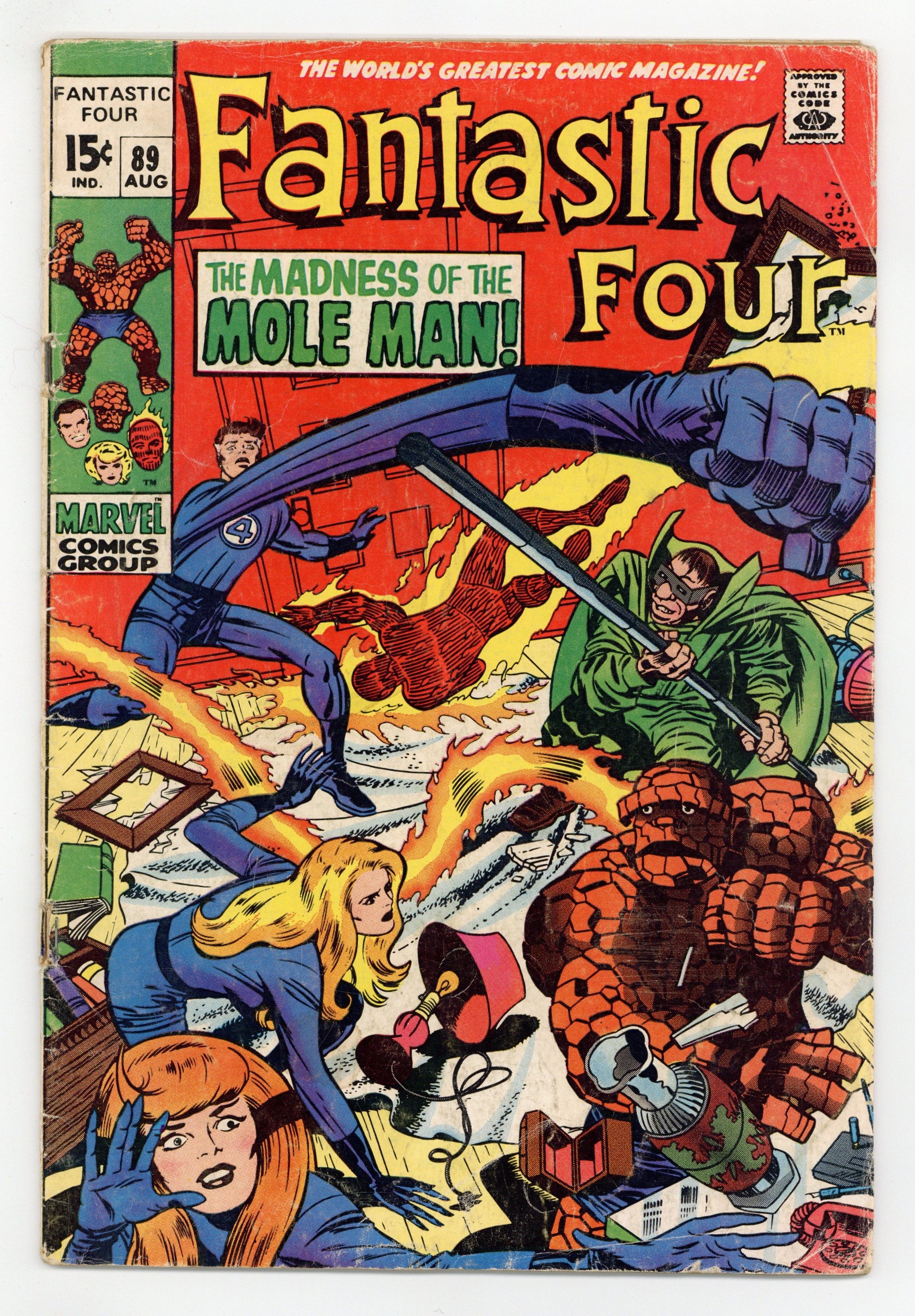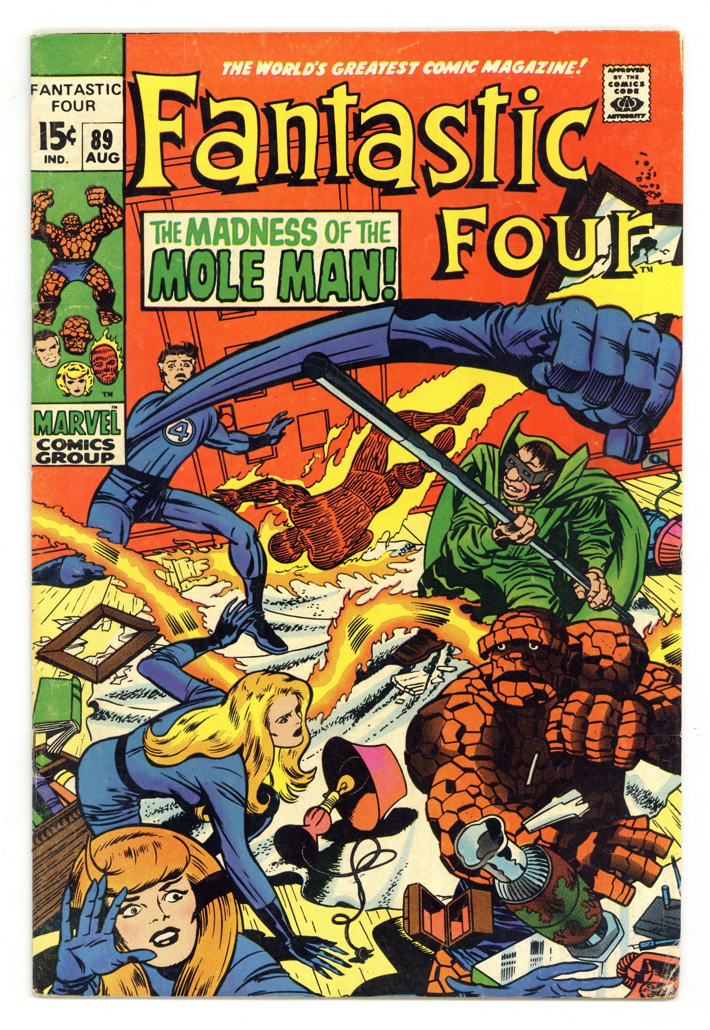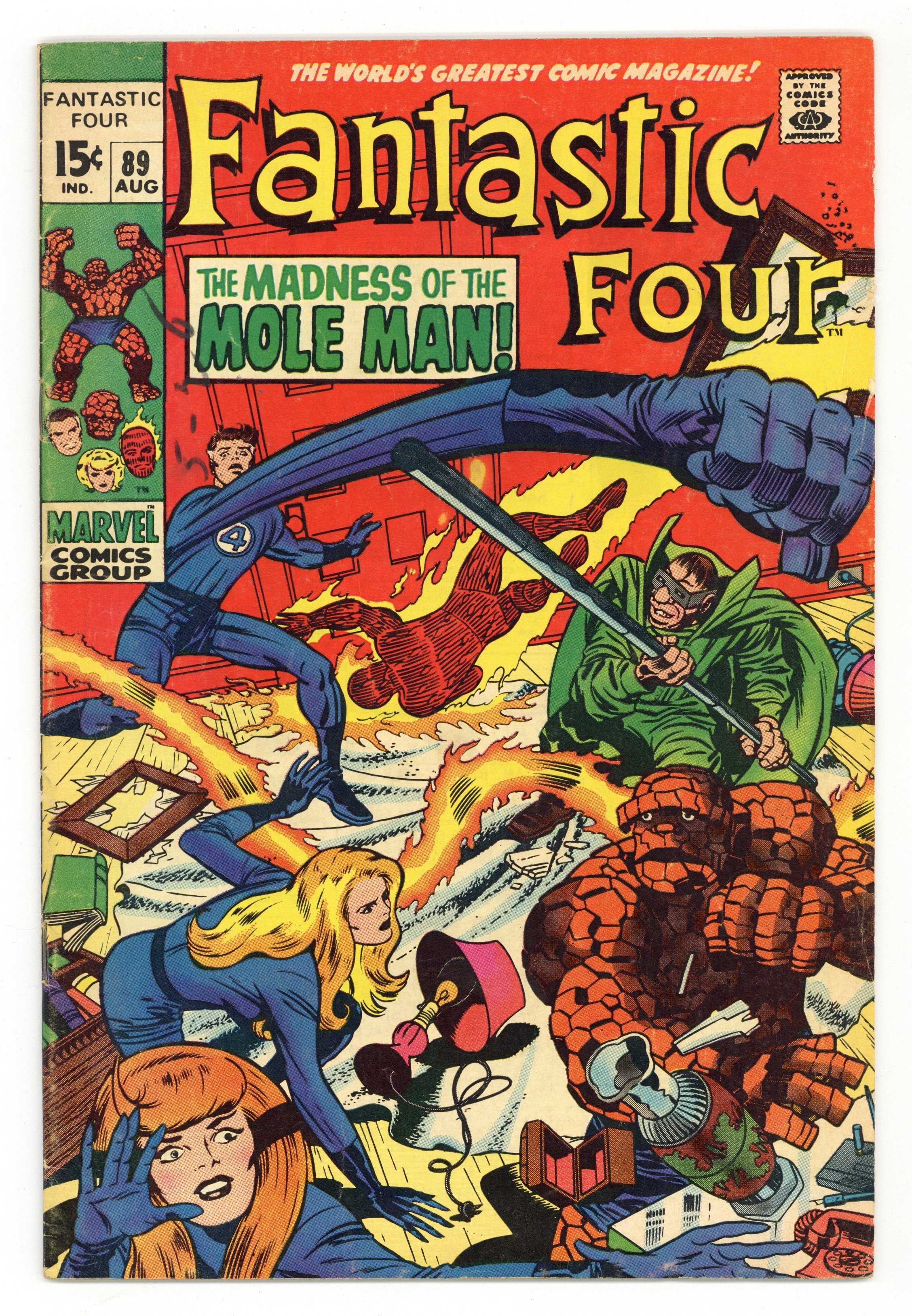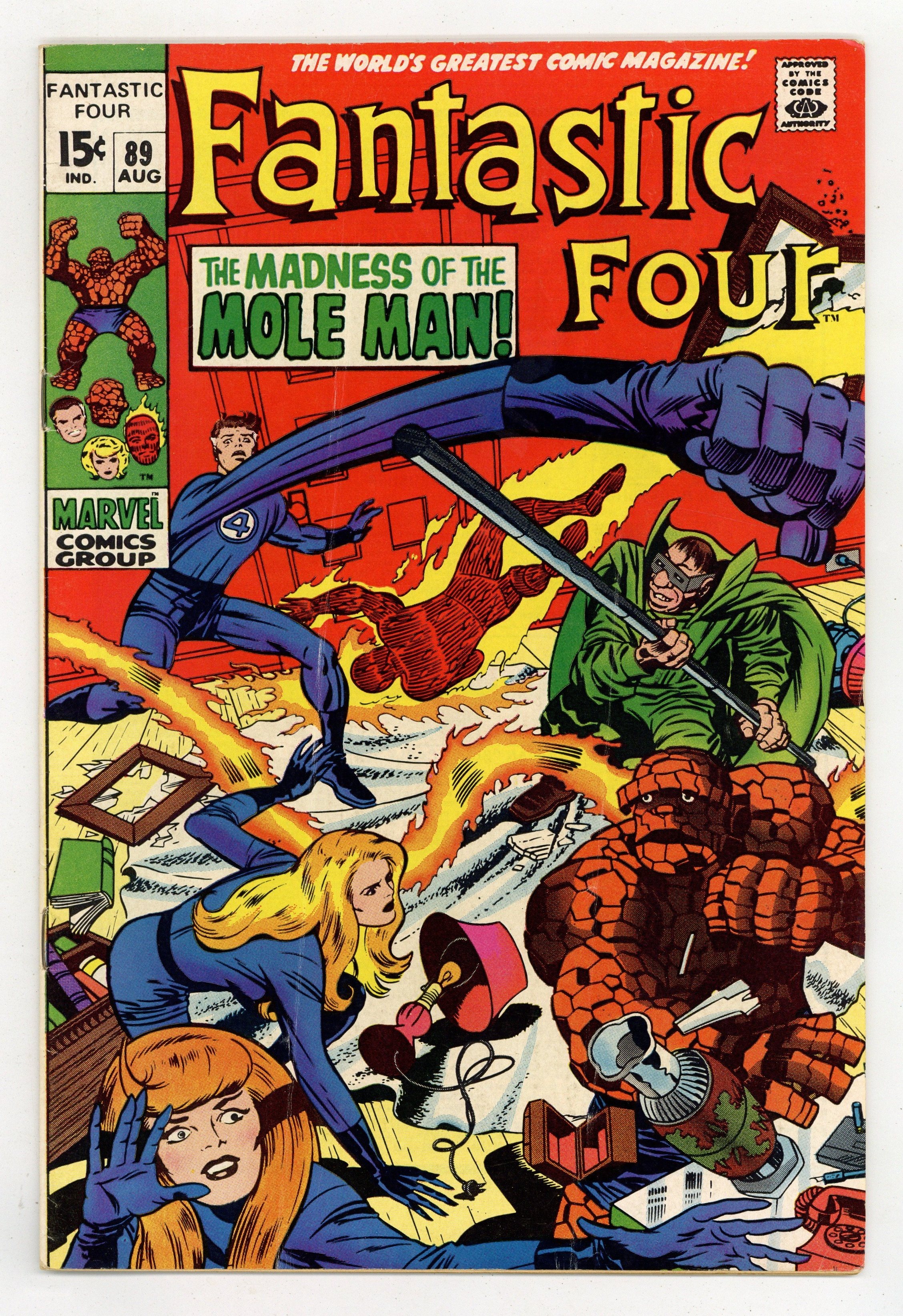 "The Madness of the Mole Man!" Script by Stan Lee. Pencils by Jack Kirby. Inks by Joe Sinnott. Cover by Jack Kirby and Joe Sinnott. The Fantastic Four are blind! And in for the fight of their lives against the Mole Man! The subterranean super-villain corners the FF in his high-tech house and begins picking them off one by one! How can the heroes fight back without their sight? Simple…just listen with their ears! By focusing on the Mole Man's voice; Reed, Ben, and Sue lash out at their long-time foe! When the Invisible Girl breaks through and lands a shot, an opportunity arises for the Human Torch to end the battle! Can Johnny Storm turn up the heat on the Mole Man and bring down the house? Cameo appearance by the Slaver Skrull. First 15¢ issue. 33 pages Cover price $0.15.