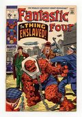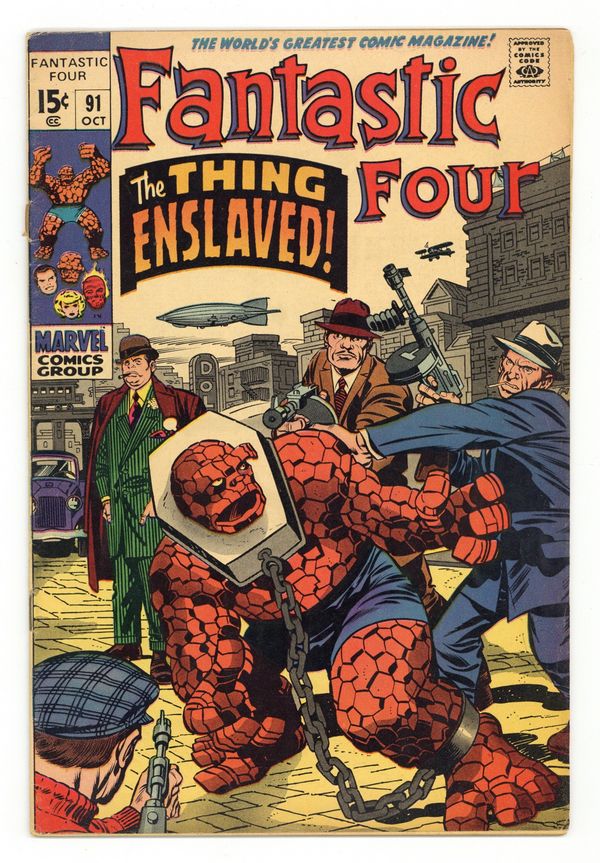 "The Thing Enslaved!" Part 2 of 4. Script by Stan Lee. Pencils by Jack Kirby. Inks by Joe Sinnott. Cover by Jack Kirby and Joe Sinnott. Millions of miles from Earth, Ben Grimm is a prisoner of the Skrulls! What diabolical destiny do the Skrulls have planned for Aunt Petunia's nephew? How about turning the Thing into a modern day Roman gladiator! But before the Thing takes his turn in the ring, he's sold into slavery to a Roaring 20's gangster! What in the world, make that what in the galaxy is going on?! Is the strongest member of the Fantastic Four lost in both time and (outer) space? First appearance of Torgo. Cameo appearances by Alicia Masters, Crystal, and Franklin. (Note: The letters page includes a letter from comics writer Don McGregor.) 36 pages Cover price $0.15.